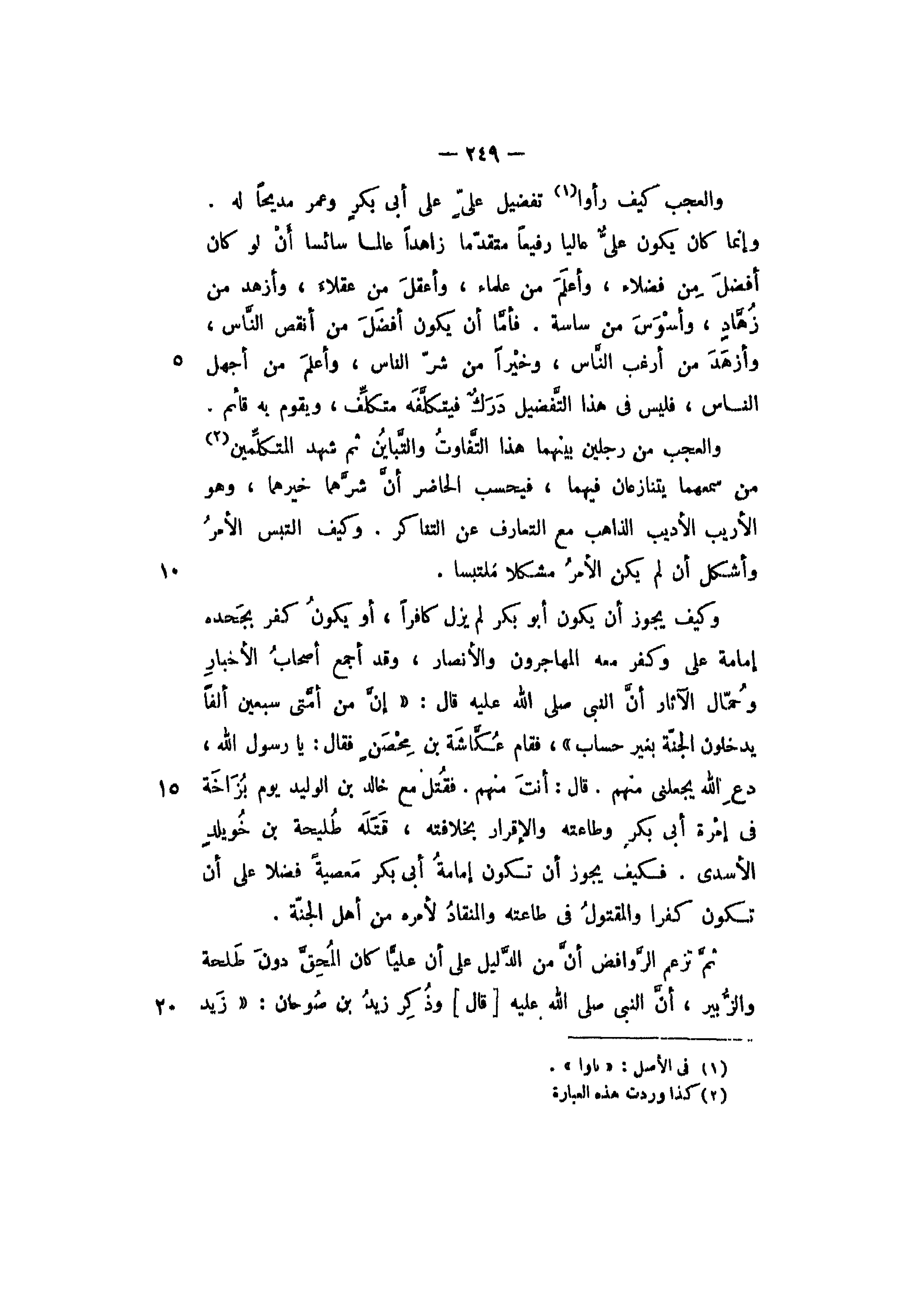 وكيف يجوز أن يكون أبو بكر لم يزل كافرا، أو يكون كفر بجحده إمامة علي وكفر معه المهاجرون والأنصار، وقد أجمع أصحاب الأخبار وحمال الآثار أن النبي - صلى الله عليه - قال: "إن من أمتي سبعين ألفا يدخلون الجنة بغير حساب" فقام عكاشة بن محصن فقال: يا رسول الله، ادع الله يجعلني منهم. قال: أنت منهم. فقتل مع خالد بن الوليد يوم بزاخة في إمرة أبي بكر وطاعته والإقرار بخلافته، قتله طليحة بن خويلد الأسدي. فكيف يجوز أن تكون إمامة أبي بكر معصية فضلا على أن تكون كفرا والمقتول في طاعته والمنقاد لأمره من أهل الجنة.