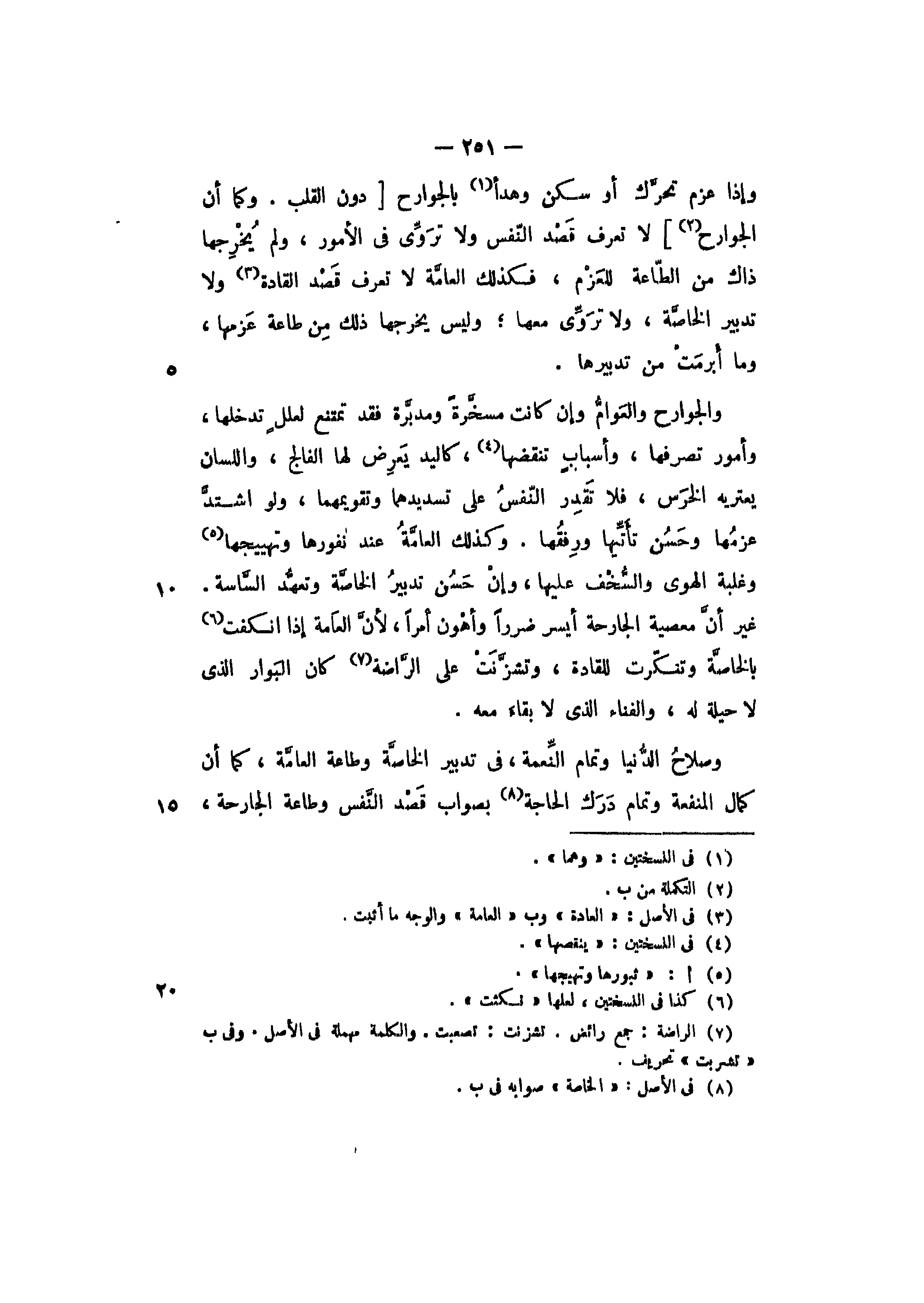 والجوارح والعوام وإن كانت مسخرة ومدبرة فقد تمتنع لعلل تدخلها، وأمور تصرفها، وأسباب تنقضها، كاليد يعرض لها الفالج، واللسان يعتريه الخرس، فلا تقدر النفس على تسديدهما وتقويمهما، ولو اشتد عزمها وحسن تأتيها ورفقها. وكذلك العامة عند نفورها وتهييجها وغلبة الهوى والسخف عليها، وإن حسن تدبير الخاصة وتعهد الساسة. غير أن معصية الجارحة أيسر ضررا وأهون أمرا، لأن العامة إذا انكفت بالخاصة وتنكرت للقادة، وتشزنت على الراضة، كان البوار الذي لا حيلة له، والفناء الذي لا بقاء معه.
