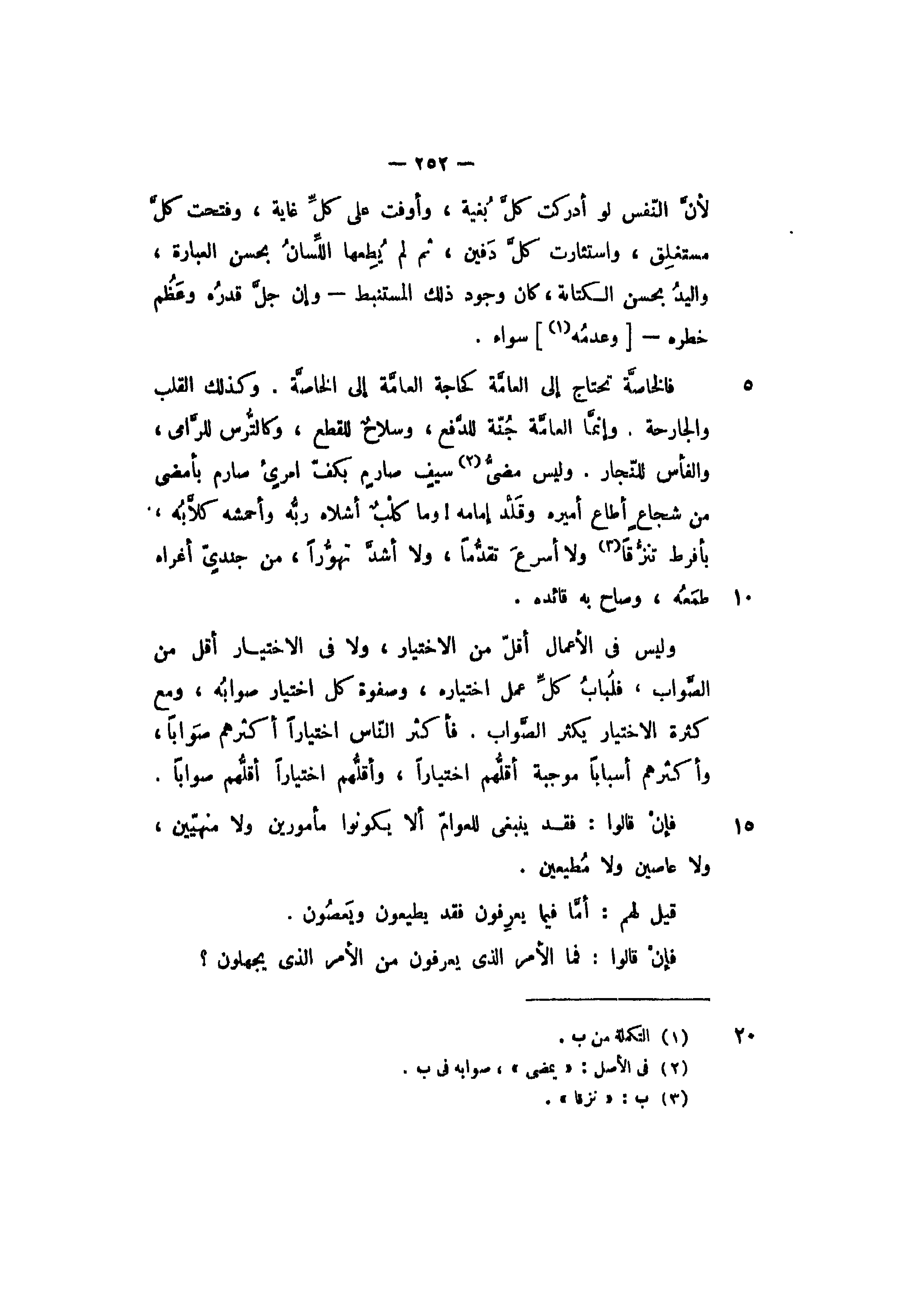 وليس في الأعمال أقل من الاختيار، ولا في الاختيار أقل من الصواب، فلباب كل عمل اختياره، وصفوة كل اختيار صوابه، ومع كثرة الاختيار يكثر الصواب. فأكثر الناس اختيارا أكثرهم صوابا، وأكثرهم أسبابا موجبة أقلهم اختيارا، وأقلهم اختيارا أقلهم صوابا.