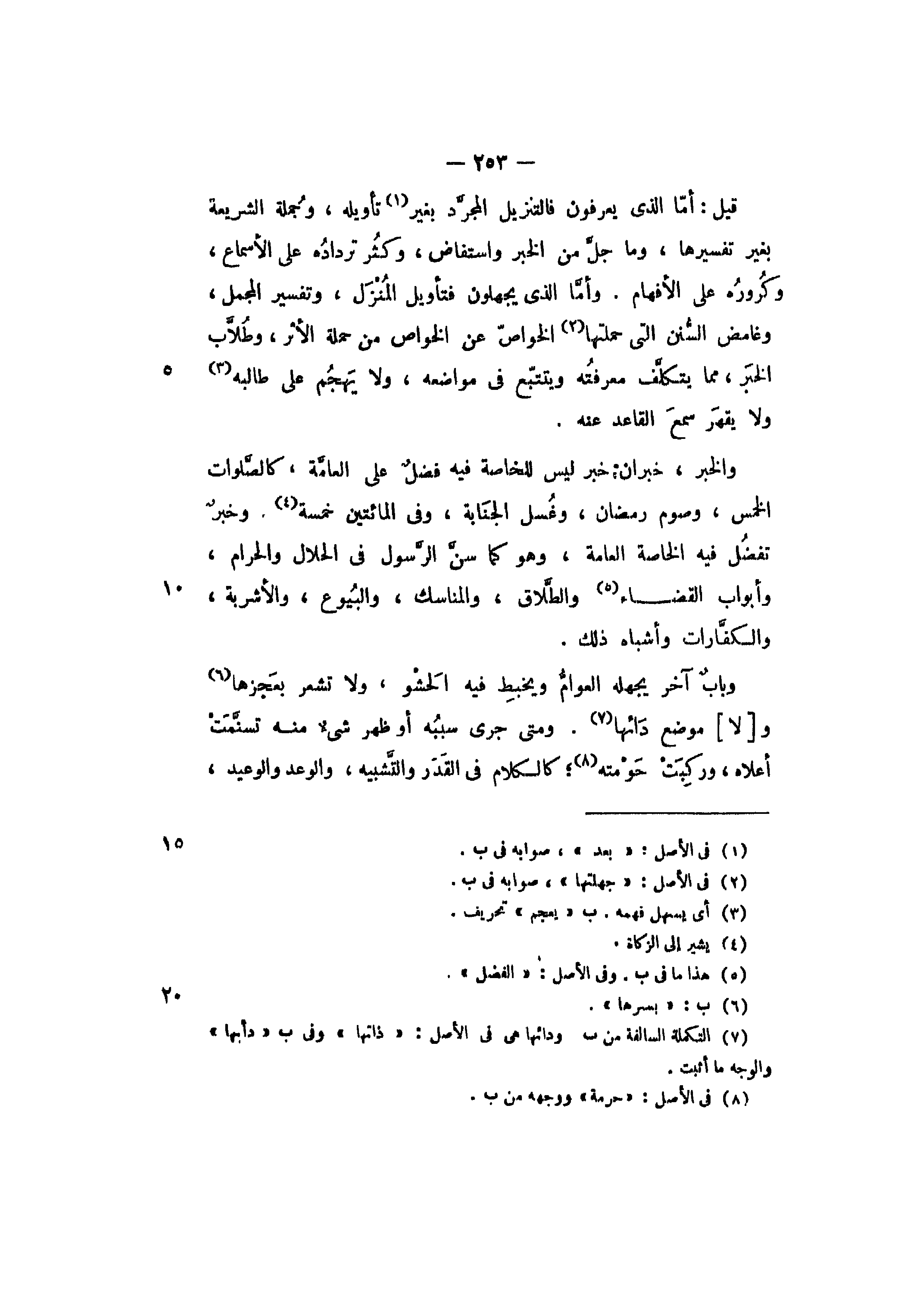 والخبر خبران: خبر للخاصة فيه فضل على العامة، كالصلوات الخمس، وصوم رمضان، وغسل الجنابة، وفي المائتين خمسة. وخبر تفضل فيه الخاصة العامة، وهو كما سن الرسول في الحلال والحرام وأبواب القضاء والطلاق والمناسك والبيوع والأشربة والكفارات، وأشباه ذلك.
