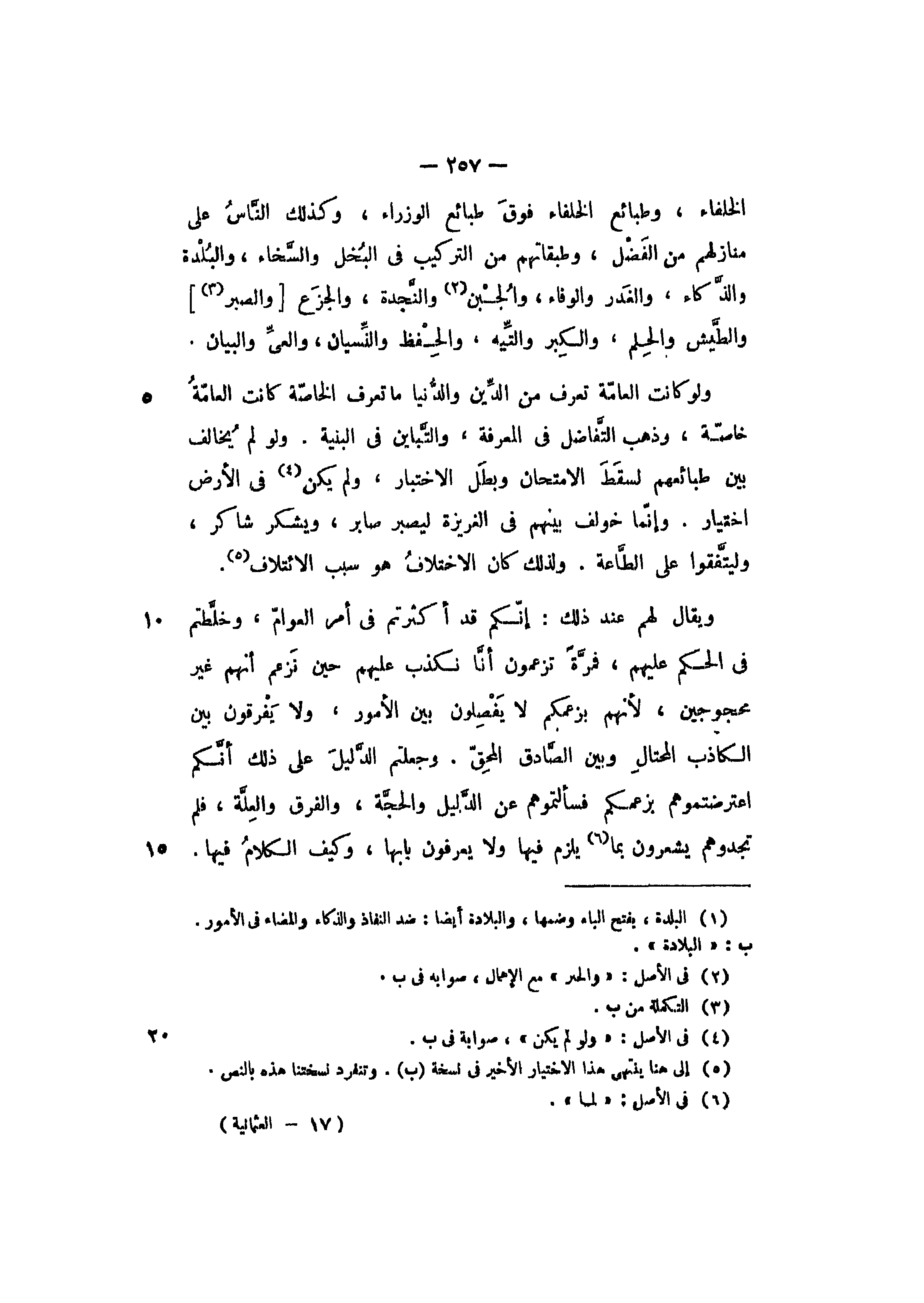 ولو كانت العامة تعرف من الدين والدنيا ما تعرف الخاصة، كانت العامة خاصة، وذهب التفاضل في المعرفة، والتباين في البنية. ولو لم يخالف بين طبائعهم لسقط الامتحان وبطل الاختبار، ولم يكن في الأرض اختيار. وإنما خولف بينهم في الغريزة ليصبر صابر، ويشكر شاكر، وليتفقوا على الطاعة. ولذلك كان الاختلاف هو سبب الائتلاف.