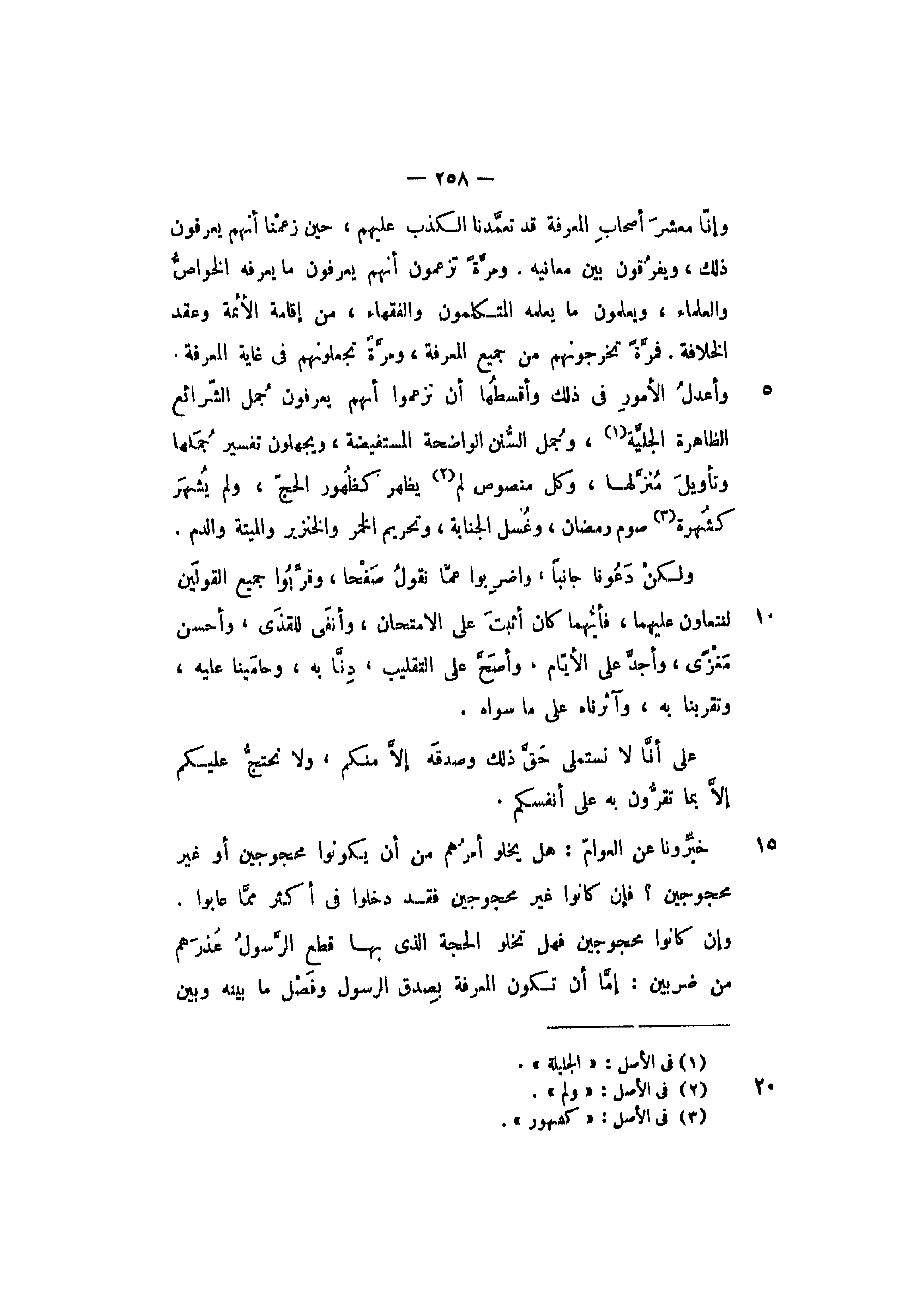 وإنا معشر أصحاب المعرفة قد تعمدنا الكذب عليهم، حين زعمنا أنهم يعرفون ذلك، ويفرقون بين معانيه، ومرة تزعمون أنهم يعرفون ما يعرفه الخواص والعلماء، ويعلمون ما يعلمه المتكلمون والفقهاء، من إقامة الأئمة وعقد الخلافة. فمرة تخرجونهم من جميع المعرفة، ومرة تجعلونهم في غاية المعرفة. وأعدل الأمور في ذلك وأقسطها أن تزعموا أنهم يعرفون جمل الشرائع الظاهرة الجلية وجمل السنن الواضحة المستفيضة، ويجهلون تفسير جملها وتأويل منزلها، وكل منصوص لم يظهر كظهور الحج، ولم يشهر كشهرة صوم رمضان، وغسل الجنابة، وتحريم الخمر والخنزير والميتة والدم.