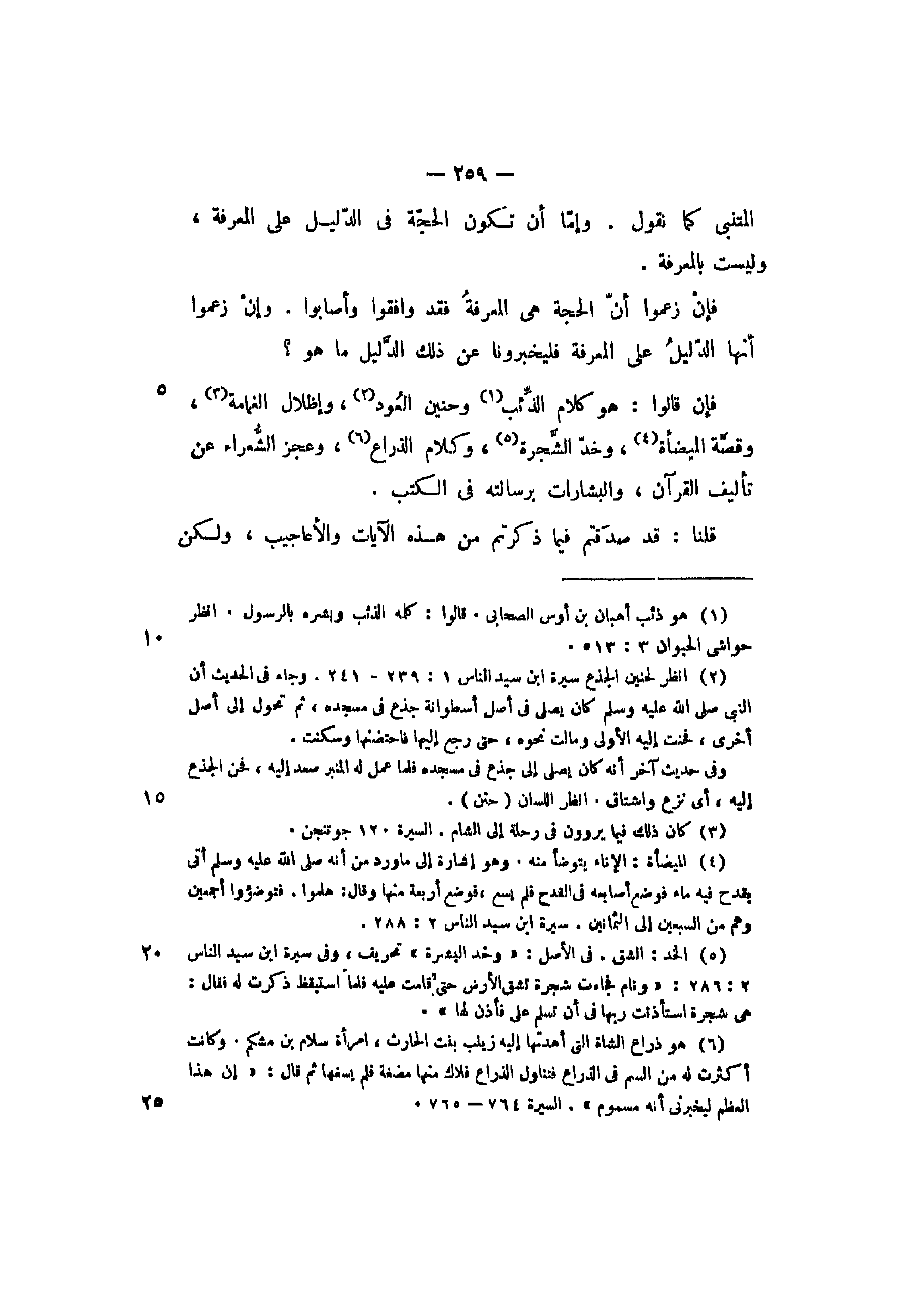 فإن قالوا: هو كلام الذئب، وحنين العود، وإظلال الغمامة، وقصة الميضأة، وخد الشجرة، وكلام الذراع، وعجز الشعراء عن تأليف القرآن، والبشارات برسالته في الكتب.