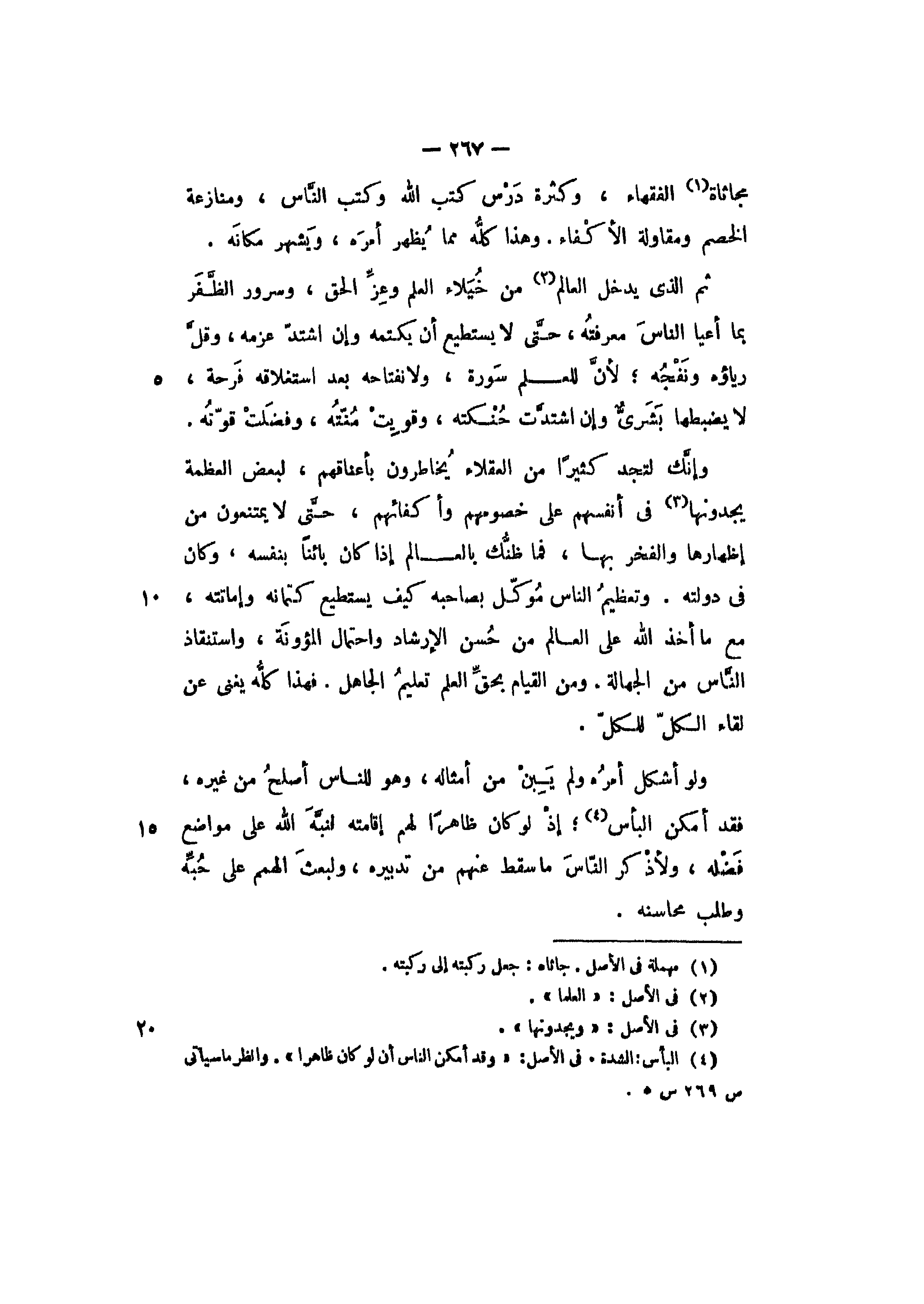 وإنك لتجد كثيرا من العقلاء يخاطرون بأعناقهم، لبعض العظمة يجدونها في أنفسهم على خصومهم وأكفائهم، حتى لا يمتنعون من إظهارها والفخر بها، فما ظنك بالعالم إذا كان بائنا بنفسه، وكان في دولته، وتعظيم الناس موكل بصاحبه، كيف يستطيع كتمانه وإماتته، مع ما أخذ الله على العالم من حسن الإرشاد واحتمال المؤونة، واستنقاذ الناس من الجهالة، ومن القيام بحق العلم تعليم الجاهل. فهذا كله يغني عن لقاء الكل للكل.