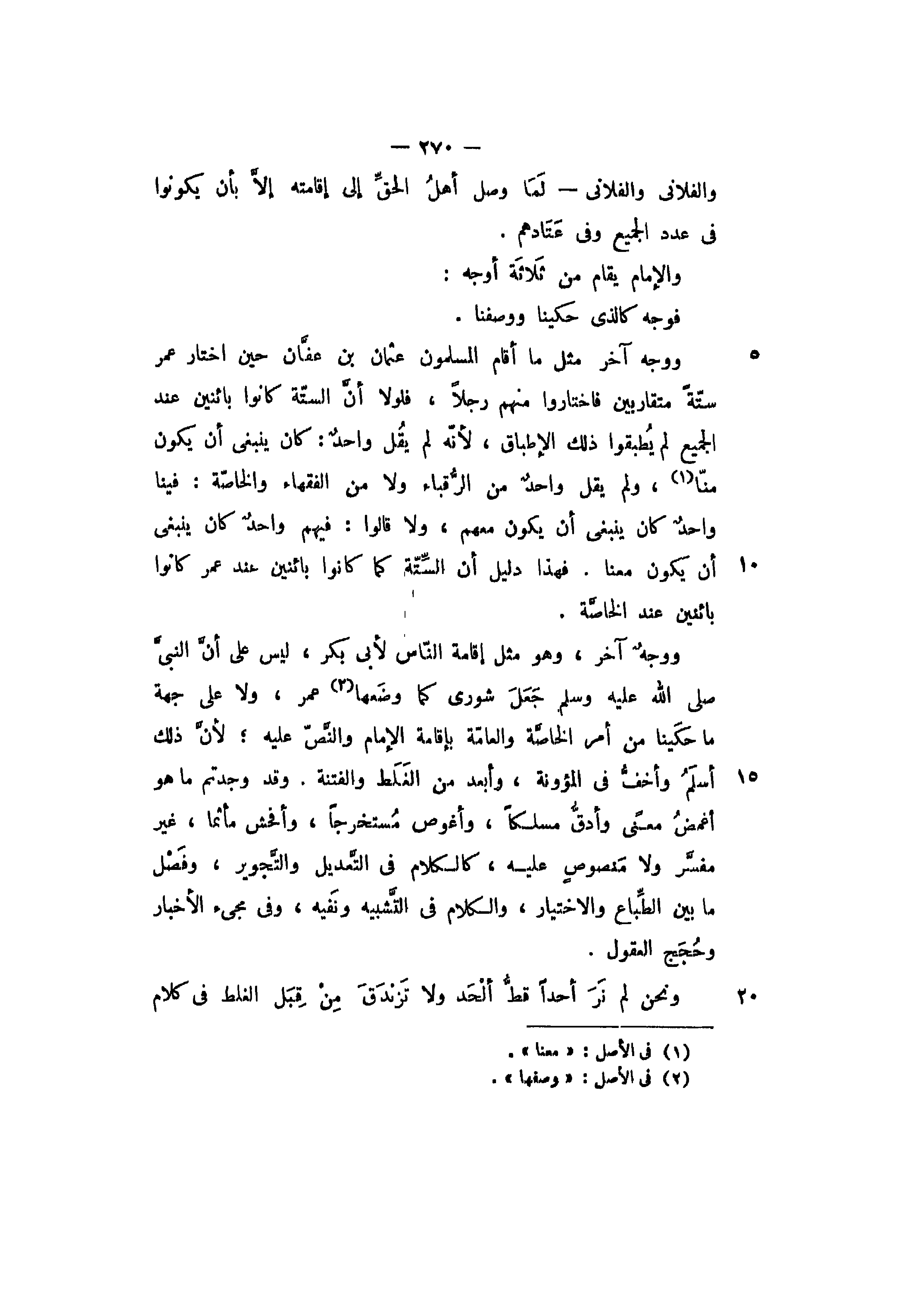 ووجه آخر مثل ما أقام المسلمون عثمان بن عفان حين اختار عمر ستة متقاربين فاختاروا منهم رجلا، فلولا أن الستة كانوا بائنين عند الجميع لم يطبقوا ذلك الإطباق، لأنه لم يقل واحد: كان ينبغي أن يكون منا، ولم يقل واحد من الرقباء ولا من الفقهاء والخاصة: فينا واحد كان ينبغي أن يكون معهم، ولا قالوا: فيهم واحد كان ينبغي أن يكون معنا. فهذا دليل أن الستة كما كانوا بائنين عند عمر كانوا بائنين عند الخاصة.