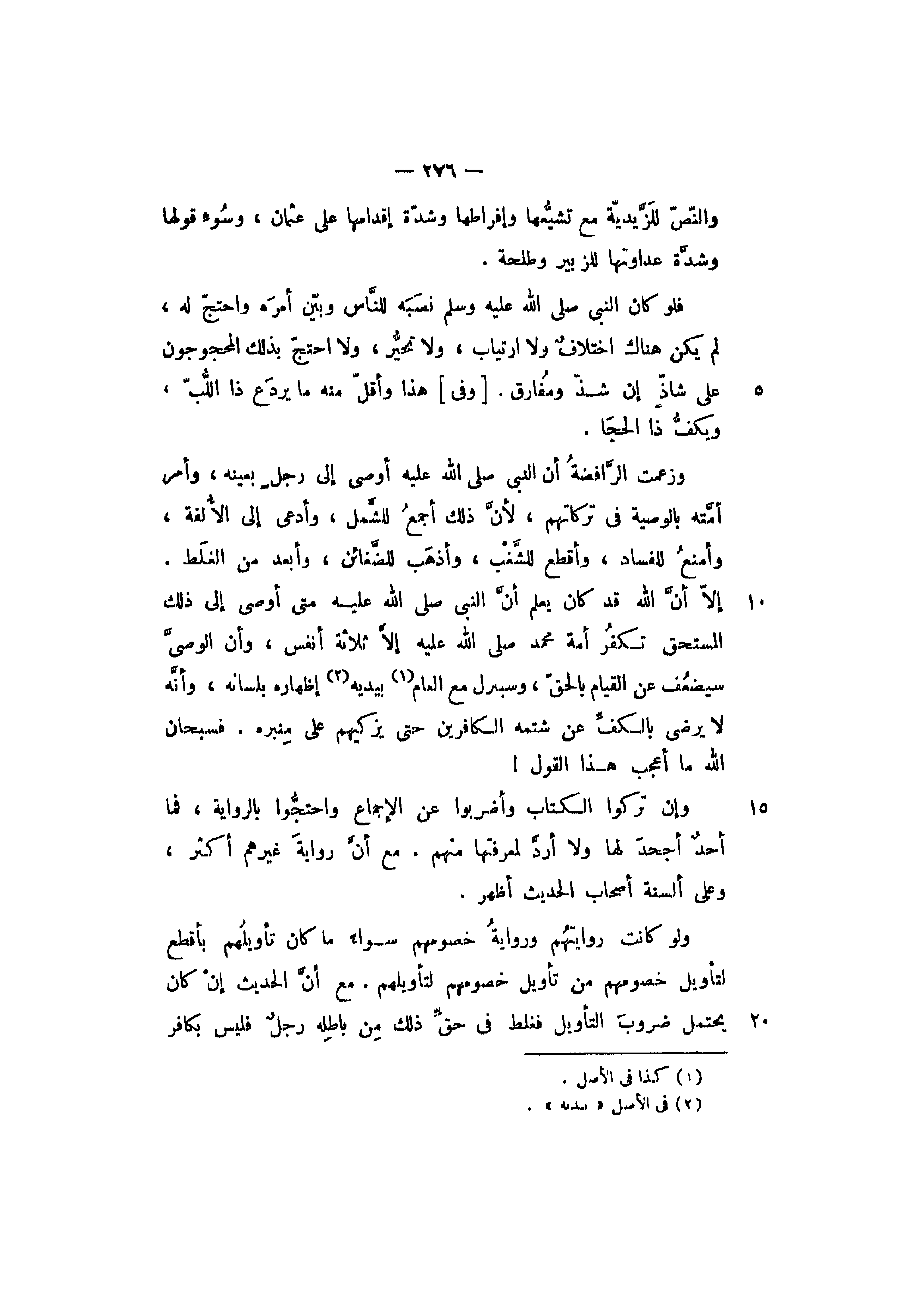 والنص لَلزيدية مع تشيعها وإفراطها وشدة إقدامها على عثمان، وسوء قولها وشدة عداوتها للزبير وطلحة.