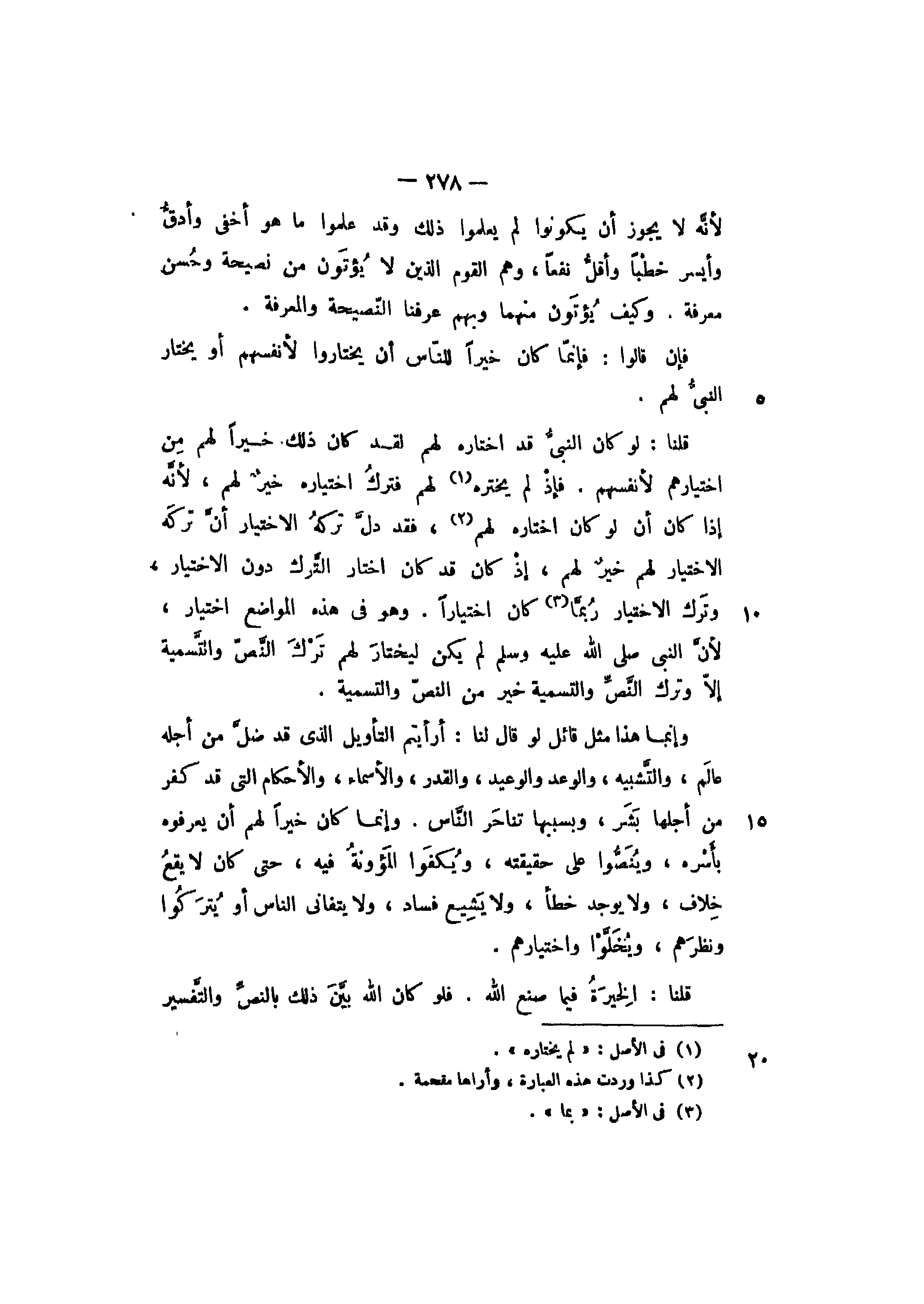 قلنا: لو كان النبي قد اختاره لهم لقد كان ذلك خيرا لهم من اختيارهم لأنفسهم. فإذ لم يختره لهم فترك اختياره خير لهم، لأنه إذا كان أن لو كان اختاره لهم فقد دل تركه الاختيار أن تركه الاختيار لهم خير لهم، إذ كان قد كان اختار الترك دون الاختيار، وترك الاختيار ربما كان اختيارا. وهو في هذه المواضع اختيار، لأن النبي - صلى الله عليه وسلم - لم يكن ليختار لهم ترك النص والتسمية إلا وترك النص والتسمية خير من النص والتسمية.