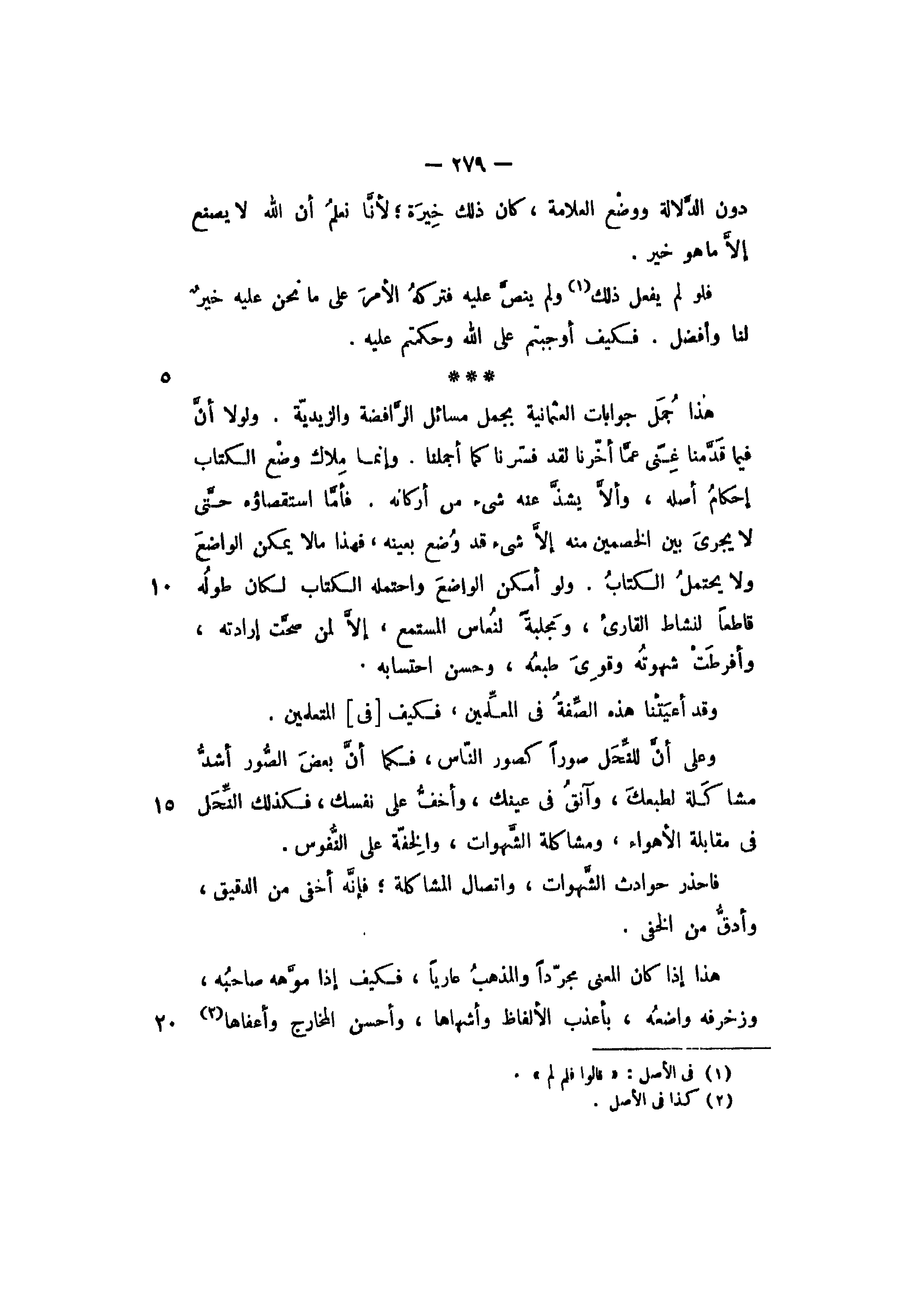 هذا جمل جوابات العثمانية بجمل مسائل الرافضة والزيدية. ولولا أن فيما قدمنا غنى عما أخرنا لقد فسرنا كما أجملنا. وإنما ملاك وضع الكتاب إحكام أصله، وألا يشذ عنه شئ من أركانه، فأما استقصاؤه حتى لا يجري بين الخصمين منه إلا شئ قد وضع بعينه، فهذا ما لا يمكن الواضع ولا يحتمل الكتاب. ولو أمكن الواضع واحتمله الكتاب لكان طوله قاطعا لنشاط القارئ، ومجلبة لنعاس المستمع، إلا لمن صحت إرادته، وأفرطت شهوته، وقوي طبعه، وحسن احتسابه.