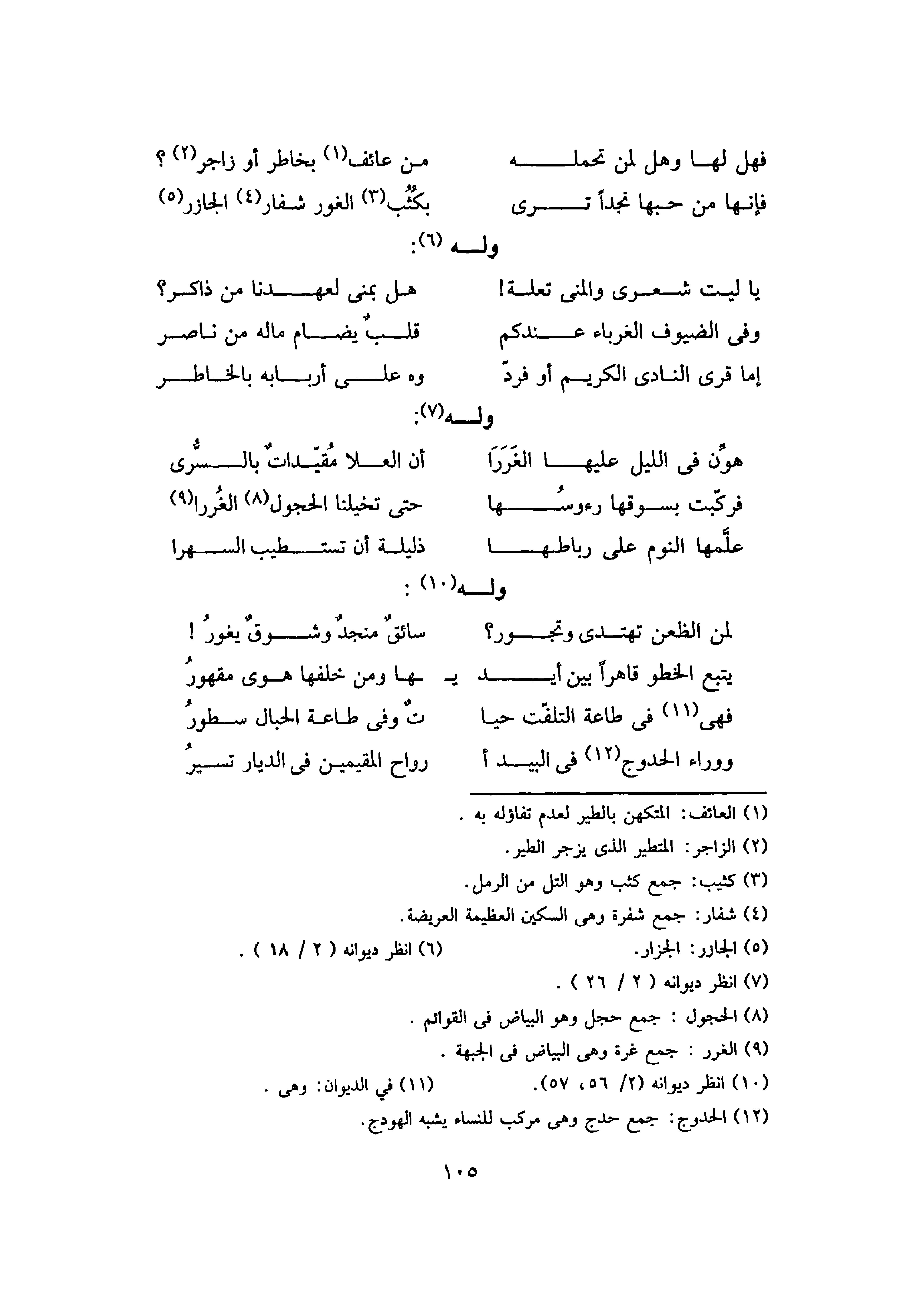 لِمَنِ الظَّعْنُ تَهْتَدِي وَتَجُورُ؟ ... سَائِقٌ مُنْجِدٌ وَشَوْقٌ يَغُورُ!