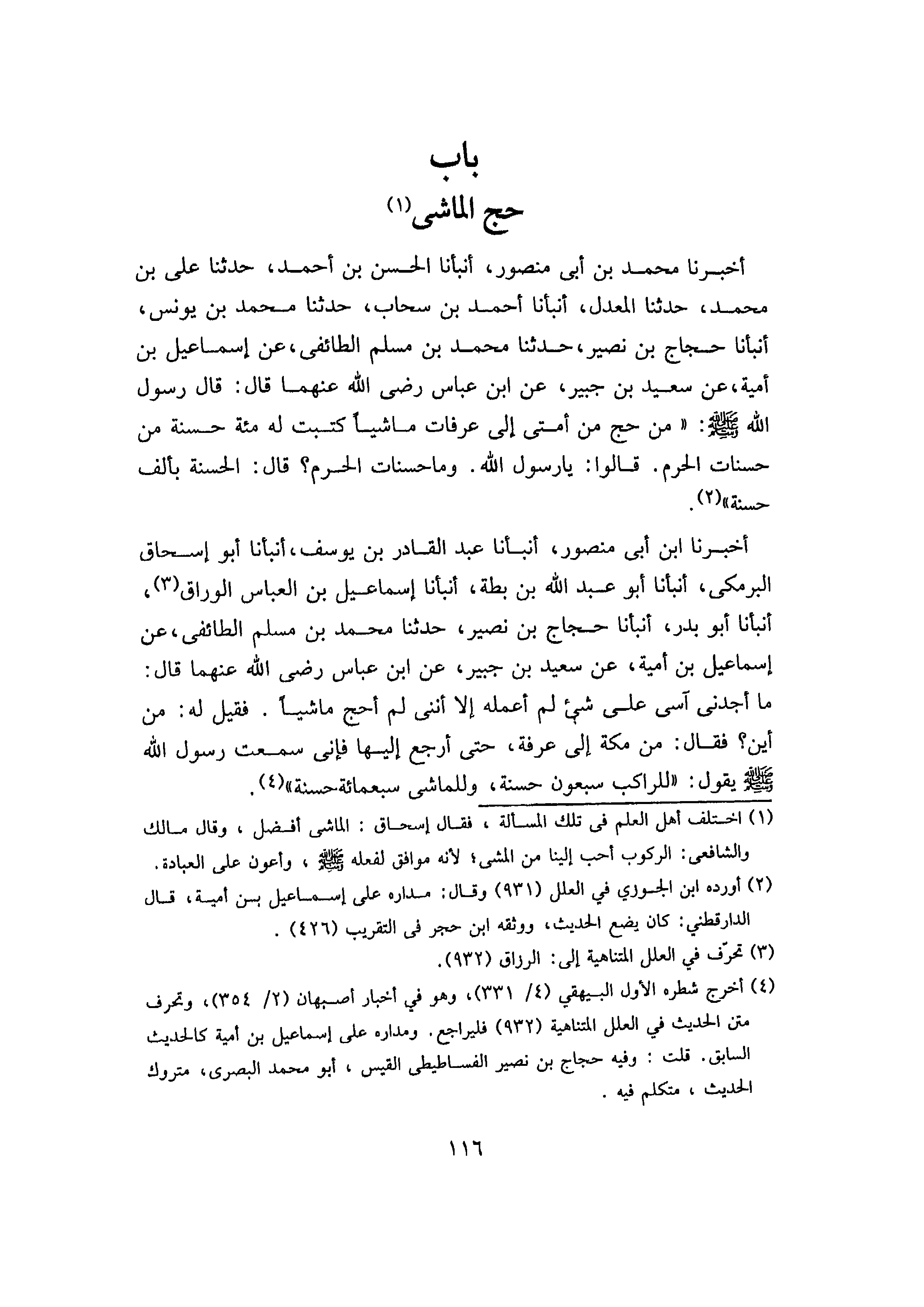 أَخْبَرَنَا مُحَمَّدُ بْنُ أَبِي مَنْصُورٍ، أَنْبَأَنَا الْحَسَنُ بْنُ أَحْمَدَ، حَدَّثَنَا عَلِيُّ بْنُ مُحَمَّدٍ، حَدَّثَنَا الْمُعَدَّلُ، أَنْبَأَنَا أَحْمَدُ بْنُ سَحَابٍ، حَدَّثَنَا مُحَمَّدُ بْنُ يُونُسَ، أَنْبَأَنَا حَجَّاجُ بْنُ نُصَيْرٍ، حَدَّثَنَا مُحَمَّدُ بْنُ مُسْلِمٍ الطَّائِفِيُّ، عَنْ إِسْمَاعِيلَ بْنِ أُمَيَّةَ، عَنْ سَعِيدِ بْنِ جُبَيْرٍ، عَنِ ابْنِ عَبَّاسٍ رَضِيَ اللَّهُ عَنْهُمَا، قَالَ: قَالَ رَسُولُ اللَّهِ صَلَّى اللَّهُ عَلَيْهِ وَسَلَّمَ: «مَنْ حَجَّ مِنْ أُمَّتِي إِلَى عَرَفَاتٍ مَاشِيًا كُتِبَتْ لَهُ مِائَةُ حَسَنَةٍ مِنْ حَسَنَاتِ الْحَرَمِ» .