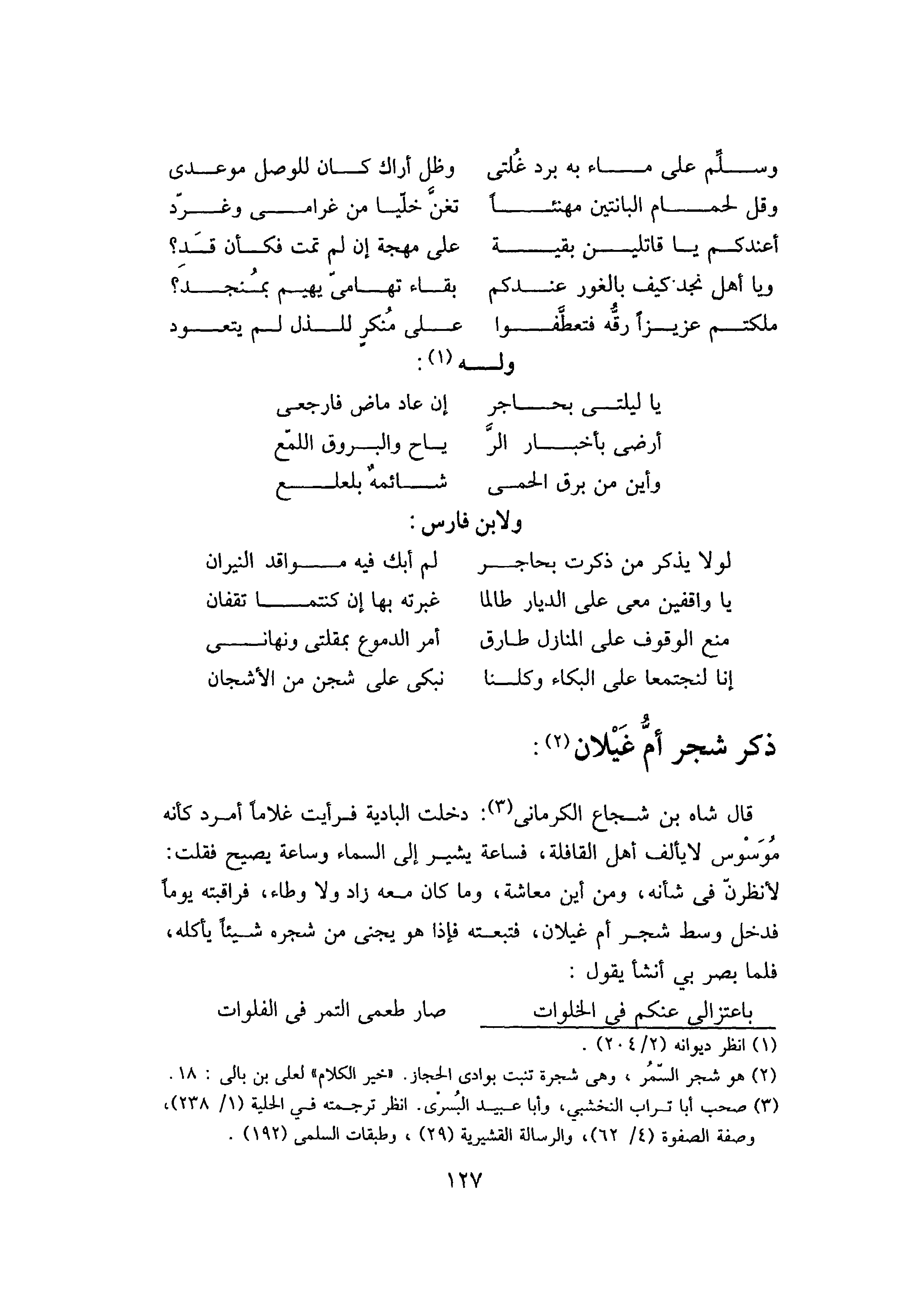 قَالَ شَاهُ بْنُ شُجَاعٍ الْكِرْمَانِيُّ: دَخَلْتُ الْبَادِيَةَ فَرَأَيْتُ غُلامًا أَمْرَدَ كَأَنَّهُ مُوَسْوَسٌ لا يَأْلَفُ أَهْلَ الْقَافِلَةِ، فَسَاعَةً يُشِيرُ إِلَى السَّمَاءِ وَسَاعَةً يَصِيحُ فَقُلْتُ: لَأَنْظُرَنَّ فِي شَأْنِهِ، وَمِنْ أَيْنَ مَعَاشُهُ، وَمَا كَانَ مَعَهُ زَادٌ وَلا وِطَاءٌ، فَرَاقَبْتُهُ يَوْمًا فَدَخَلَ وَسَطَ شَجَرِ أُمِّ غَيْلانَ، فَتَبِعْتُهُ فَإِذَا هُوَ يَجْنِي مِنْ شَجَرِهِ شَيْئًا يَأْكُلُهُ، فَلَمَّا بَصُرَ بِي، أَنْشَأَ يَقُولُ: