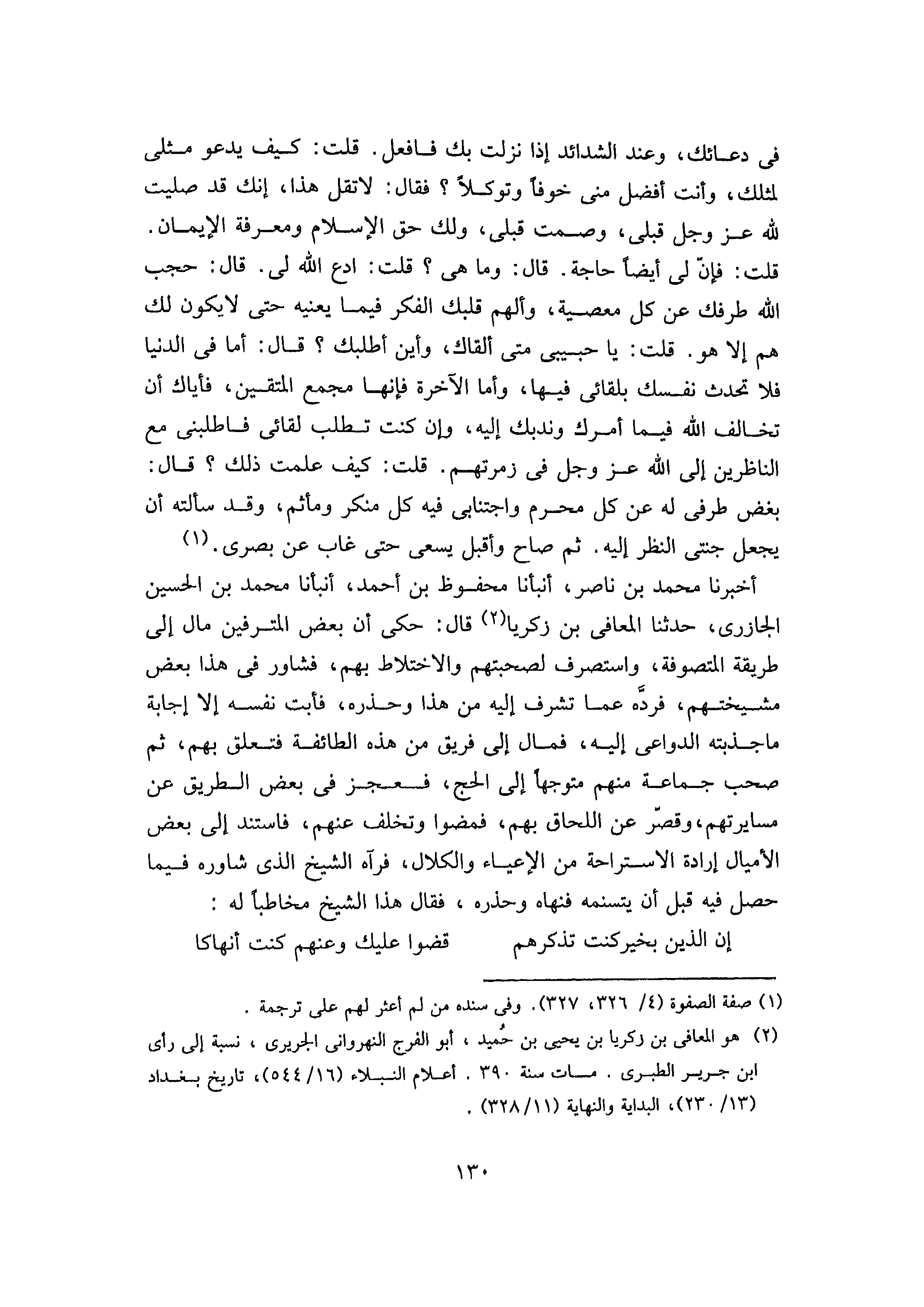 أَخْبَرَنَا مُحَمَّدُ بْنُ نَاصِرٍ، أَنْبَأَنَا مَحْفُوظُ بْنُ أَحْمَدَ، أَنْبَأَنَا مُحَمَّدُ بْنُ الْحُسَيْنِ الْجَازِرِيُّ، حَدَّثَنَا الْمُعَافَى بْنُ زَكَرِيَّا، قَالَ: حُكِيَ أنَّ بَعْضَ الْمُتْرَفِينَ مَالَ إِلَى طَرِيقَةِ الْمُتَصَوِّفَةِ، وَاسْتُصْرِفَ لِصُحْبَتِهِمْ وَالاخْتِلاطِ بِهِمْ، فَشَاوَرَ فِي هَذَا بَعْضَ مَشْيَخَتِهِمْ، فَرَدَّهُ عَمَّا تَشَرَّفَ إِلَيْهِ مِنْ هَذَا وَحَذَّرَهُ، فَأَبَتْ نَفْسُهُ إِلا إِجَابَةَ مَا جَذَبَتْهُ الدَّوَاعِي إِلَيْهِ، فَمَالَ إِلَى فَرِيقٍ مِنْ هَذِهِ الطَّائِفَةِ فَتَعَلَّقَ بِهِمْ، ثُمَّ صَحِبَ جَمَاعَةً مِنْهُمْ مُتَوَجِّهًا إِلَى الْحَجِّ، فَعَجَزَ فِي بَعْضِ الطَّرِيقِ عَنْ مُسَايَرَتِهِمْ، وَقَصَّرَ عَنِ اللِّحَاقِ بِهِمْ، فَمَضَوْا وَتَخَلَّفَ عَنْهُمْ، فَاسْتَنَدَ إِلَى بَعَضِ الْأَمْيَالِ إِرَادَةَ الاسْتِرَاحَةِ مِنَ الْإِعْيَاءِ وَالْكَلالِ، فَرَآهُ الشَّيْخُ الَّذِي شَاوَرَهُ فِيمَا حَصَلَ فِيهِ قَبْلَ أَنْ يَتَسَنَّمَهُ فَنَهَاهُ وَحَذَّرَهُ، فقال هذا الشيخ مخاطبا له