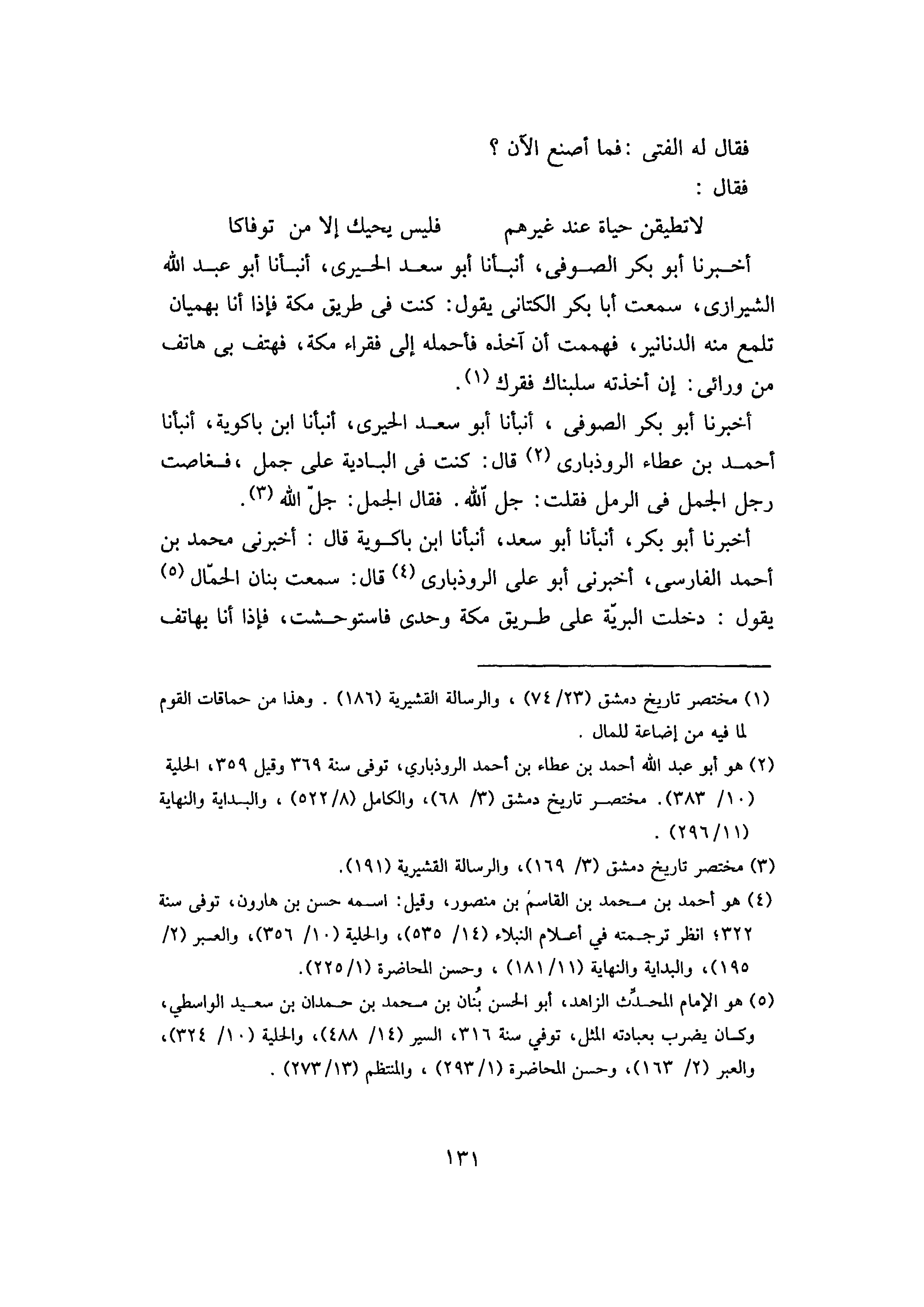 ! 215 أَخْبَرَنَا أَبُو بَكْرٍ، أَنْبَأَنَا أَبُو سَعْدٍ، أَنْبَأَنَا ابْنُ بَاكَوَيْهِ، قَالَ: أَخْبَرَنِي مُحَمَّدُ بْنُ أَحْمَدَ الْفَارِسِيُّ، أَخْبَرَنِي أَبُو عَلِيٍّ الرُّوذْبَارِيُّ، قَالَ: سَمِعْتُ بَنَّانًا الْحَمَّالَ، يَقُولُ: " دَخَلْتُ الْبَرِّيَّةَ عَلَى طَرِيقِ مَكَّةَ وَحْدِي فَاسْتَوْحَشْتُ، فَإِذَا أَنَا بِهَاتِفٍ