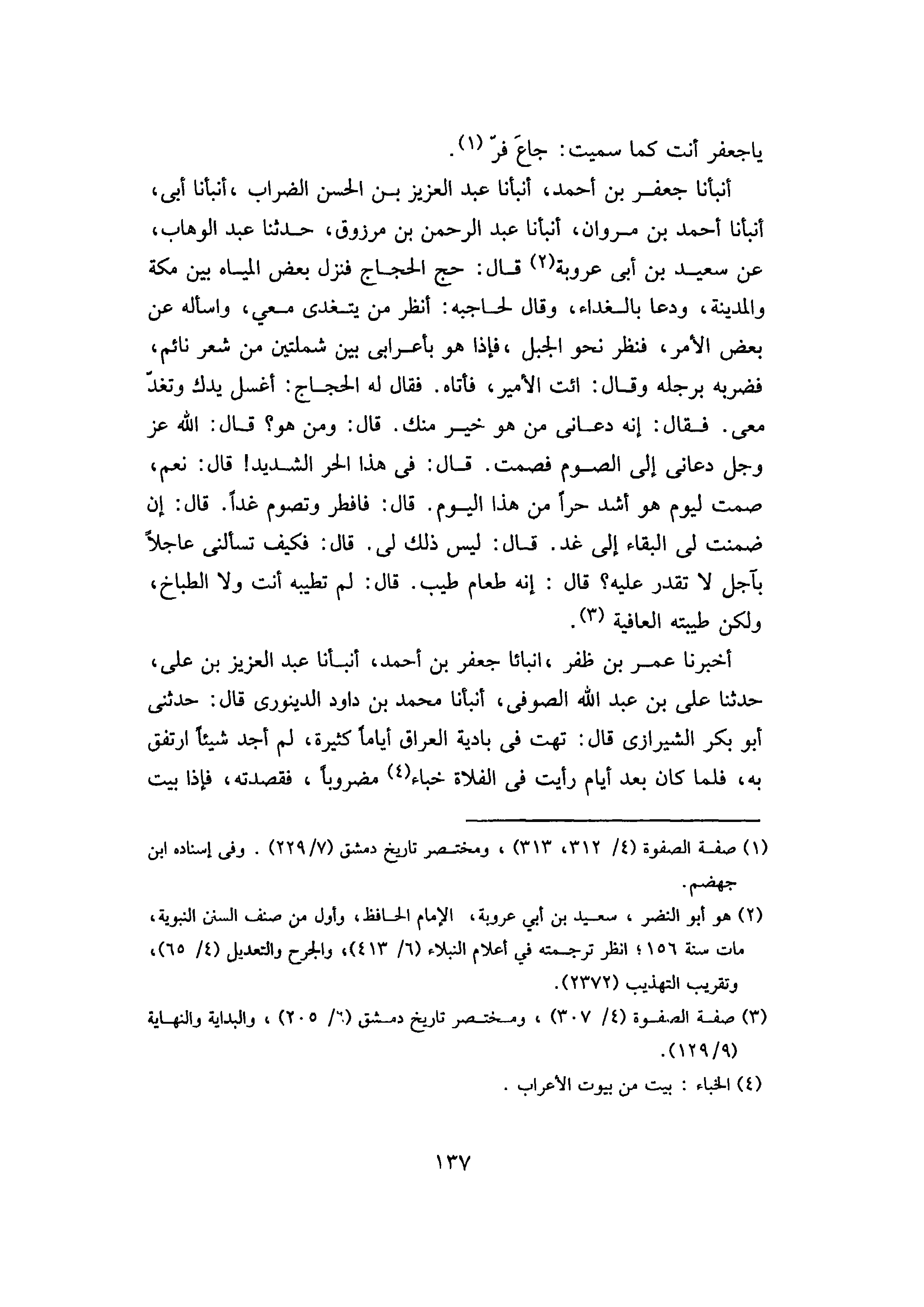أَنْبَأَنَا جَعْفَرُ بْنُ أَحْمَدَ، أَنْبَأَنَا عَبْدُ الْعَزِيزِ بْنُ الْحَسَنِ الضَّرَّابُ، أَنْبَأَنَا أَبِي، أَنْبَأَنَا أَحْمَدُ بْنُ مَرْوَانَ، أَنْبَأَنَا عَبْدُ الرَّحْمَنِ بْنُ مَرْزُوقٍ، حَدَّثَنَا عَبْدُ الْوَهَّابِ، عَنْ سَعِيدِ بْنِ أَبِي عَرُوبَةَ، قَالَ: " حَجَّ الْحَجَّاجُ فَنَزَلَ بَعْضَ الْمِيَاهِ بَيْنَ مَكَّةَ وَالْمَدِينَةِ، وَدَعَا بِالْغَدَاءِ، وَقَالَ لِحَاجِبِهِ: انْظُرْ مَنْ يَتَغَدَّى مَعِي، وَاسْأَلْهُ عَنْ بَعْضِ الْأَمْرِ، فَنَظَرَ نَحْوَ الْجَبَلِ، فَإِذَا هُوَ بِأَعْرَابِيٍّ بَيْنَ شَمْلَتَيْنِ مِنْ شَعْرٍ نَائِمٍ، فَضَرَبَهُ بِرِجْلِهِ، وَقَالَ: ائْتِ الْأَمِيرَ، فَأَتَاهُ.