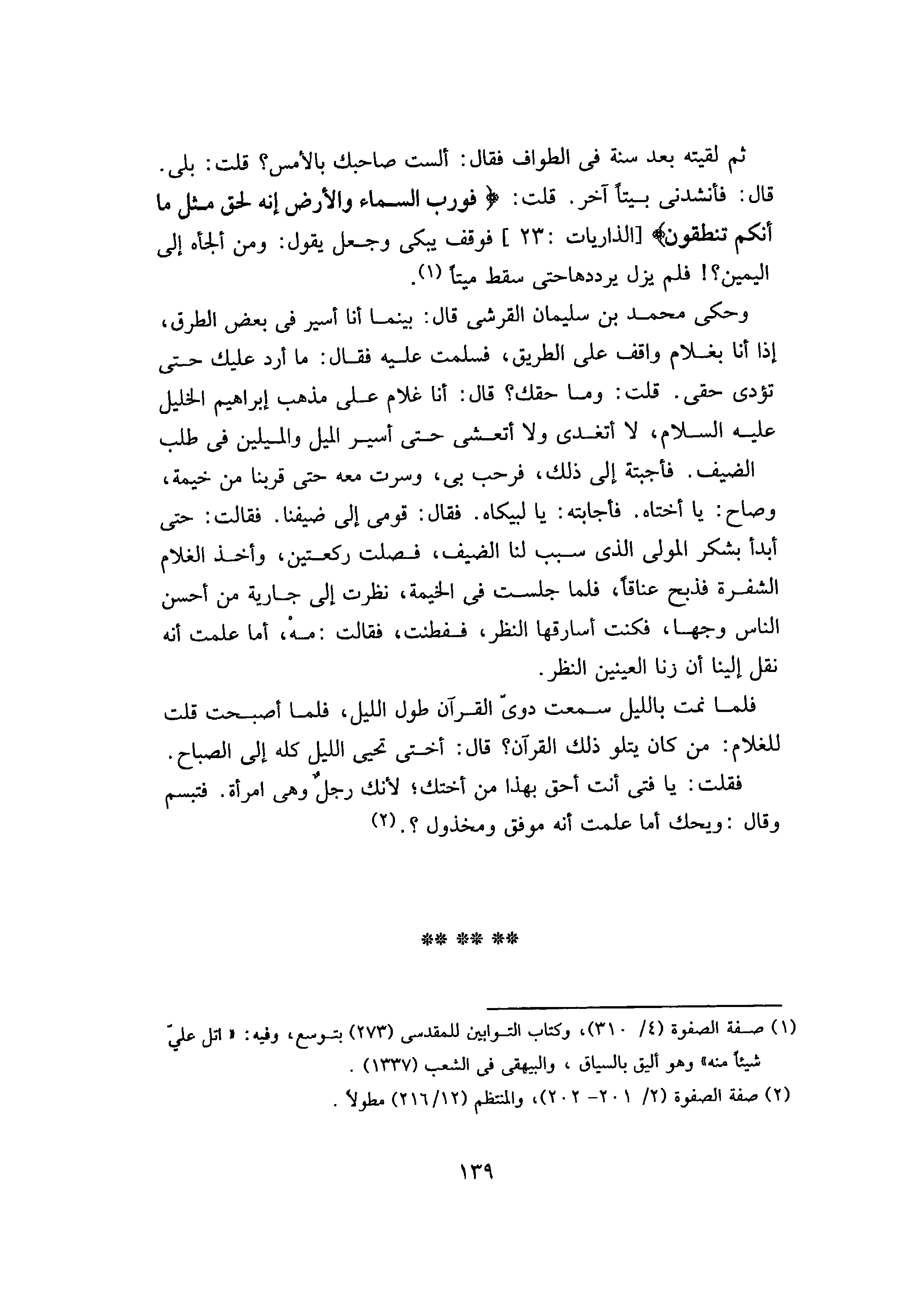 فَقَالَتْ: حَتَّى أَبْدَأَ بِشُكْرِ الْمَوْلَى الَّذِي سَبَّبَ لَنَا الضَّيْفَ، فَصَلَّتْ رَكْعَتَيْنِ، وَأَخَذَ الْغُلامُ الشَّفْرَةَ فَذَبَحَ عِنَاقًا، فَلَمَّا جَلَسْتُ فِي الْخَيْمَةِ، نَظَرْتُ إِلَى جَارِيَةٍ مِنْ أَحْسَنِ النَّاسِ وَجْهًا، فَكُنْتُ أُسَارِقُهَا النَّظَرَ، فَفَطِنَتْ، فَقَالَتْ: مَهْ، أَمَا عَلِمْتَ أَنَّهُ نُقِلَ إِلَيْنَا أَنَّ زِنَا الْعَيْنَيْنِ النَّظَرُ.