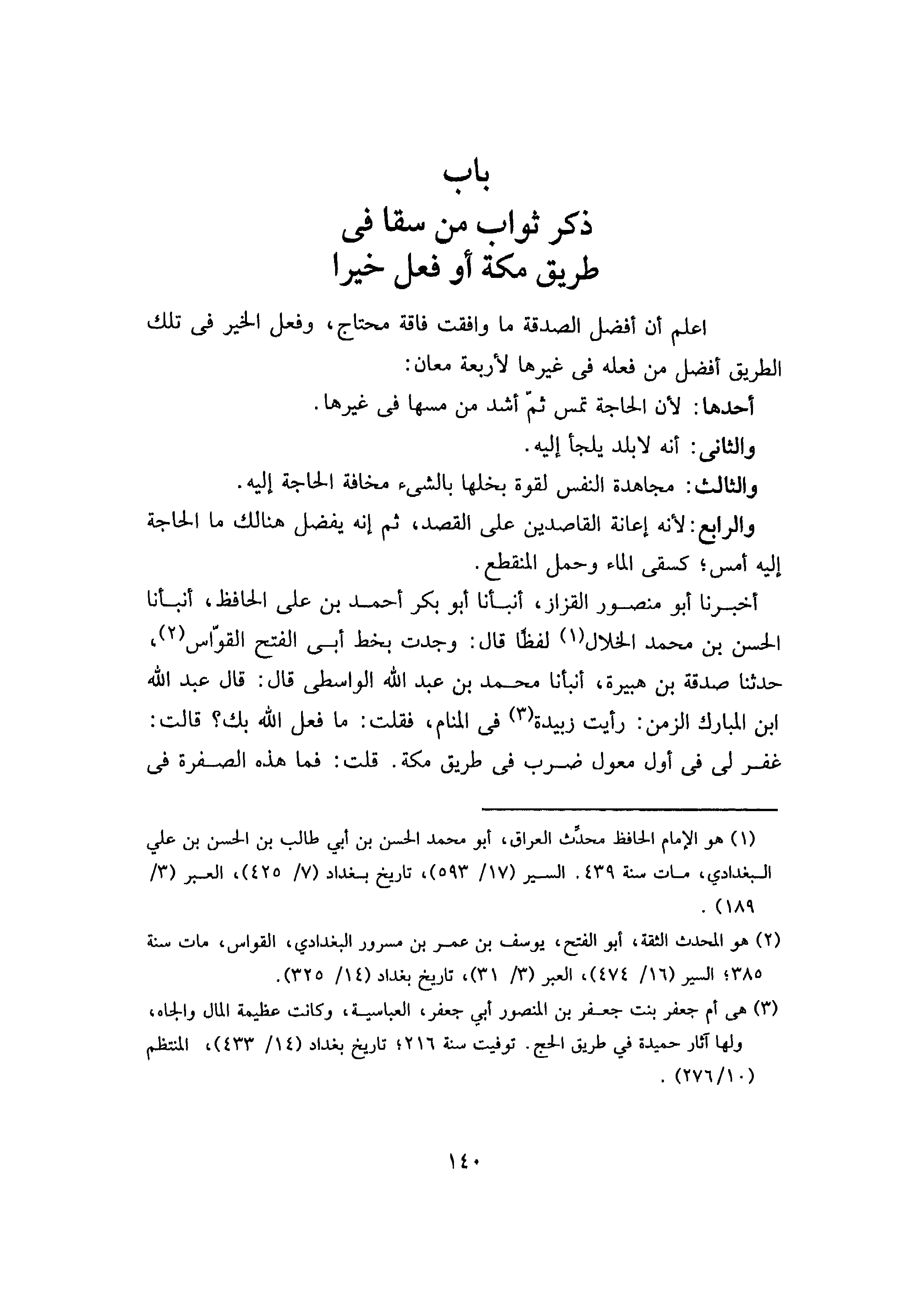 بَابُ ذِكْرِ ثَوَابِ مَنْ سَقَا فِي طَرِيقِ مَكَّةَ أَوْ فَعَلَ خَيْرًا