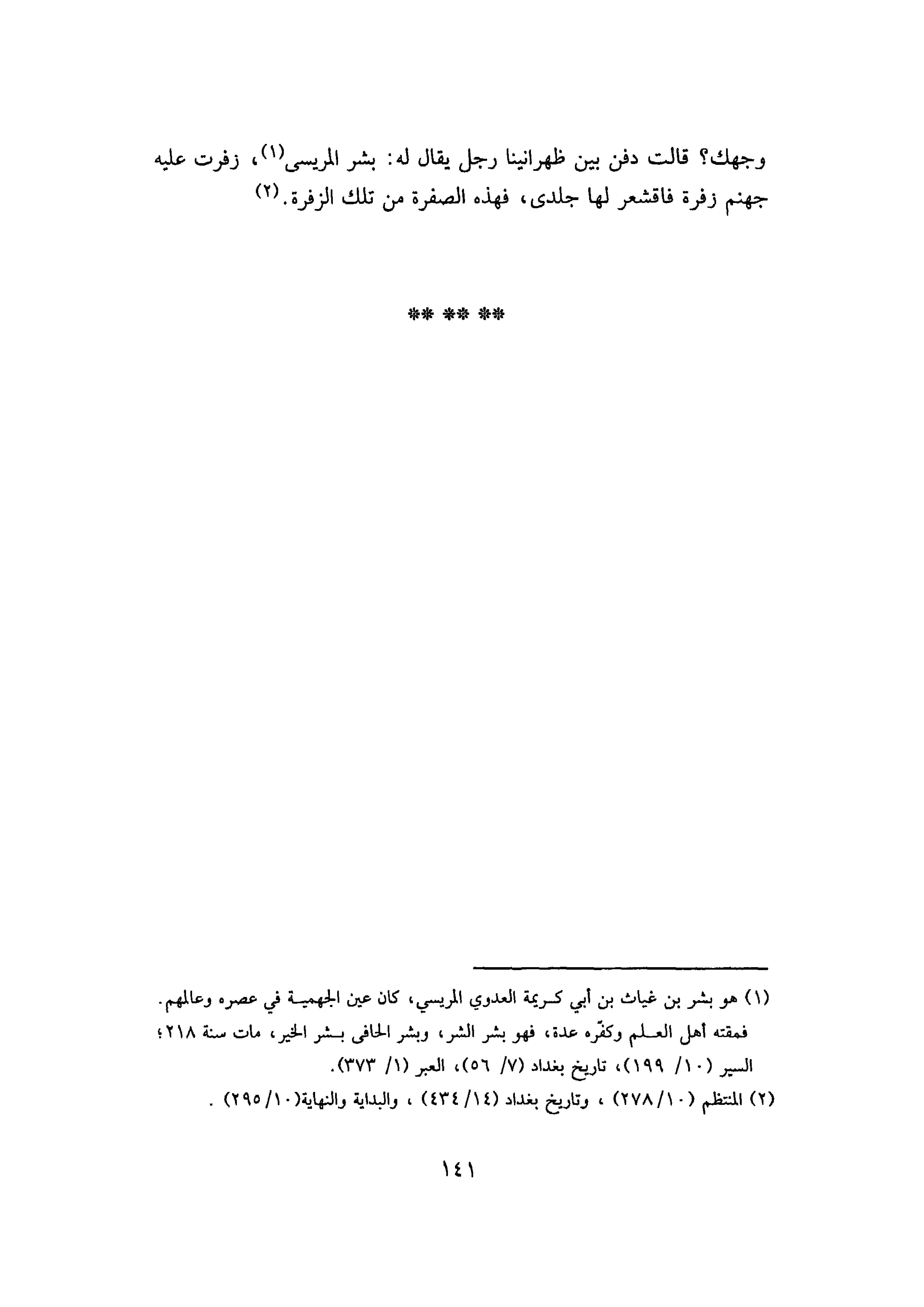 وَجْهِكِ؟ قَالَتْ: دُفِنَ بَيْنَ ظَهْرَانَيْنَا رَجُلٌ يُقَالُ لَهُ: بِشْرٌ الْمَرِيسِيُّ، زَفَرَتْ عَلَيْهِ جَهَنَّمُ زَفْرَةً فَاقْشَعَرَّ لَهَا جِلْدِي، فَهَذِهِ الصُّفْرَةُ مِنْ تِلْكَ الزَّفْرَةِ «