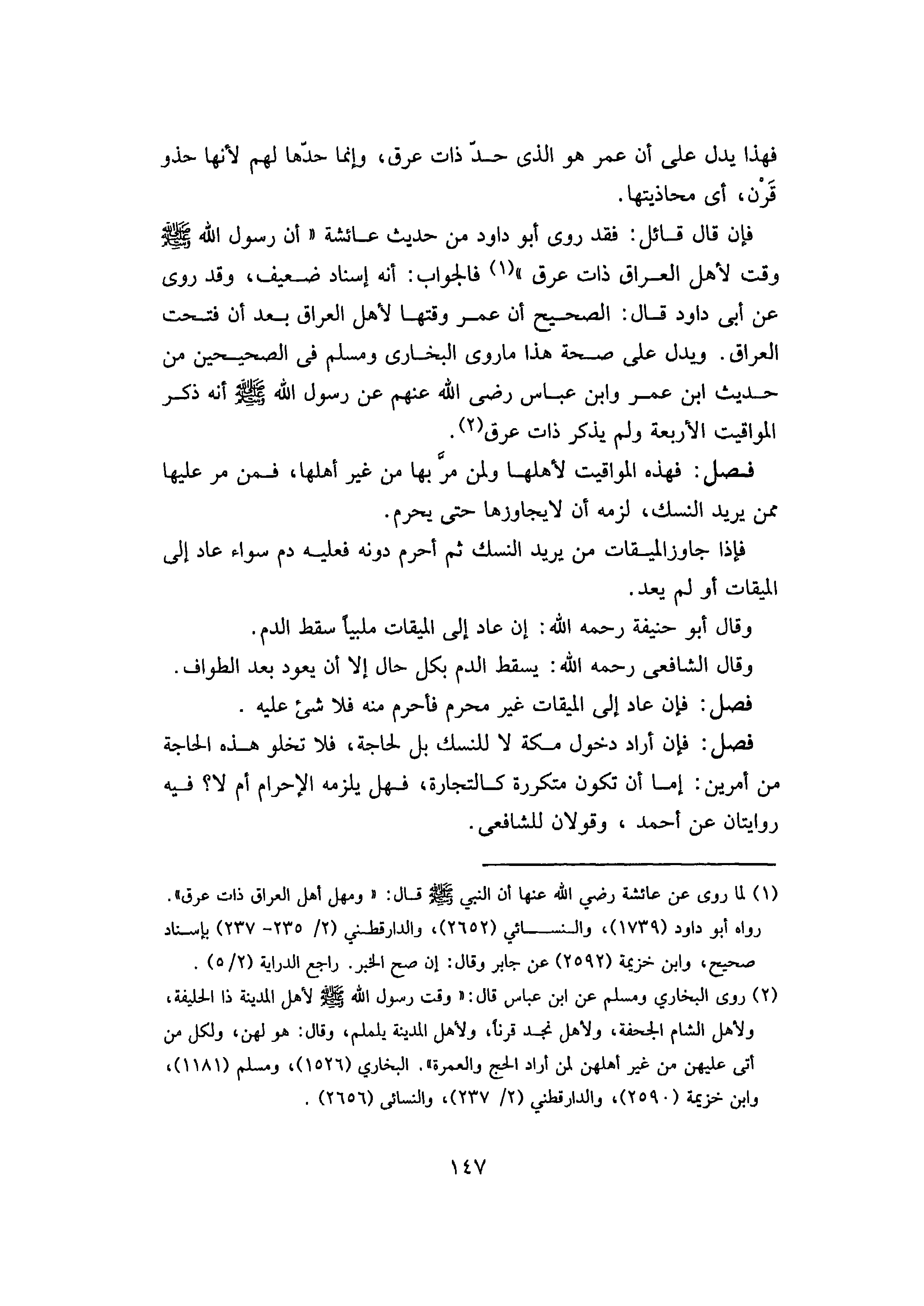 وَيَدُلُّ عَلَى صِحَّةِ هَذَا مَا رَوَى الْبُخَارِيُّ وَمُسْلِمٌ فِي الصَّحِيحَيْنِ مِنْ حَدِيثِ ابْنِ عُمَرَ، وَابْنِ عَبَّاسٍ رَضِيَ اللَّهُ عَنْهُمْ، عَنْ رَسُولِ اللَّهِ صَلَّى اللَّهُ عَلَيْهِ وَسَلَّمَ: أَنَّهُ «ذَكَرَ الْمَوَاقِيتَ الْأَرْبَعَةَ وَلَمْ يَذْكُرْ ذَاتَ عِرْقٍ» .
