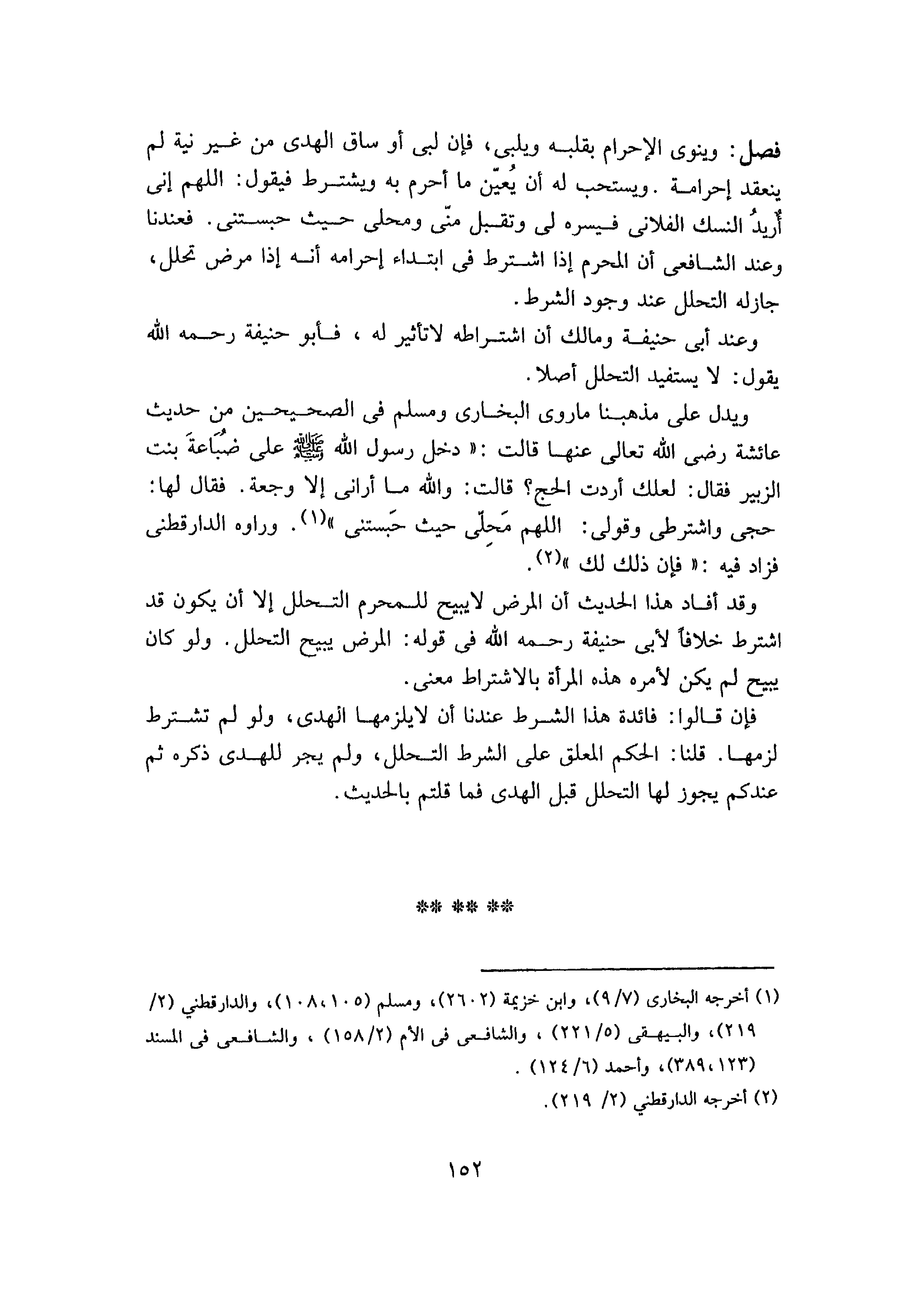 وَيَدُلُّ عَلَى مَذْهَبِنَا مَا رَوَى الْبُخَارِيُّ وَمُسْلِمٌ فِي الصَّحِيحَيْنِ مِنْ حَدِيثِ عَائِشَةَ رَضِيَ اللهُ تَعَالَى عَنْهَا، قَالَتْ: دَخَلَ رَسُولُ اللَّهِ صَلَّى اللَّهُ عَلَيْهِ وَسَلَّمَ عَلَى ضُبَاعَةَ بِنْتِ الزُّبَيْرِ، فَقَالَ: «لَعَلَّكِ أَرَدْتِ الْحَجَّ؟» قَالَتْ: وَاللَّهِ مَا أَرَانِي إِلا وَجِعَةً.