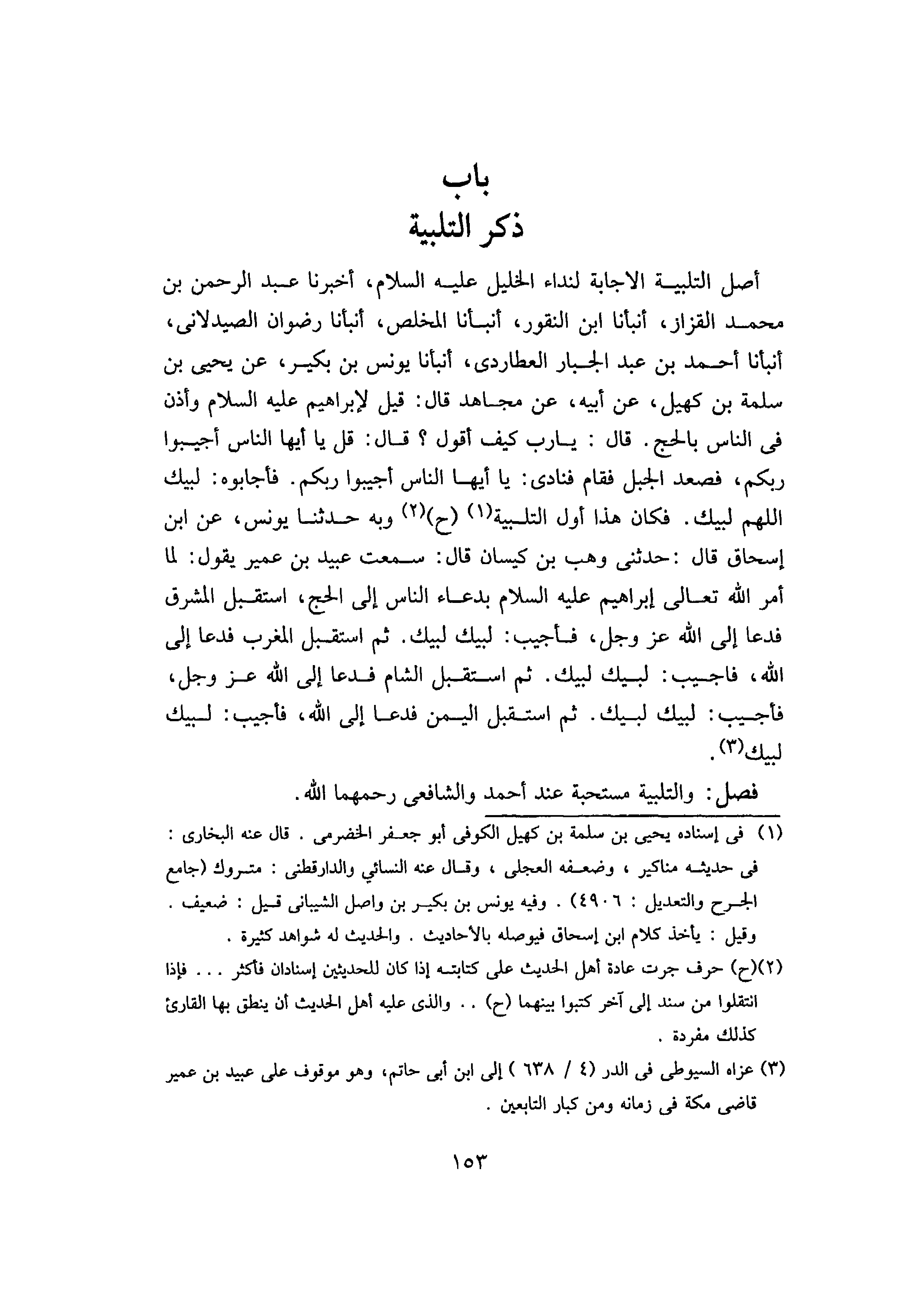 ! 206 أَخْبَرَنَا عَبْدُ الرَّحْمَنِ بْنُ مُحَمَّدٍ الْقَزَّازُ، أَنْبَأَنَا ابْنُ النّقورِ، أَنْبَأَنَا الْمُخَلِّصُ، أَنْبَأَنَا رِضْوَانُ الصَّيْدَلانِيُّ، أَنْبَأَنَا أَحْمَدُ بْنُ عَبْدِ الْجَبَّارِ الْعُطَارِدِيُّ، أَنْبَأَنَا يُونُسُ بْنُ بَكِيرٍ، عَنْ يَحْيَى بْنِ سَلَمَةَ بْنِ كُهَيْلٍ، عَنْ أَبِيهِ، عَنْ مُجَاهِدٍ، قَالَ: قِيلَ لِإِبْرَاهِيمَ عَلَيْهِ السَّلامُ: وَأَذِّنْ فِي النَّاسِ بِالْحَجِّ.