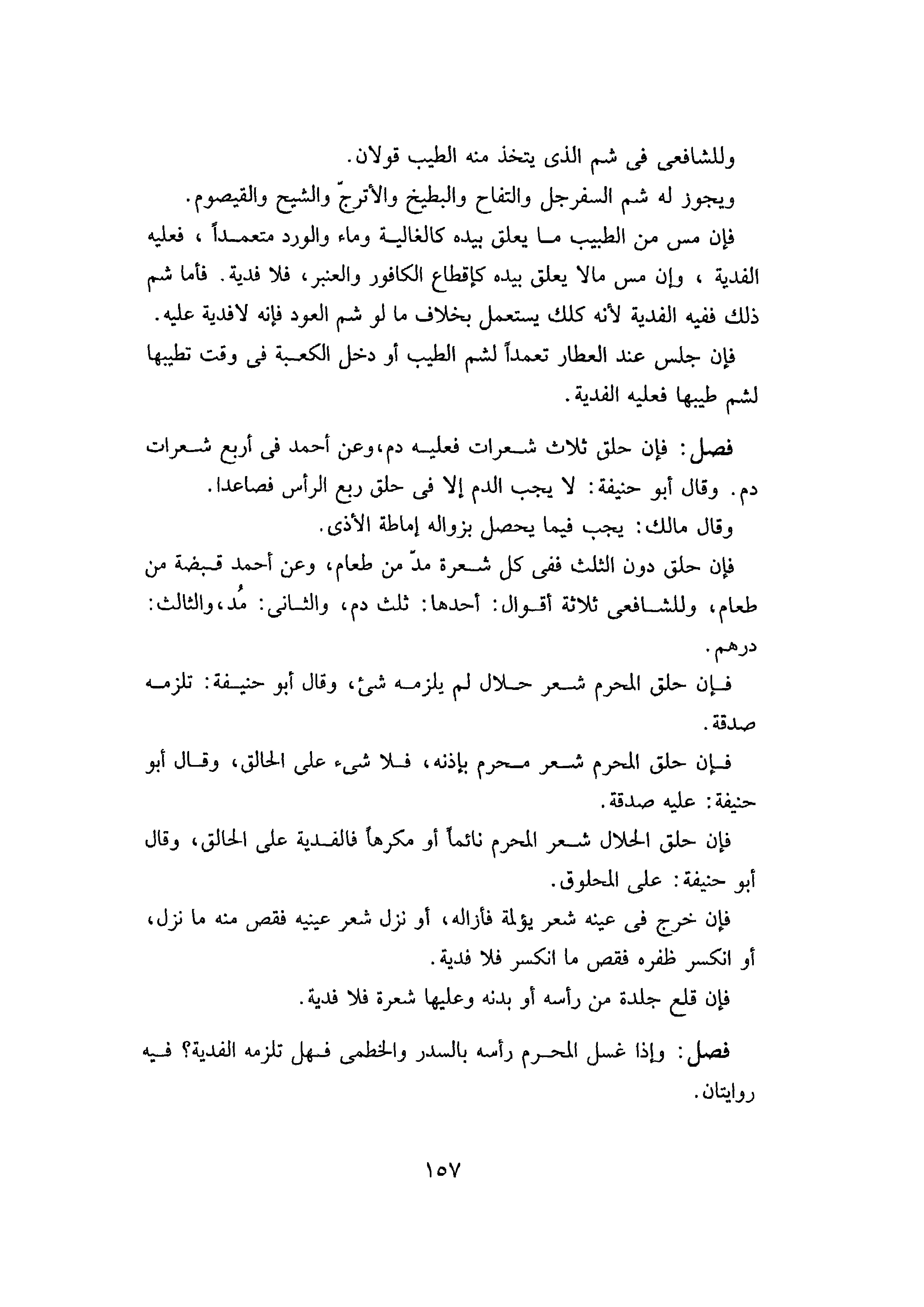 وَإِذَا غَسَلَ الْمُحْرِمُ رَأْسَهُ بِالسِّدْرِ وَالْخِطْمِي فَهَلْ تَلْزَمُهُ الْفِدْيَةُ؟ فِيهِ رِوَايَتَانِ:
