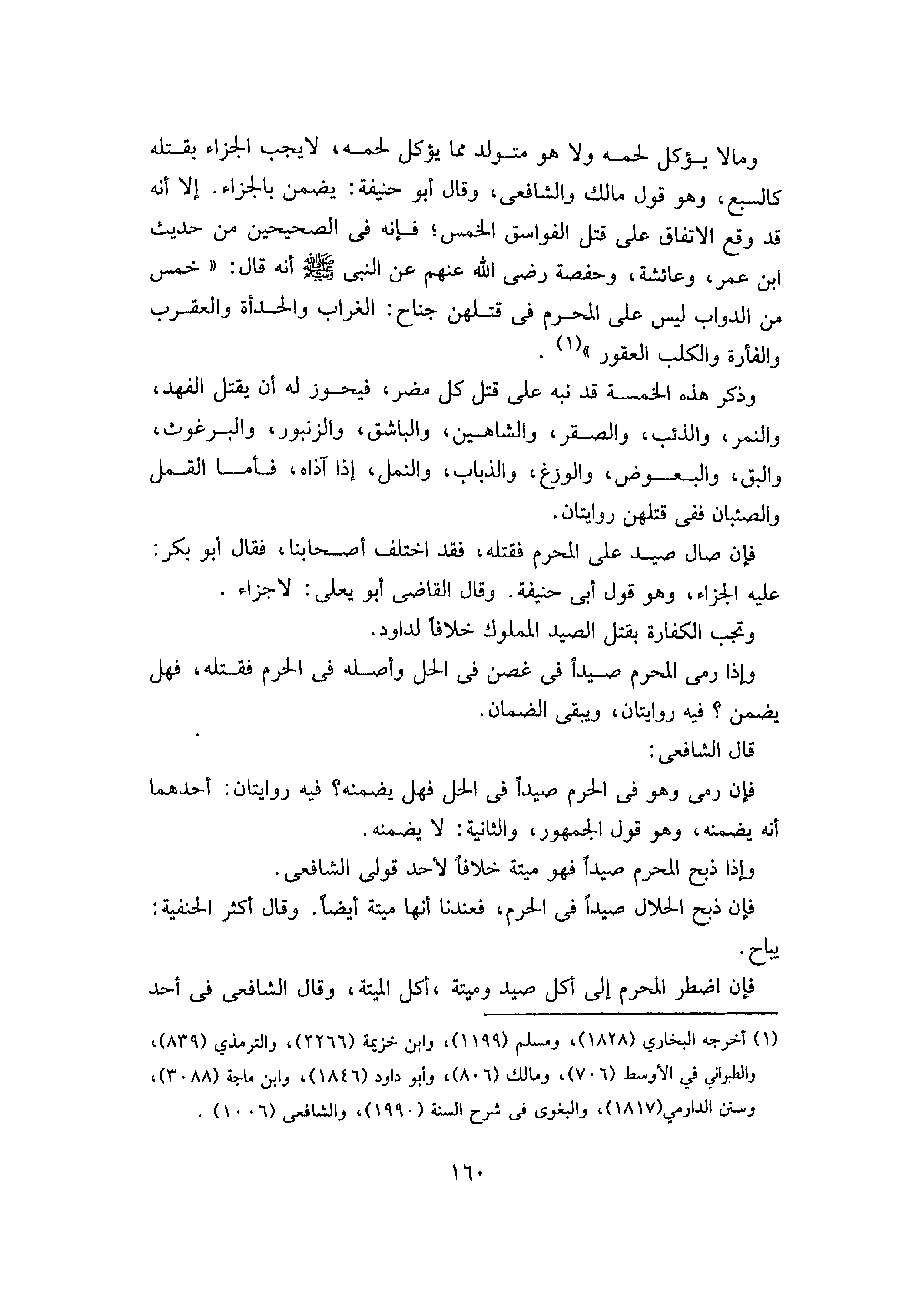وَمَا لا يُؤْكَلُ لَحْمُهُ وَلا هُوَ مُتَوَلِّدٌ مِمَّا يُؤْكَلُ لَحْمُهُ، لا يَجِبُ الْجَزَاءُ بِقَتْلِهِ كَالسَّبُعِ، وَهُوَ قَوْلُ مَالِكٍ، وَالشَّافِعِيِّ، وَقَالَ أَبُو حَنِيفَةَ: يُضْمَنُ بِالْجَزَاءِ، إِلا أَنَّهُ قَدْ وَقَعَ الاتِفَاقُ عَلَى قَتْلِ الْفَوَاسِقِ الْخَمْسِ؛ فَإِنَّهُ فِي الصَّحِيحَيْنِ مِنْ حَدِيثِ ابْنِ عُمَرَ، وَعَائِشَةَ، وَحَفْصَةَ رَضِيَ اللَّهُ عَنْهُمْ، عَنِ النَّبِيِّ صَلَّى اللَّهُ عَلَيْهِ وَسَلَّمَ، أَنَّهُ قَالَ: " خَمْسٌ مِنَ الدَّوَابِّ لَيْسَ عَلَى الْمُحْرِمِ فِي قَتْلِهِنَّ جُنَاحٌ: الْغُرَابُ، وَالْحِدَأَةُ، وَالْعَقْرَبُ، وَالْفَأَرَةُ، وَالْكَلْبُ الْعَقُورُ ".