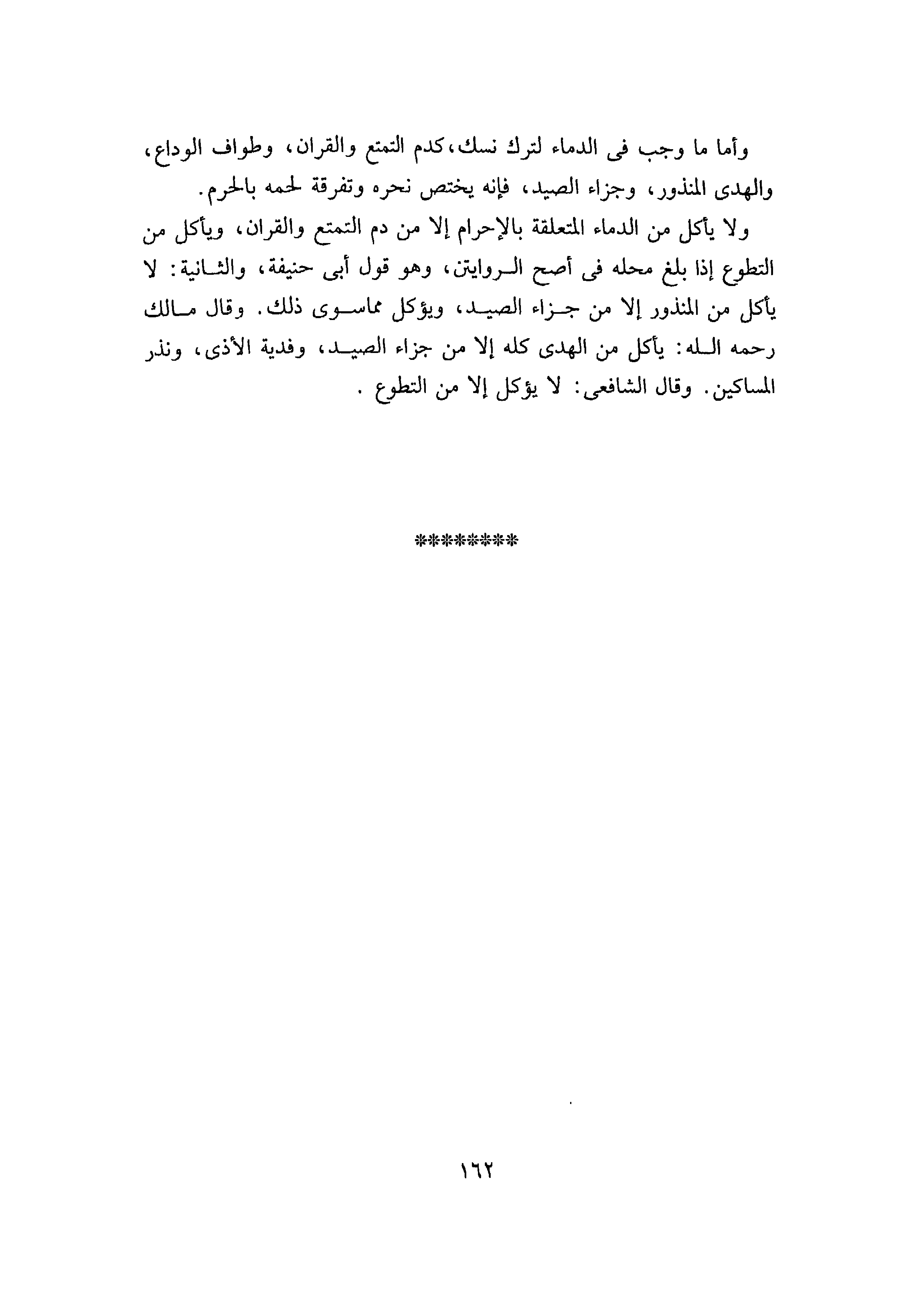 وَلا يَأْكُلُ مِنَ الدِّمَاءِ الْمُتَعَلِّقَةِ بِالْإِحْرَامِ إِلا مِنْ دَمِ التَّمَتُّعِ وَالْقِرَانِ، وَيَأْكُلُ مِنَ التَّطَوُّعِ إِذَا بَلَغَ مَحِلَّهُ فِي أَصَحِّ الرِّوَايَتَيْنِ، وَهُوَ قَوْلُ أَبِي حَنِيفَةَ، وَالثَّانِيَةُ: لا يَأْكُلُ مِنَ الْمَنْذُورِ إِلا مِنْ جَزَاءِ الصَّيْدِ، وَيُؤْكَلُ مِمَّا سِوَى ذَلِكَ.