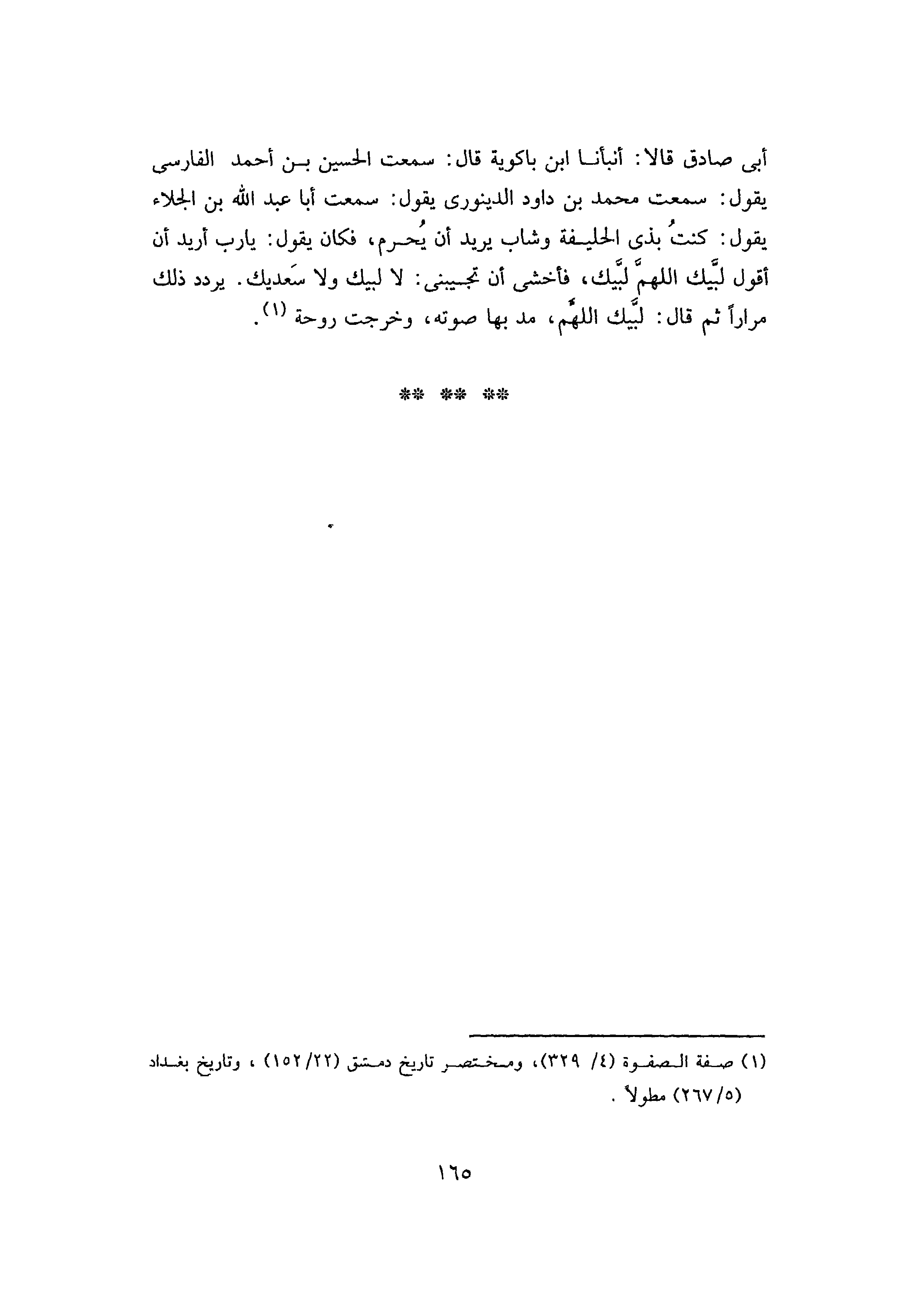 أَبِي صَادِقٍ، قَالا: أَنْبَأَنَا ابْنُ بَاكَوَيْهِ، قَالَ: سَمِعْتُ الْحُسَيْنَ بْنَ أَحْمَدَ الْفَارِسِيَّ، يَقُولُ: سَمِعْتُ مُحَمَّدَ بْنَ دَاوُدَ الدَّيْنَوَرِيَّ، يَقُولُ: سَمِعْتُ أَبَا عَبْدِ اللَّهِ بْنَ الْجَلاءِ، يَقُولُ: " كُنْتُ بِذِي الْحُلَيْفَةِ وَشَابٌّ يُرِيدُ أَنْ يُحْرِمَ، فَكَانَ يَقُولُ: يَا رَبِّ، أُرِيدُ أَنْ أَقُولَ: لَبَّيْكَ اللَّهُمَّ لَبَّيْكَ، فَأَخْشَى أَنْ تُجِيبَنِي: لا لَبَّيْكَ وَلا سَعْدَيْكَ، يُرَدِّدُ ذَلِكَ مِرَارًا، ثُمَّ قَالَ: لَبَّيْكَ اللَّهُمَّ، مَدَّ بِهَا صَوْتَهُ، وَخَرَجَتْ رُوحُهُ «