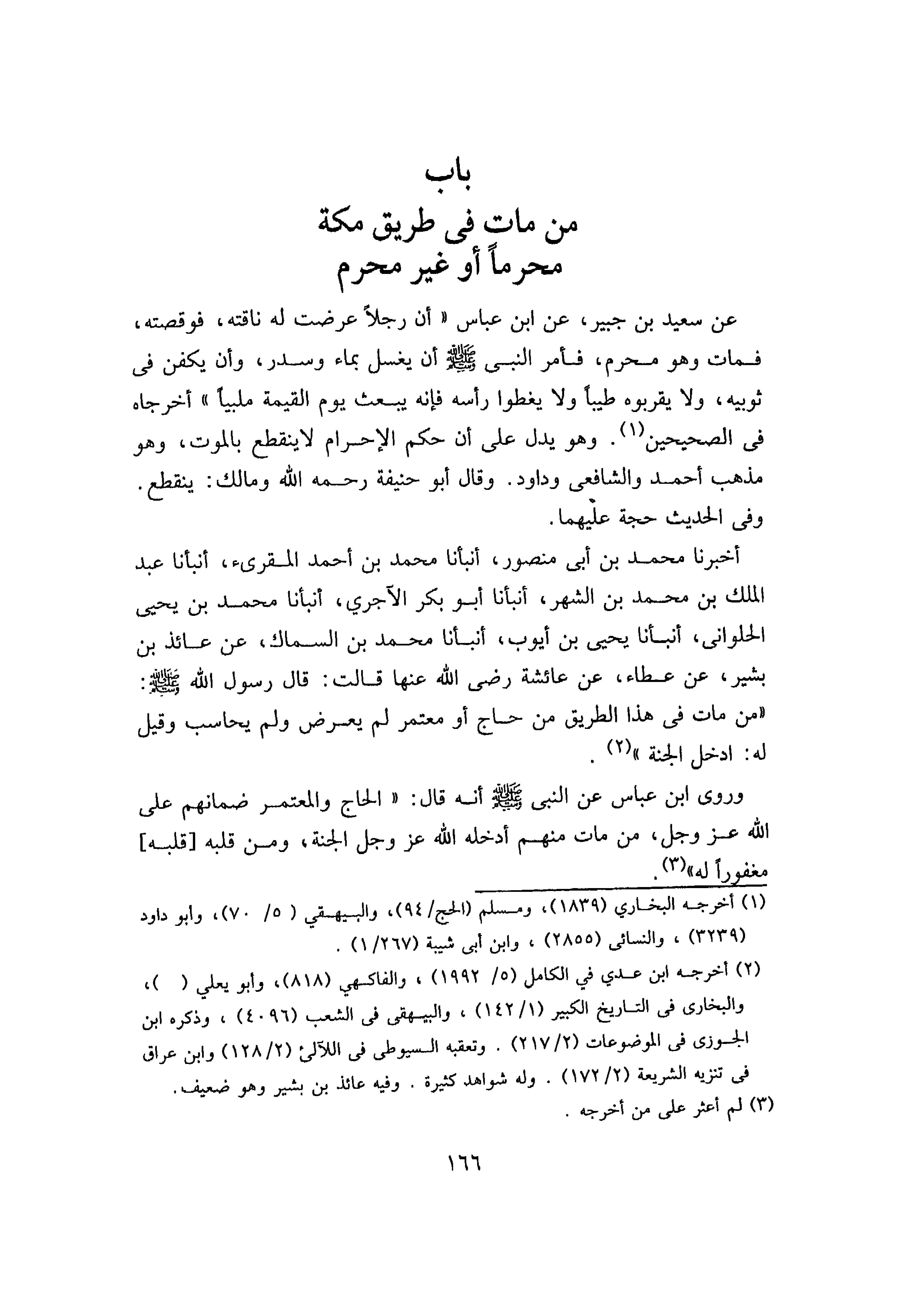 عَنْ سَعِيدِ بْنِ جُبَيْرٍ، عَنِ ابْنِ عَبَّاسٍ،» أَنَّ رَجُلا عَرَضَتْ لَهُ نَاقَتُهُ، فَوَقَصَتْهُ، فَمَاتَ وَهُوَ مُحْرِمٌ، فَأَمَرَ النَّبِيُّ صَلَّى اللَّهُ عَلَيْهِ وَسَلَّمَ أَنْ يُغَسَّلَ بِمَاءٍ وَسِدْرٍ، وَأَنْ يُكَفَّنَ فِي ثَوْبَيْهِ، وَلا يُقَرِّبُوهُ طِيبًا وَلا يُغَطُّوا رَأْسَهُ فَإِنَّهُ يُبْعثُ يَومَ الْقِيَامَةِ مُلَبِّيًا ".