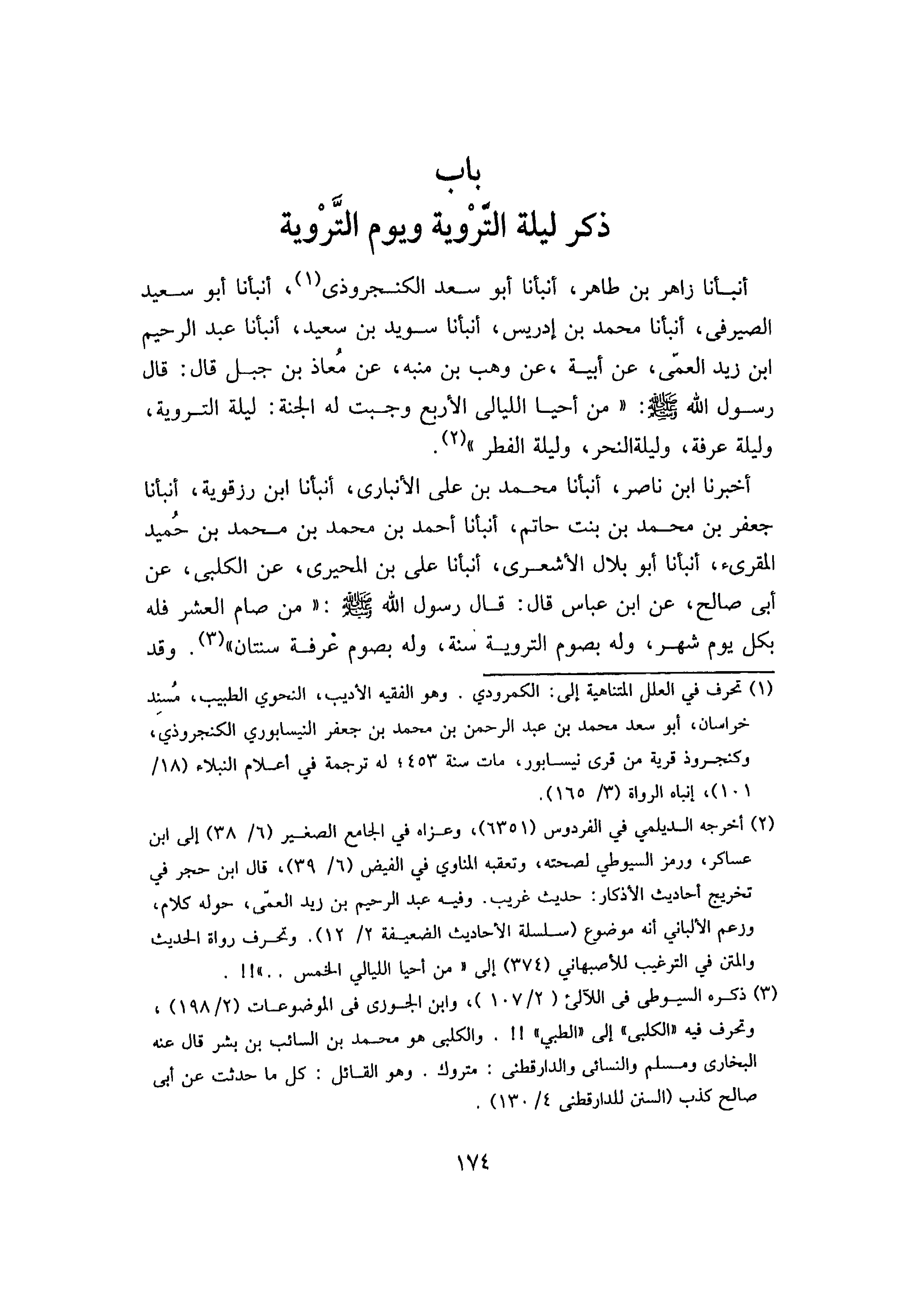 أَنْبَأَنَا زَاهِرُ بْنُ طَاهِرٍ، أَنْبَأَنَا أَبُو سَعْدٍ الْكَنْجَرُوذِيُّ، أَنْبَأَنَا أَبُو سَعِيدٍ الصَّيْرَفِيُّ، أَنْبَأَنَا مُحَمَّدُ بْنُ إِدْرِيسَ، أَنْبَأَنَا سُوَيْدُ بْنُ سَعِيدٍ، أَنْبَأَنَا عَبْدُ الرَّحِيمِ بْنُ زَيْدٍ الْعَمِّيُّ، عَنْ أَبِيهِ، عَنْ وَهْبِ بْنِ مُنَبِّهٍ، عَنْ مُعَاذِ بْنِ جَبَلٍ، قَالَ: قَالَ رَسُولُ اللَّهِ صَلَّى اللَّهُ عَلَيْهِ وَسَلَّمَ: " مَنْ أَحْيَا الْلَيَالِيَ الْأَرْبَعَ وَجَبَتْ لَهُ الْجَنَّةُ: لَيْلَةَ التَّرْوِيَةِ، وَلَيْلَةَ عَرَفَةَ، وَلَيْلَةَ النَّحْرِ، وَلَيْلَةَ الْفِطْرِ "