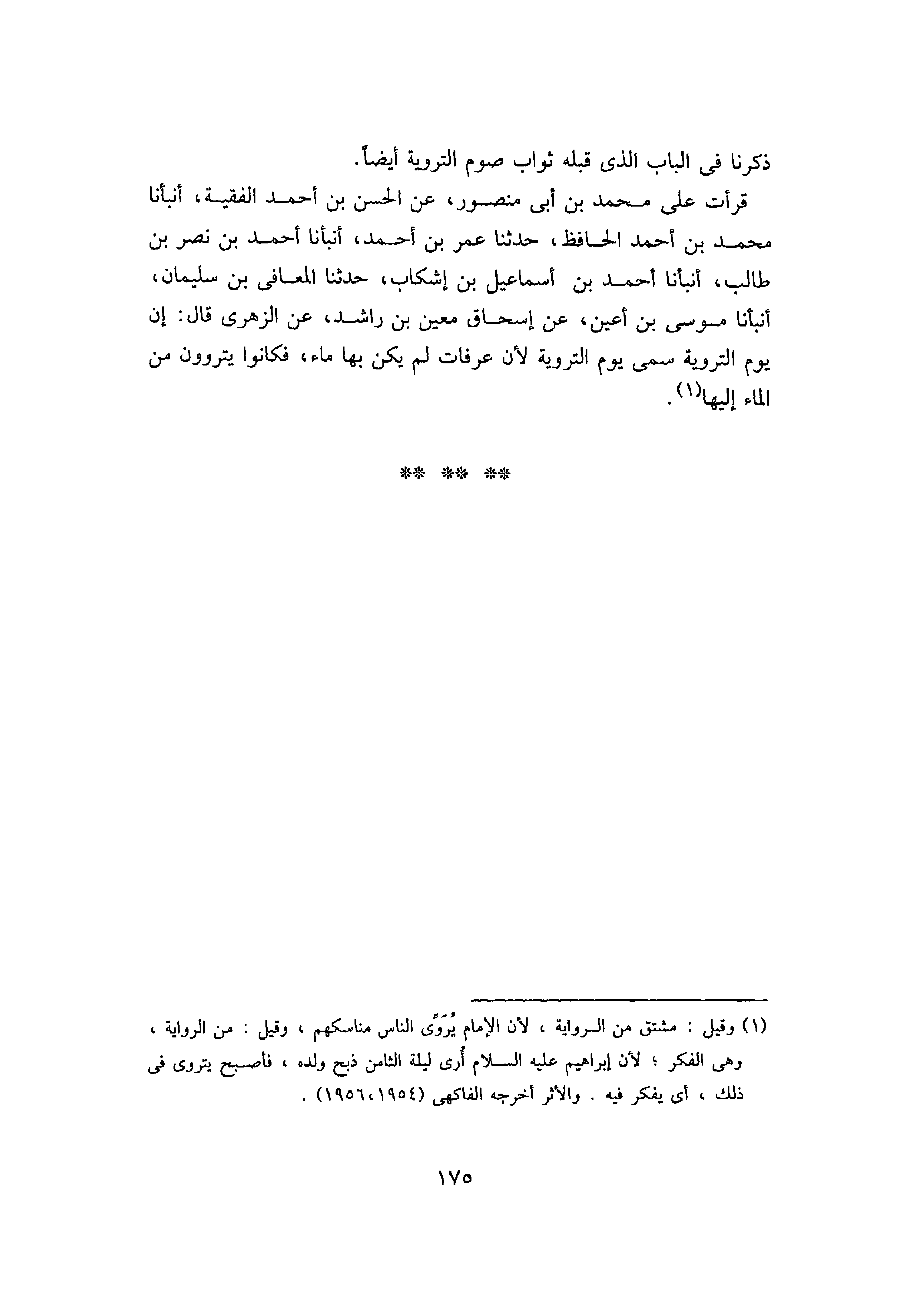 قَرَأْتُ عَلَى مُحَمَّدِ بْنِ أَبِي مَنْصُورٍ، عَنِ الْحَسَنِ بْنِ أَحْمَدَ الْفَقِيهِ، أَنْبَأَنَا مُحَمَّدُ بْنُ أَحْمَدَ الْحَافِظُ، حَدَّثَنَا عُمَرُ بْنُ أَحْمَدَ، أَنْبَأَنَا أَحْمَدُ بْنُ نَصْرِ بْنِ طَالِبٍ، أَنْبَأَنَا أَحْمَدُ بْنُ إِسْمَاعِيلَ بْنِ إِشْكَابٍ، حَدَّثَنَا الْمُعَافَى بْنُ سُلَيْمَانَ، أَنْبَأَنَا مُوسَى بْنُ أَعْيَنَ، عَنْ إِسْحَاقَ بن مَعِينِ بْنِ رَاشِدٍ، عَنِ الزُّهْرِيِّ، قَالَ: «إِنَّ يَوْمَ التَّرْوِيَةِ سُمِّيَّ يَوْمُ التَّرْوِيَةِ، لِأَنَّ عَرَفَاتٍ لَمْ يَكُنْ بِهَا مَاءٌ، فَكَانُوا يَتَرَوُّونَ مِنَ الْمَاءِ إِلَيْهَا»