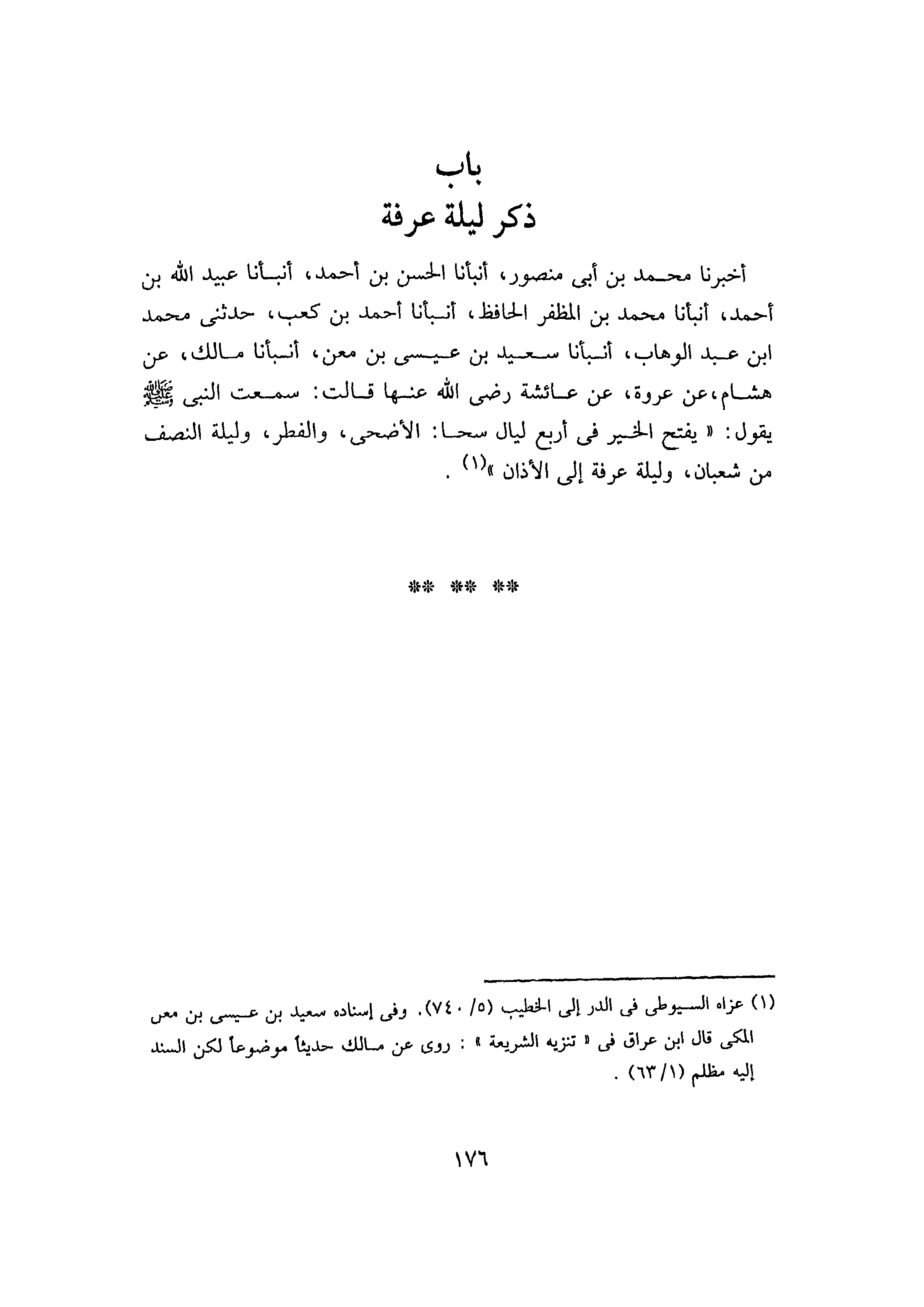 أَخْبَرَنَا مُحَمَّدُ بْنُ أَبِي مَنْصُورٍ، أَنْبَأَنَا الْحَسَنُ بْنُ أَحْمَدَ، أَنْبَأَنَا عُبَيْدُ اللَّهِ بْنُ أَحْمَدَ، أَنْبَأَنَا مُحَمَّدُ بْنُ الْمُظَفَّرِ الْحَافِظُ، أَنْبَأَنَا أَحْمَدُ بْنُ كَعْبٍ، حَدَّثَنِي مُحَمَّدُ بْنُ عَبْدِ الْوَهَّابِ، أَنْبَأَنَا سَعِيدُ بْنُ عِيسَى بْنِ مَعِنٍ، أَنْبَأَنَا مَالِكٌ، عَنْ هِشَامٍ، عَنْ عُرْوَةَ، عَنْ عَائِشَةَ رَضِيَ اللَّهُ عَنْهَا، قَالَتْ: سَمِعْتُ النَّبِيَّ صَلَّى اللَّهُ عَلَيْهِ وَسَلَّمَ، يَقُولُ: " يُفْتَحُ الْخَيْرُ فِي أَرْبَعِ لَيَالٍ سَحًّا: الْأَضْحَى، وَالْفِطْرِ، وَلَيْلَةِ النِّصْفِ مِنْ شَعْبَانَ، وَلَيْلَةِ عَرَفَةَ إِلَى الْأَذَانِ "