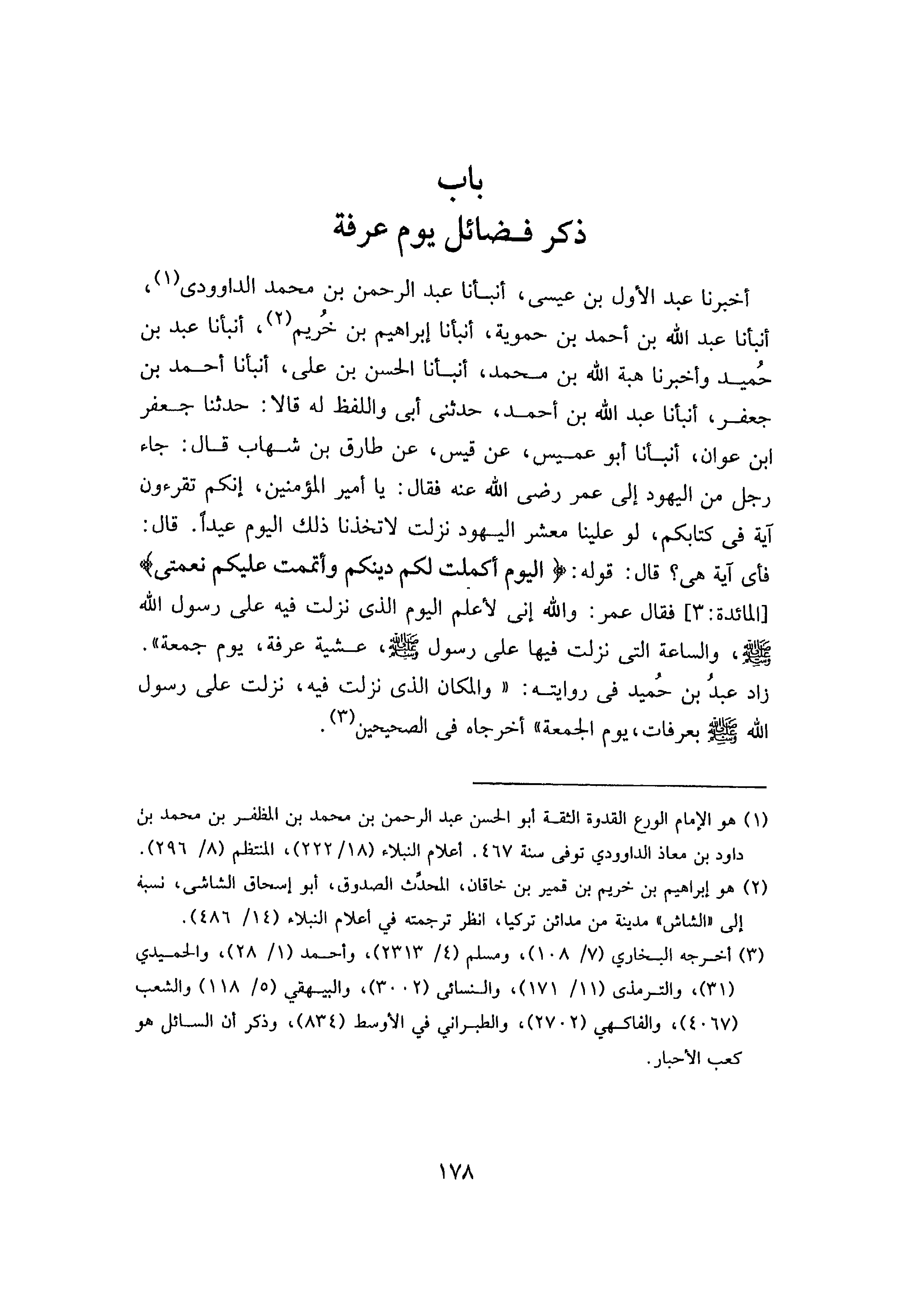 أَخْبَرَنَا عَبْدُ الْأَوَّلِ بْنُ عِيسَى، أَنْبَأَنَا عَبْدُ الرَّحْمَنِ بْنُ مُحَمَّدٍ الدَّاوُدِيُّ، أَنْبَأَنَا عَبْدُ اللَّهِ بْنُ أَحْمَدَ بْنِ حَمُّوَيْهِ، أَنْبَأَنَا إِبْرَاهِيمُ بْنُ خُرَيْمٍ، أَنْبَأَنَا عَبْدُ بْنُ حُمَيْدٍ، وَأَخْبَرَنَا هِبَةُ اللَّهِ بْنُ مُحَمَّدٍ، أَنْبَأَنَا الْحَسَنُ بْنُ عَلِيٍّ، أَنْبَأَنَا أَحْمَدُ بْنُ جَعْفَرٍ، أَنْبَأَنَا عَبْدُ اللَّهِ بْنُ أَحْمَدَ، حَدَّثَنِي أَبِي، وَاللَّفْظُ لَهُ، قَالا: حَدَّثَنَا جَعْفَرُ بْنُ عَوْنٍ، أَنْبَأَنَا أَبُو عُمَيْسٍ، عَنْ قَيْسٍ، عَنْ طَارِقِ بْنِ شِهَابٍ، قَالَ: جَاءَ رَجُلٌ مِنَ الْيَهُودِ إِلَى عُمَرَ رَضِيَ اللَّهُ عَنْهُ، فَقَالَ: يَا أَمِيرَ الْمُؤْمِنِينَ، إِنَّكُمْ تَقْرَءُونَ آيَةً فِي كِتَابِكُمْ، لَوْ عَلَيْنَا مَعْشَرَ الْيَهُودِ نَزَلَتْ لاتَّخَذْنَا ذَلِكَ الْيَوْمَ عِيدًا.