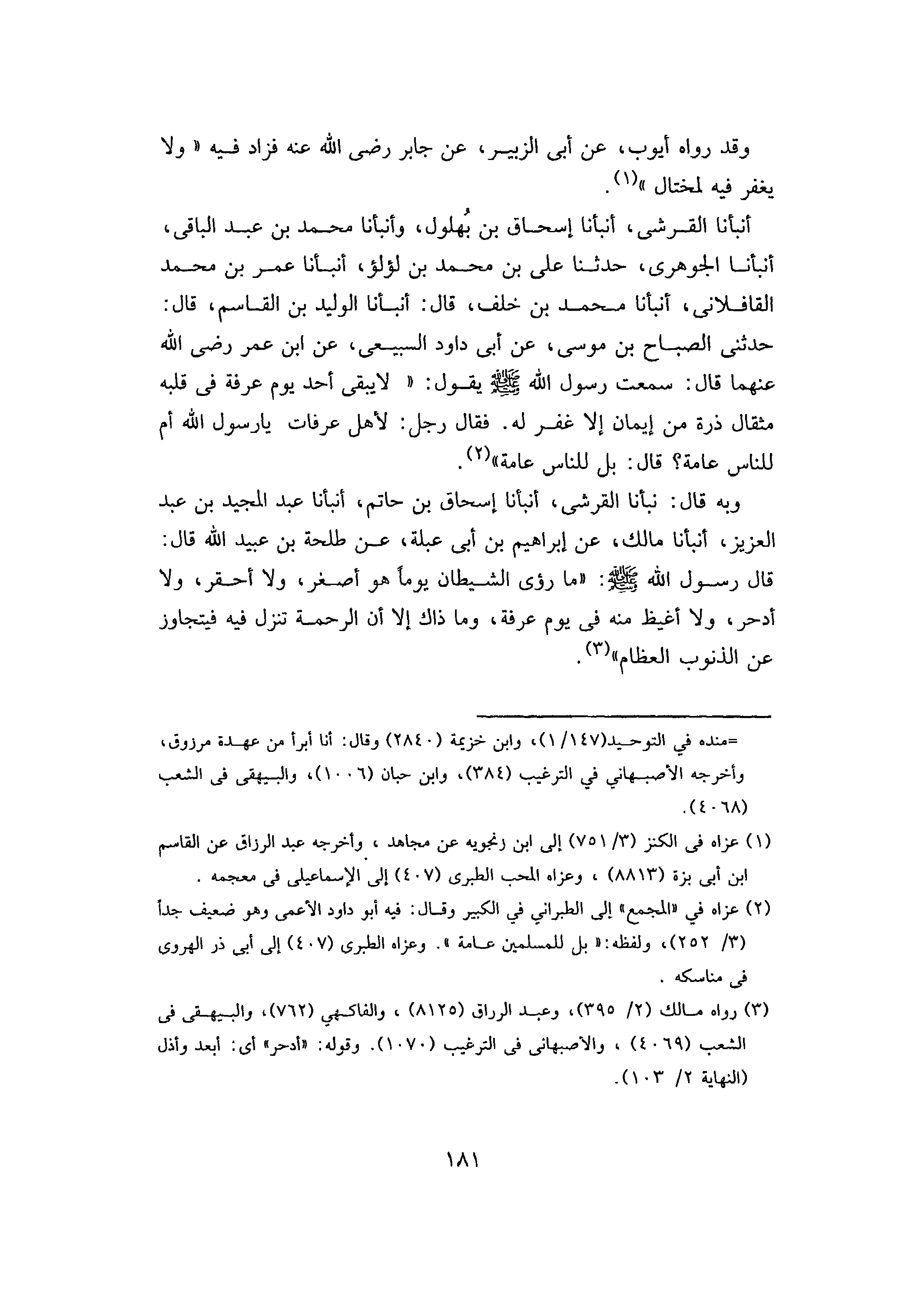 أَنْبَأَنَا الْقُرَشِيُّ، أَنْبَأَنَا إِسْحَاقُ بْنُ بُهْلُولٍ، وَأَنْبَأَنَا مُحَمَّدُ بْنُ عَبْدِ الْبَاقِي، أَنْبَأَنَا الْجَوْهَرِيُّ، حَدَّثَنَا عَلِيُّ بْنُ مُحَمَّدِ بْنِ لُؤْلُؤٍ، أَنْبَأَنَا عُمَرُ بْنُ مُحَمَّدٍ الْقَافْلانِيُّ، أَنْبَأَنَا مُحَمَّدُ بْنُ خَلَفٍ، قَالَ: أَنْبَأَنَا الْوَلِيدُ بْنُ الْقَاسِمِ، قَالَ: حَدَّثَنِي الصَّبَّاحُ بْنُ مُوسَى، عَنْ أَبِي دَاوُدَ السَّبِيعِيِّ، عَنِ ابْنِ عُمَرَ رَضِيَ اللَّهُ عَنْهُمَا، قَالَ: سَمِعْتُ رَسُولَ اللَّهِ صَلَّى اللَّهُ عَلَيْهِ وَسَلَّمَ، يَقُولُ: «لا يَبْقَى أَحَدٌ يَوْمَ عَرَفَةَ فِي قَلْبِهِ مِثْقَالُ ذَرَّةٍ مِنْ إِيمَانٍ إِلا غُفِرَ لَهُ» .