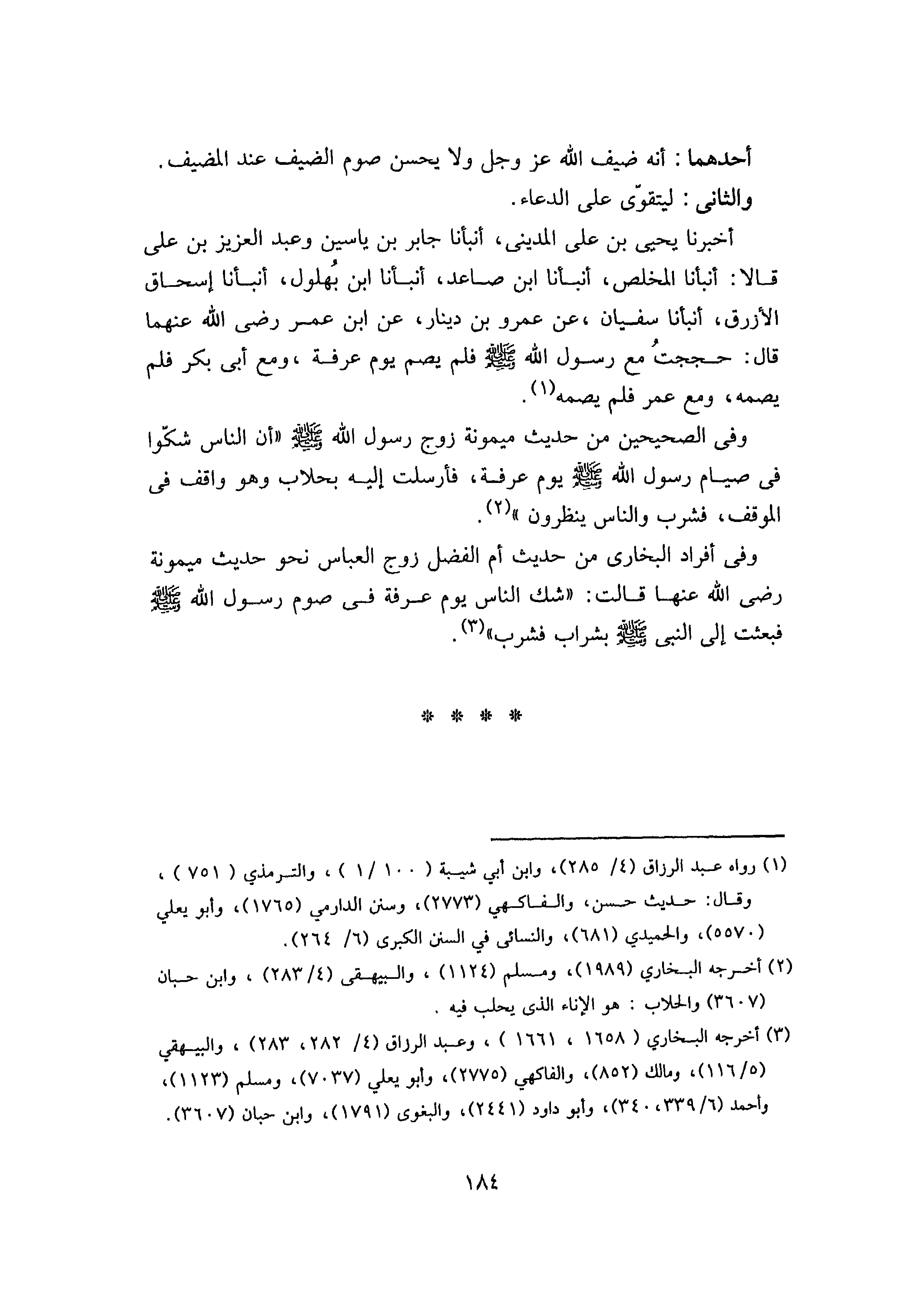 وَفِي الصَّحِيحَيْنِ مِنْ حَدِيثِ مَيْمُونَةَ زَوْجِ رَسُولِ اللَّهِ صَلَّى اللَّهُ عَلَيْهِ وَسَلَّمَ: «أَنَّ النَّاسَ شَكُّوا فِي صِيَامِ رَسُولِ اللَّهِ صَلَّى اللَّهُ عَلَيْهِ وَسَلَّمَ يَوْمَ عَرَفَةَ، فَأَرْسَلْتُ إِلَيْهِ بِحِلابٍ وَهُوَ وَاقِفٌ فِي الْمَوْقِفِ، فَشَرِبَ وَالنَّاسُ يَنْظُرُونَ» .