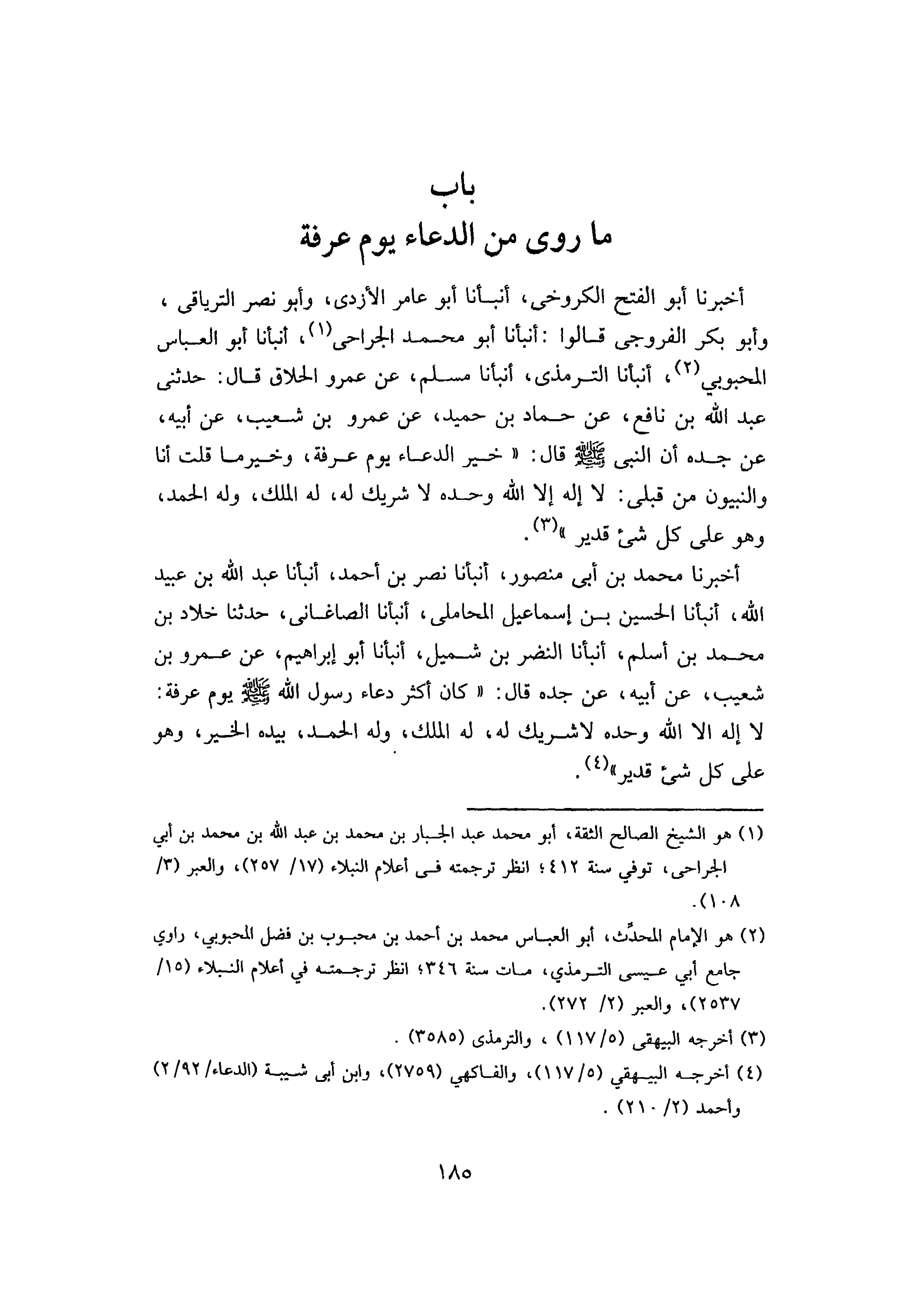 أَخْبَرَنَا مُحَمَّدُ بْنُ أَبِي مَنْصُورٍ، أَنْبَأَنَا نَصْرُ بْنُ أَحْمَدَ، أَنْبَأَنَا عَبْدُ اللَّهِ بْنُ عُبَيْدِ اللَّهِ، أَنْبَأَنَا الْحُسَيْنُ بْنُ إِسْمَاعِيلَ الْمَحَامِلِيُّ، أَنْبَأَنَا الصَّاغَانِيُّ، حَدَّثَنَا خَلادُ بْنُ مُحَمَّدِ بْنِ أَسْلَمَ، أَنْبَأَنَا النَّضْرُ بْنُ شُمَيْلٍ، أَنْبَأَنَا أَبُو إِبْرَاهِيمَ، عَنْ عَمْرِو بْنِ شُعَيْبٍ، عَنْ أَبِيهِ، عَنْ جَدِّهِ، قَالَ: كَانَ أَكْثَرُ دُعَاءِ رَسُولِ اللَّهِ صَلَّى اللَّهُ عَلَيْهِ وَسَلَّمَ يَوْمَ عَرَفَةَ: «لا إِلَهَ إِلا اللَّهُ وَحْدَهُ لا شَرِيكَ لَهُ، لَهُ الْمُلْكُ، وَلَهُ الْحَمْدُ، بِيَدِهِ الْخَيْرُ، وَهُوَ عَلَى كُلِّ شَيْءٍ قَدِيرٌ»