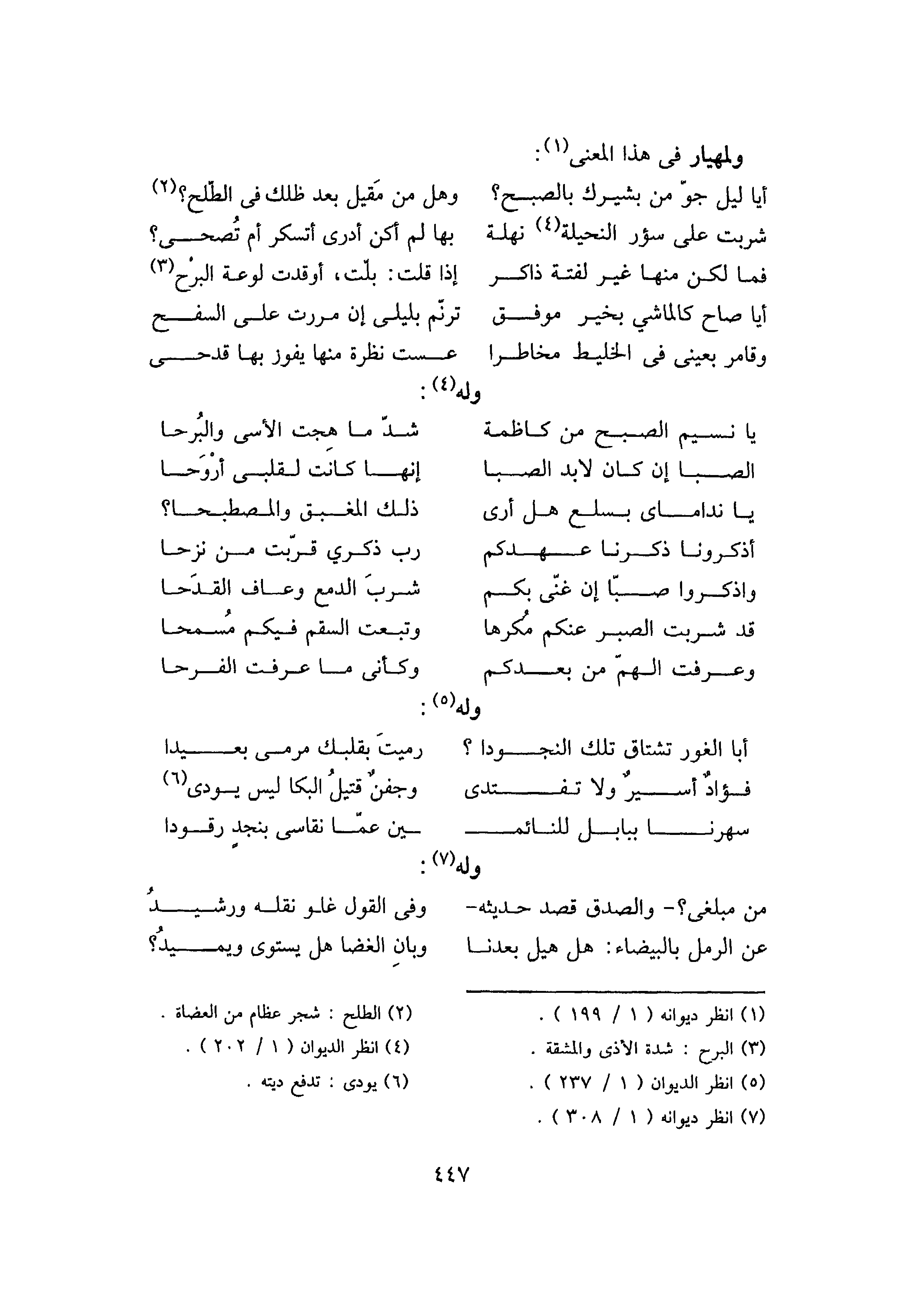 أَيَا لَيْلَ جَوٍّ مَنْ بَشَيِرُكَ بِالصُّبْحِ؟ ... وَهَلْ مِنْ مَقِيلٍ بَعْدَ ظِلِّكَ فِي الطَّلْحِ؟