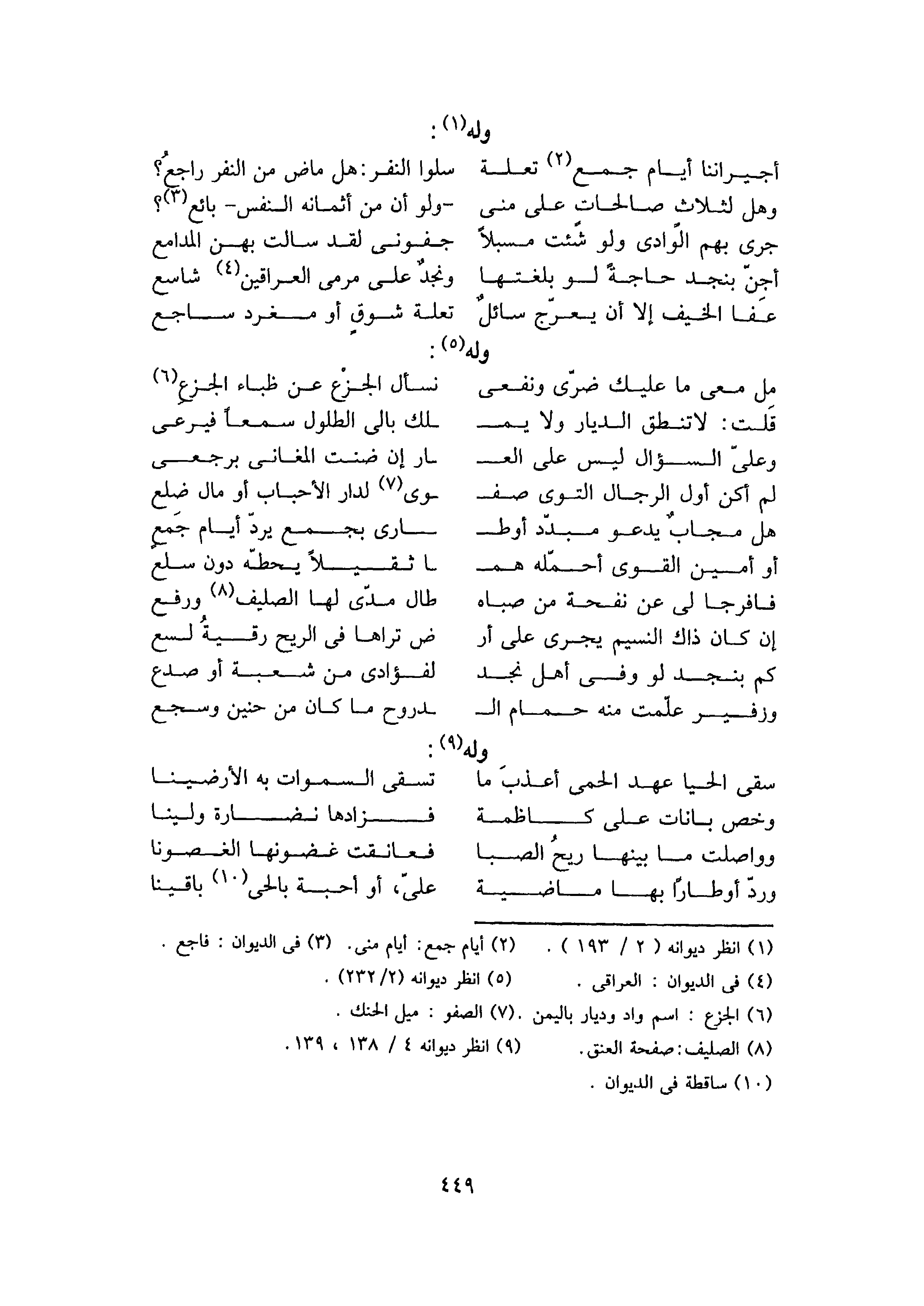 أَجِيرَانَنَا أَيَّامَ جَمْعٍ تَعِلَّةً ... سَلُوا النَّفْرَ: هَلْ مَاضٍ مِنَ النَّفْرِ رَاجِعُ؟