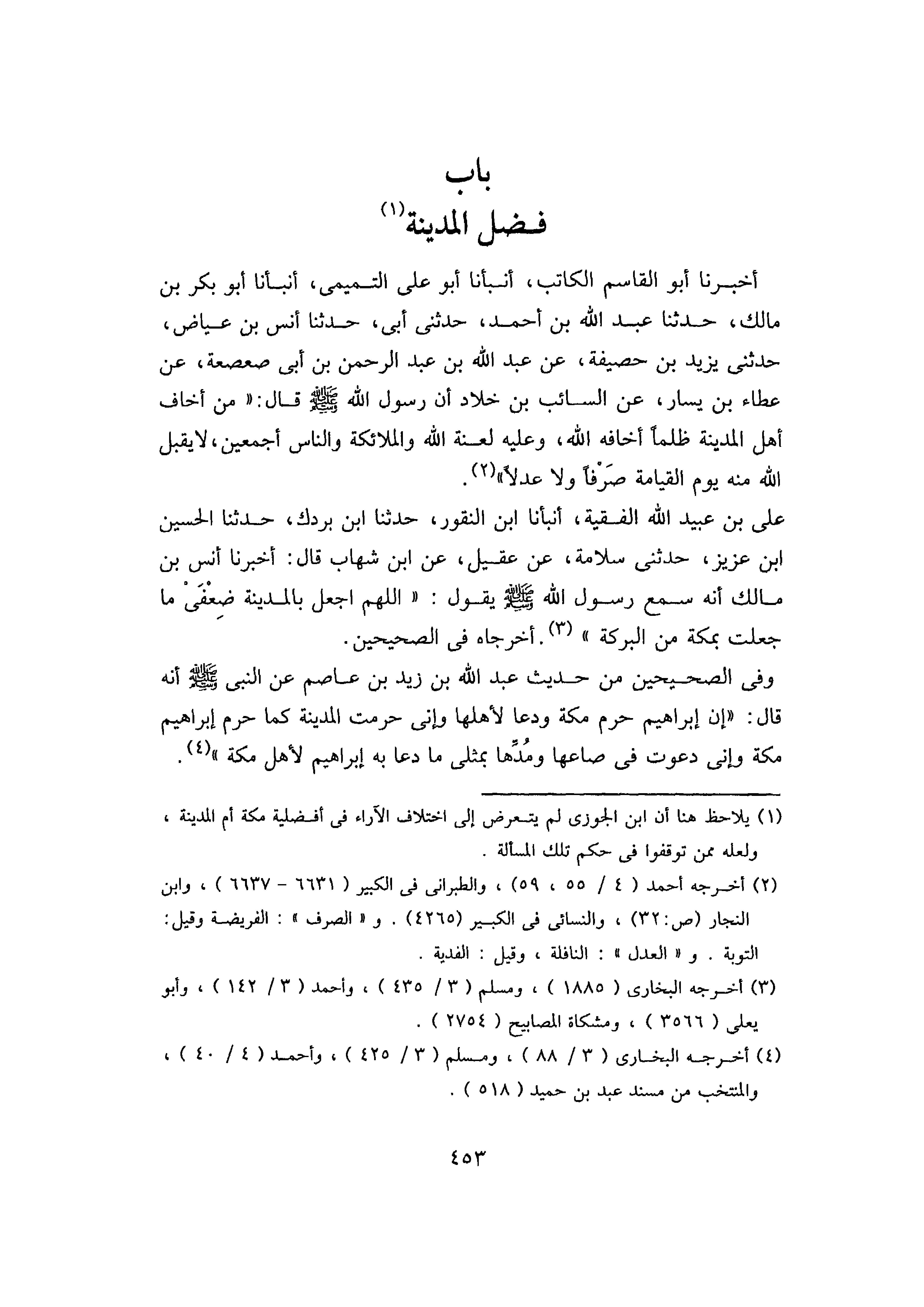 أَخْبَرَنَا أَبُو الْقَاسِمِ الْكَاتِبُ أَنْبَأنَا أَبُو عَلِيٍّ التَّمِيمِيُّ أَنْبَأنَا أَبُو بَكْرِ بْنُ مَالِكٍ حَدَّثَنَا عَبْدُ اللَّهِ بْنُ أَحْمَدَ، حَدَّثَنِي أَبِي، حَدَّثَنَا أَنَسُ بْنُ عِيَاضٍ، حَدَّثَنِي يَزِيدُ بْنُ حَصِيفَةَ، عَنْ عَبْدِ اللَّهِ بْنِ عَبْدِ الرَّحْمَنِ بْنِ أَبِي صَعْصَعَةَ، عَنْ عَطَاءِ بْنِ يَسَارٍ، عَنِ السَّائِبِ بْنِ خَلادٍ، أَنّ رَسُول اللَّهِ صَلَّى اللَّهُ عَلَيْهِ وَسَلَّمَ، قَالَ: «مَنْ أَخَافَ أَهْلَ الْمَدِينَةِ ظُلْمًا أَخَافَهُ اللَّهُ، وَعَلَيْهِ لَعْنَةُ اللَّهِ وَالْمَلائِكَةِ وَالنَّاسِ أَجْمَعِينَ.