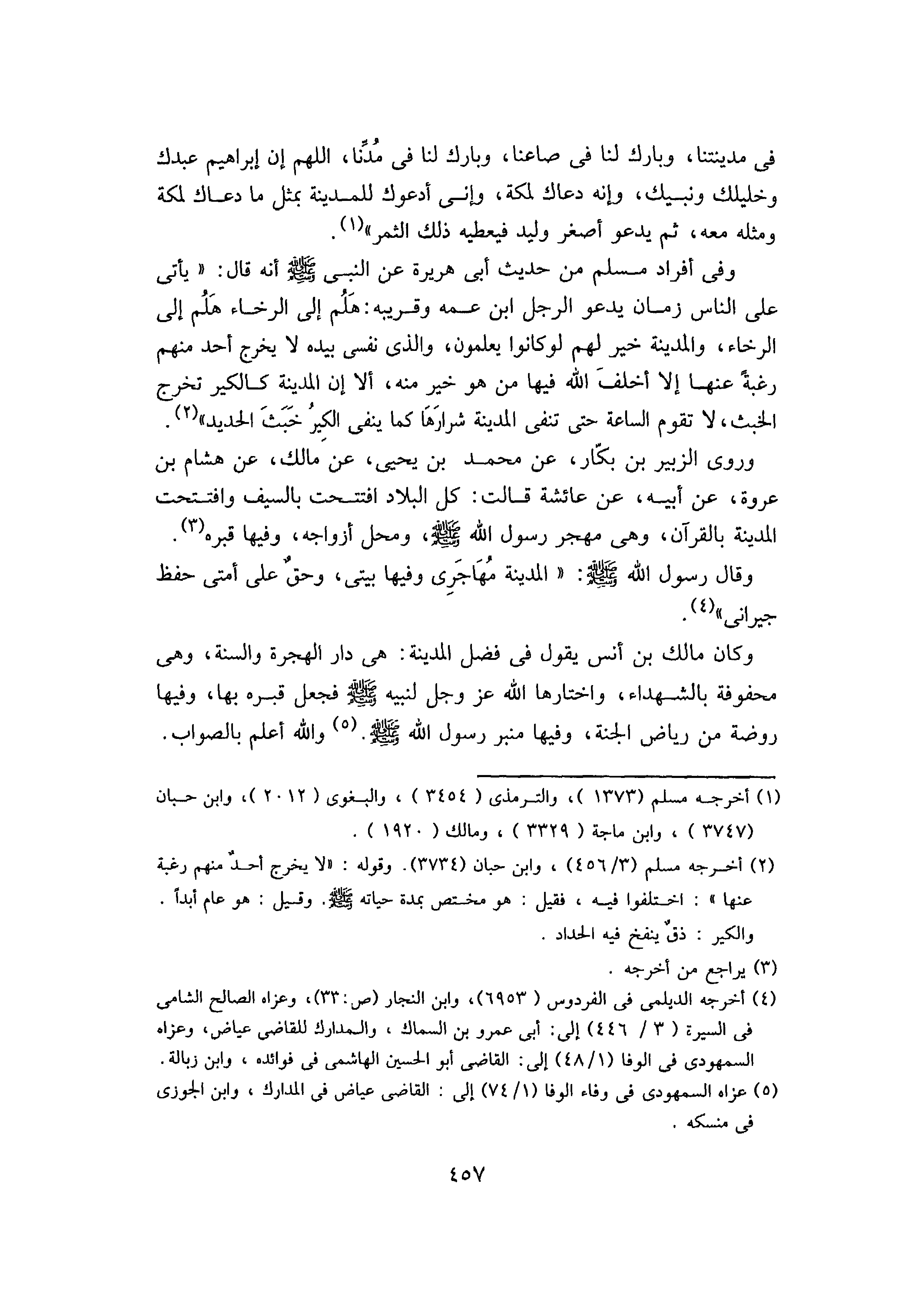 وَكَانَ مَالِكُ بْنُ أَنَسٍ يَقُولُ فِي فَضْلِ الْمَدِينَةِ: هِيَ دَارُ الْهِجْرَةِ وَالسُّنَّةِ، وَهِيَ مَحْفُوفَةٌ بِالشُّهَدَاءِ، وَاخْتَارَهَا اللَّهُ عَزَّ وَجَلَّ لِنَبِيِّهِ صَلَّى اللَّهُ عَلَيْهِ وَسَلَّمَ فَجَعَلَ قَبْرَهُ بِهَا، وَفِيهَا رَوْضَةٌ مِنْ رِيَاضِ الْجَنَّةِ، وَفِيهَا مِنْبَرُ رَسُولِ اللَّهِ صَلَّى اللَّهُ عَلَيْهِ وَسَلَّمَ، وَاللَّهُ أَعْلَمُ بِالصَّوَابِ.