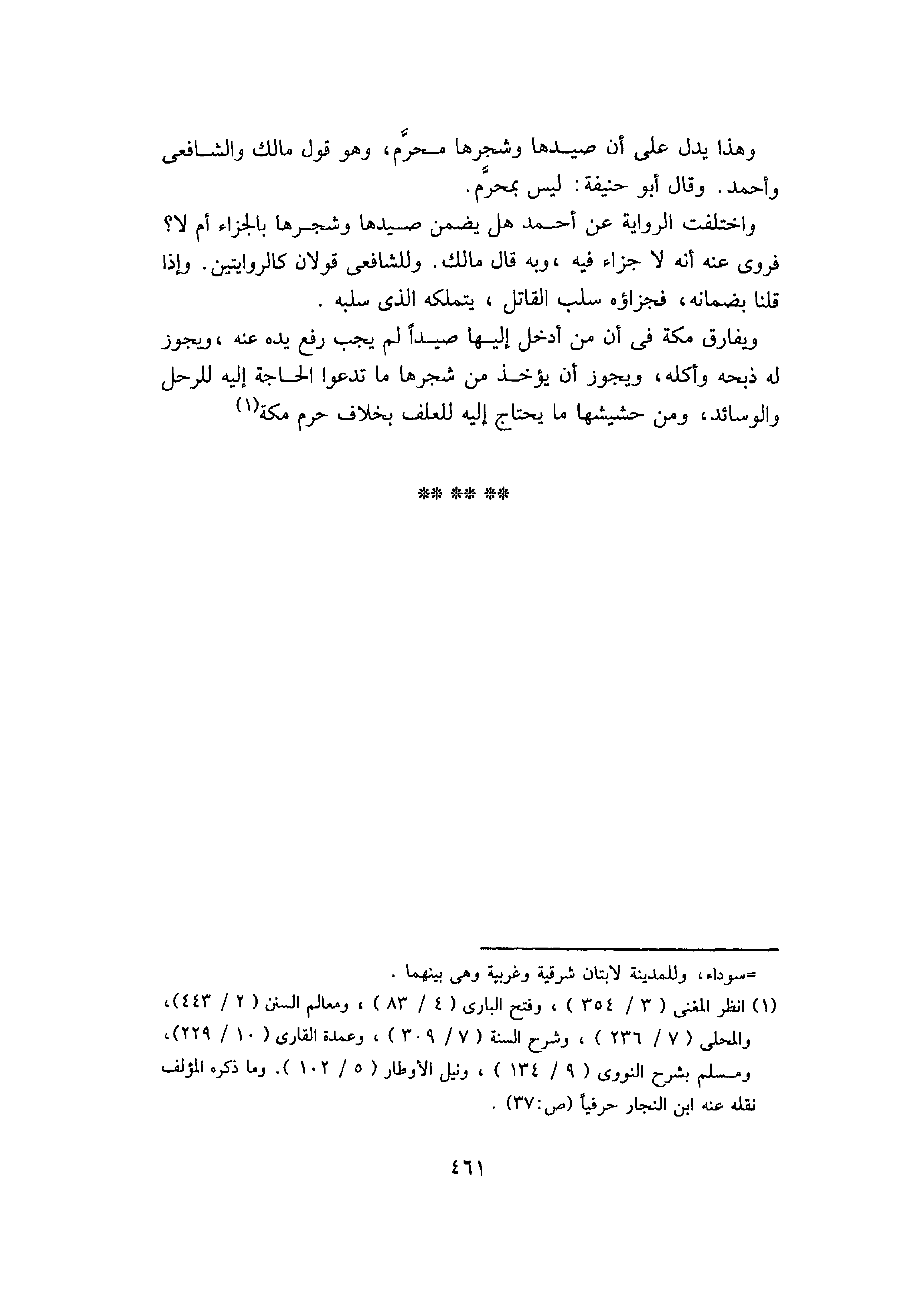 وَاخْتَلَفَتِ الرِّوَايَةُ عَنْ أَحْمَدَ، هَلْ يُضْمَنُ صَيْدُهَا وَشَجَرُهَا بِالْجَزَاءِ أَمْ لا؟ فَرُوِيَ عَنْهُ أَنَّهُ لا جَزَاءَ فِيهِ، وَبِهِ قَالَ مَالِكٌ، وَلِلشَّافِعِيِّ قَوْلانِ كَالرِّوَايَتَيْنِ، وَإِذَا قُلْنَا بِضَمَانِهِ، فَجَزَاؤُهُ سَلَبُ الْقَاتِلِ، يَتَمَلَّكُهُ الَّذِي سَلَبَهُ.