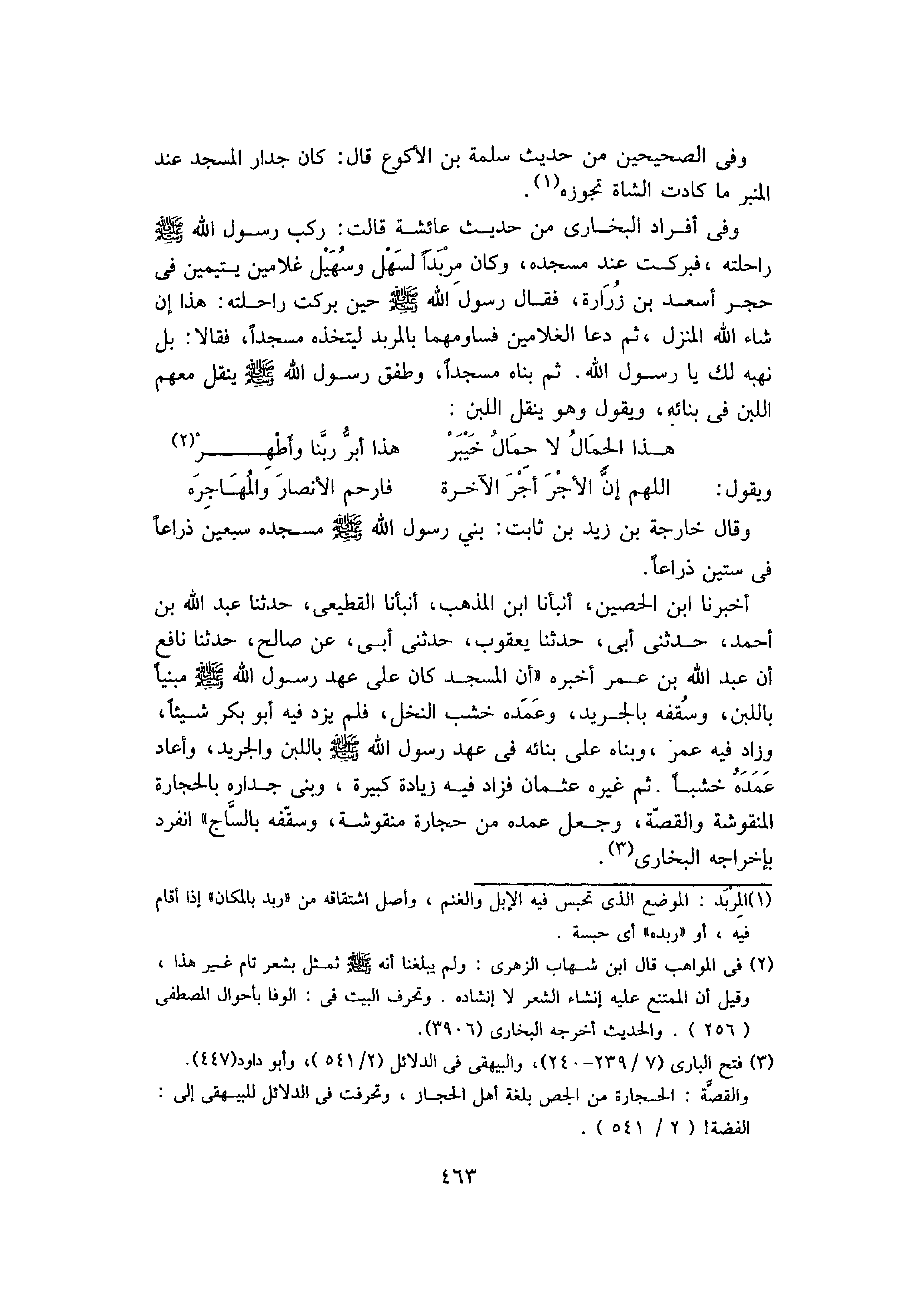 أَخْبَرَنَا ابْنُ الْحُصَيْنِ، أَنْبَأنَا ابْنُ الْمُذْهَبِ، أَنْبَأنَا الْقَطِيعِيُّ، حَدَّثَنَا عَبْدُ اللَّهِ بْنُ أَحْمَدَ، حَدَّثَنِي أَبِي، حَدَّثَنَا يَعْقُوبُ، حَدَّثَنِي أَبِي، عَنْ صَالِحٍ، حَدَّثَنَا نَافِعٌ، أَنَّ عَبْدَ اللَّهِ بْنَ عُمَرَ أَخْبَرَهُ، «أَنَّ الْمَسْجِدَ كَانَ عَلَى عَهْدِ رَسُولِ اللَّهِ صَلَّى اللَّهُ عَلَيْهِ وَسَلَّمَ مَبْنِيًّا بِاللَّبِنِ، وَسُقُفُهُ بِالْجَرِيدِ، وَعُمُدُهُ خَشَبُ النَّخْلِ، فَلَمْ يَزِدْ فِيهِ أَبُو بَكْرٍ شَيْئًا، وَزَادَ فِيهِ عُمَرُ، وَبَنَاهُ عَلَى بِنَائِهِ فِي عَهْدِ رَسُولِ اللَّهِ صَلَّى اللَّهُ عَلَيْهِ وَسَلَّمَ بِاللَّبِنِ وَالْجَرِيدِ، وَأَعَادَ عُمُدَهُ خَشَبًا، ثُمَّ غَيَّرَهُ عُثْمَانُ فَزَادَ فِيهِ زِيَادَةً كَبِيرَةً، وَبَنَى جِدَارَهُ بِالْحِجَارَةِ الْمَنْقُوشَةِ وَالْقَصَّةِ، وَجَعَلَ عُمُدَهُ مِنْ حِجَارَةٍ مَنْقُوشَةٍ، وَسُقُفَهُ بِالسَّاجِ» .
