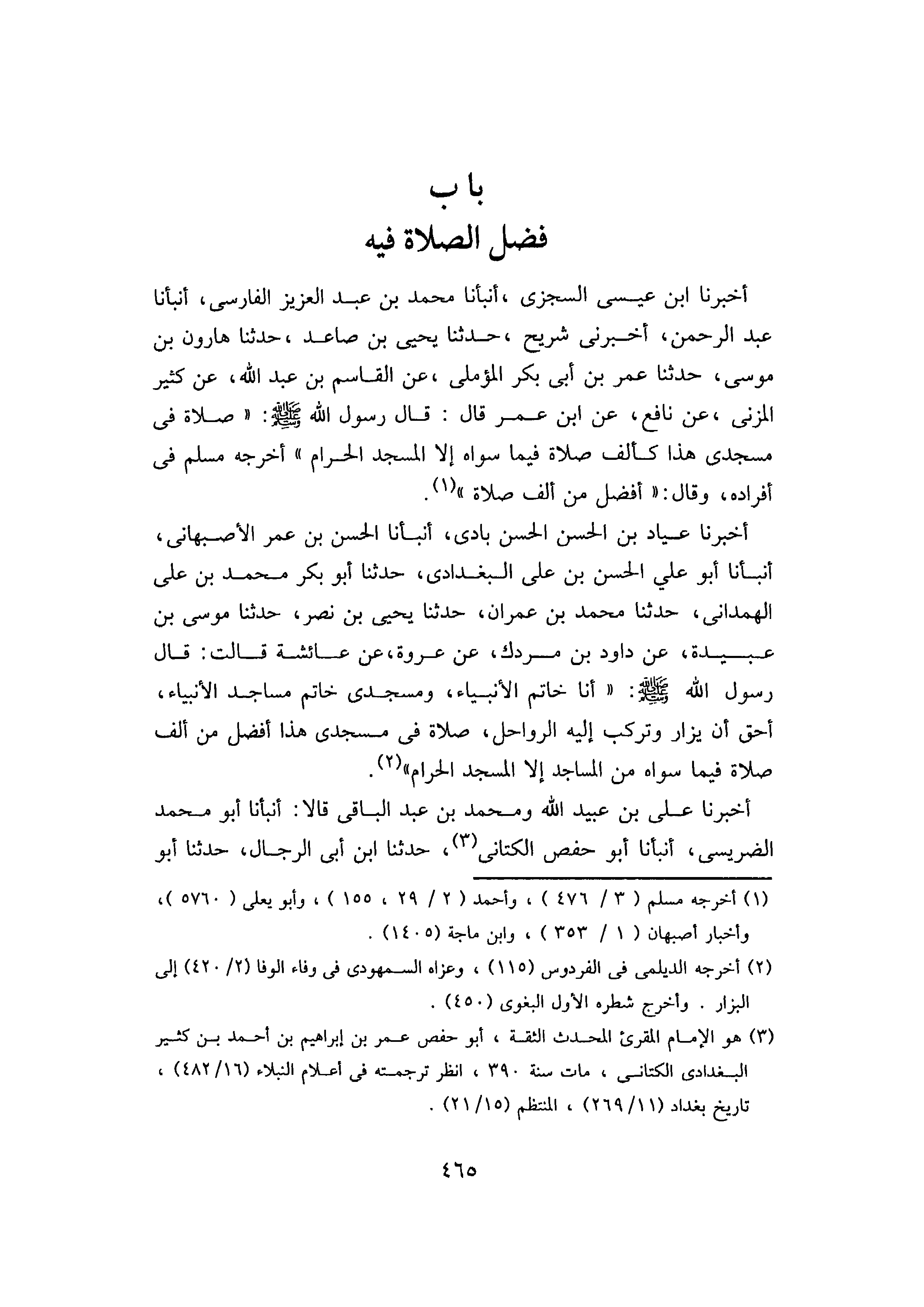 أَخْبَرَنَا ابْنُ عِيسَى السِّجْزِيُّ، أَنْبَأنَا مُحَمَّدُ بْنُ عَبْدِ الْعَزِيزِ الْفَارِسِيُّ، أَنْبَأنَا عَبْدُ الرَّحْمَنِ، أَخْبَرَنِي شُرَيْحٌ، حَدَّثَنَا يَحْيَى بْنُ صَاعِدٍ، حَدَّثَنَا هَارُونُ بْنُ مُوسَى، حَدَّثَنَا عُمَرُ بْنُ أَبِي بَكْرٍ الْمُؤَمَّلِيُّ، عَنِ الْقَاسِمِ بْنِ عَبْدِ اللَّهِ، عَنْ كَثِيرٍ الْمُزَنِيِّ، عَنْ نَافِعٍ، عَنِ ابْنِ عُمَرَ، قَالَ: قَالَ رَسُولُ اللَّهِ صَلَّى اللَّهُ عَلَيْهِ وَسَلَّمَ: «صَلاةٌ فِي مَسْجِدِي هَذَا كَأَلْفِ صَلاةٍ فِيمَا سِوَاهُ إِلا الْمَسْجِدَ الْحَرَامَ» .