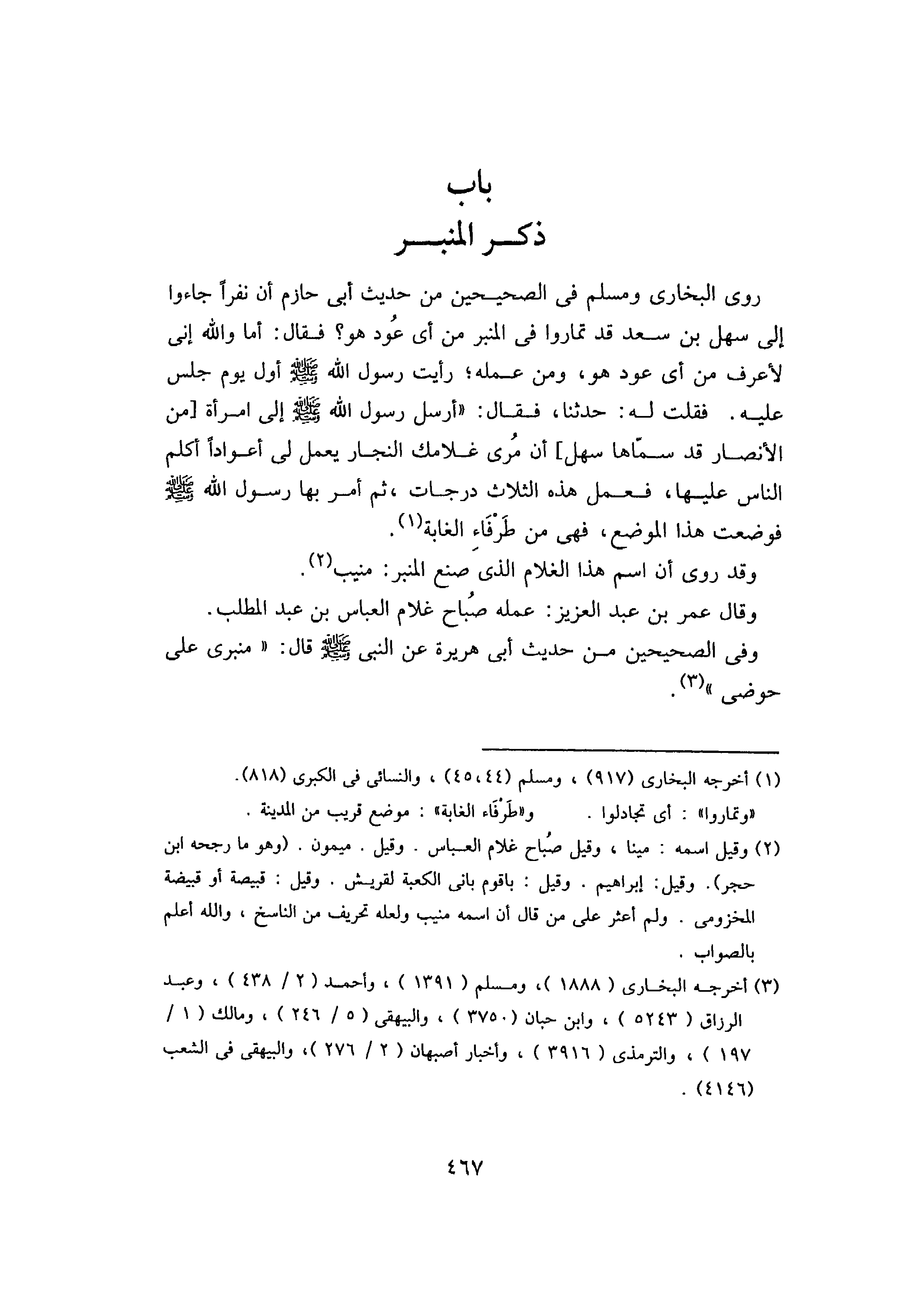 رَوَى الْبُخَارِيُّ، وَمُسْلِمٌ فِي الصَّحِيحَيْنِ، مِنْ حَدِيثِ أَبِي حَازِمٍ، أَنَّ نَفَرًا جَاءُوا إِلَى سَهْلِ بْنِ سَعْدٍ قَدْ تَمَارَوْا فِي الْمِنْبَرِ مِنْ أَيِّ عُودٍ هُوَ؟ فَقَالَ: أَمَا وَاللَّهِ إِنِّي لأَعْرِفُ مَنْ أَيِّ عُودٍ هُوَ، وَمَنْ عَمِلَهُ، رَأَيْتُ رَسُولَ اللَّهِ صَلَّى اللَّهُ عَلَيْهِ وَسَلَّمَ أَوَّلَ يَوْمٍ جَلَسَ عَلَيْهِ.