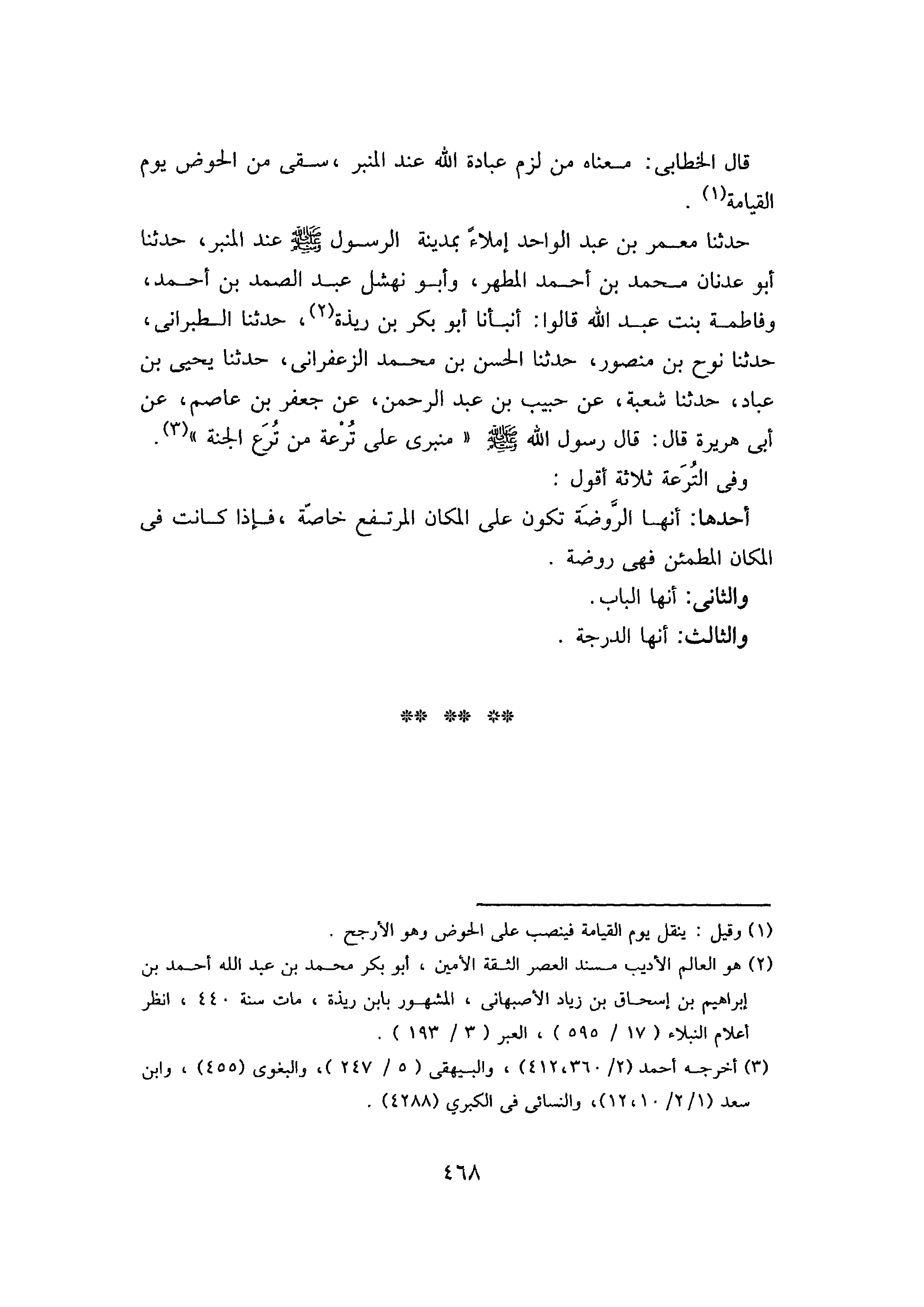 حَدَّثَنَا مَعْمَرُ بْنُ عَبْدِ الْوَاحِدِ، إِمْلاءً بِمَدِينَةِ الرَّسُولِ صَلَّى اللَّهُ عَلَيْهِ وَسَلَّمَ عِنْدَ الْمِنْبَرِ، حَدَّثَنَا أَبُو عَدْنَانَ مُحَمَّدُ بْنُ أَحْمَدَ الْمُطَهَّرُ، وَأَبُو نَهْشَلٍ عَبْدُ الصَّمَدِ بْنُ أَحْمَدَ، وَفَاطِمَةُ بِنْتُ عَبْدِ اللَّهِ، قَالُوا: أَنْبَأنَا أَبُو بَكْرِ بْنُ رَيْذَةَ، حَدَّثَنَا الطَّبَرَانِيُّ، حَدَّثَنَا نُوحُ بْنُ مَنْصُورٍ، حَدَّثَنَا الْحَسَنُ بْنُ مُحَمَّدٍ الزَّعْفَرَانِيُّ، حَدَّثَنَا يَحْيَى بْنُ عَبَّادٍ، حَدَّثَنَا شُعْبَةُ، عَنْ حَبِيبِ بْنِ عَبْدِ الرَّحْمَنِ، عَنْ جَعْفَرِ بْنِ عَاصِمٍ، عَنْ أَبِي هُرَيْرَةَ، قَالَ: قَالَ رَسُولُ اللَّهِ صَلَّى اللَّهُ عَلَيْهِ وَسَلَّمَ: «مِنْبَرِي عَلَى تُرْعَةٍ مِنْ تُرَعِ الْجَنَّةِ» .