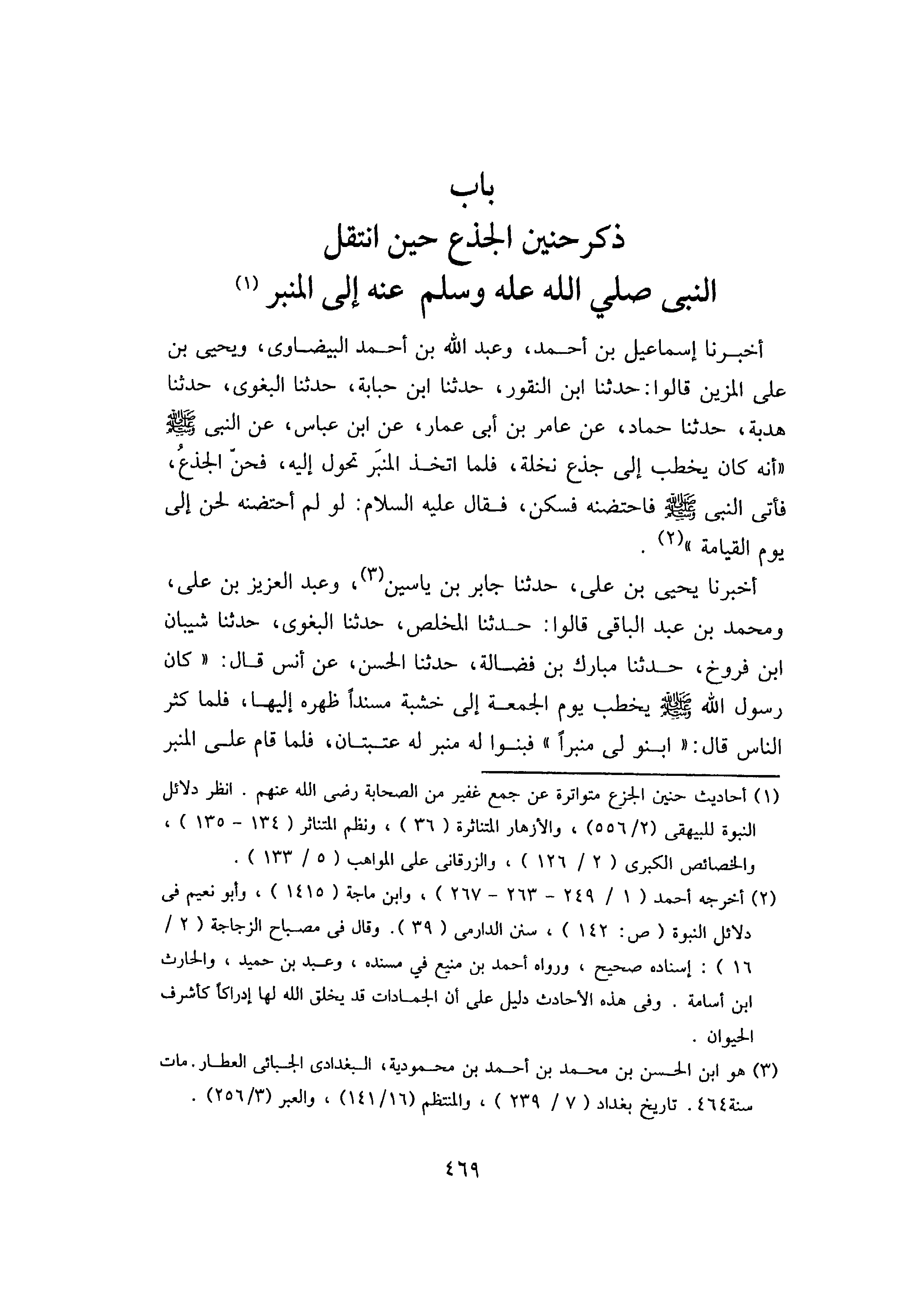 أَخْبَرَنَا إِسْمَاعِيلُ بْنُ أَحْمَدَ، وَعَبْدُ اللَّهِ بْنُ أَحْمَدَ الْبَيْضَاوِيُّ، وَيَحْيَى بْنُ عَلِيٍّ الْمُزَيِّنُ، قَالُوا: حَدَّثَنَا ابْنُ النّقورِ، حَدَّثَنَا ابْنُ حَبَابَةَ، حَدَّثَنَا الْبَغَوِيُّ، حَدَّثَنَا هُدْبَةُ، حَدَّثَنَا حَمَّادٌ، عَنْ عَامِرِ بْنِ أَبِي عَمَّارٍ، عَنِ ابْنِ عَبَّاسٍ، عَنِ النَّبِيِّ صَلَّى اللَّهُ عَلَيْهِ وَسَلَّمَ، " أَنَّهُ كَانَ يَخْطُبُ إِلَى جِذْعِ نَخْلَةٍ، فَلَمَّا اتَّخَذَ الْمِنْبَرَ تَحَوَّلَ إِلَيْهِ، فَحَنَّ الْجِذْعُ، فَأَتَى النَّبِيُّ صَلَّى اللَّهُ عَلَيْهِ وَسَلَّمَ فَاحْتَضَنَهُ فَسَكَنَ، فَقَالَ عَلَيْهِ السَّلامُ: لَوْ لَمْ أَحْتَضِنْهُ لَحَنَّ إِلَى يَوْمِ الْقِيَامَةِ "