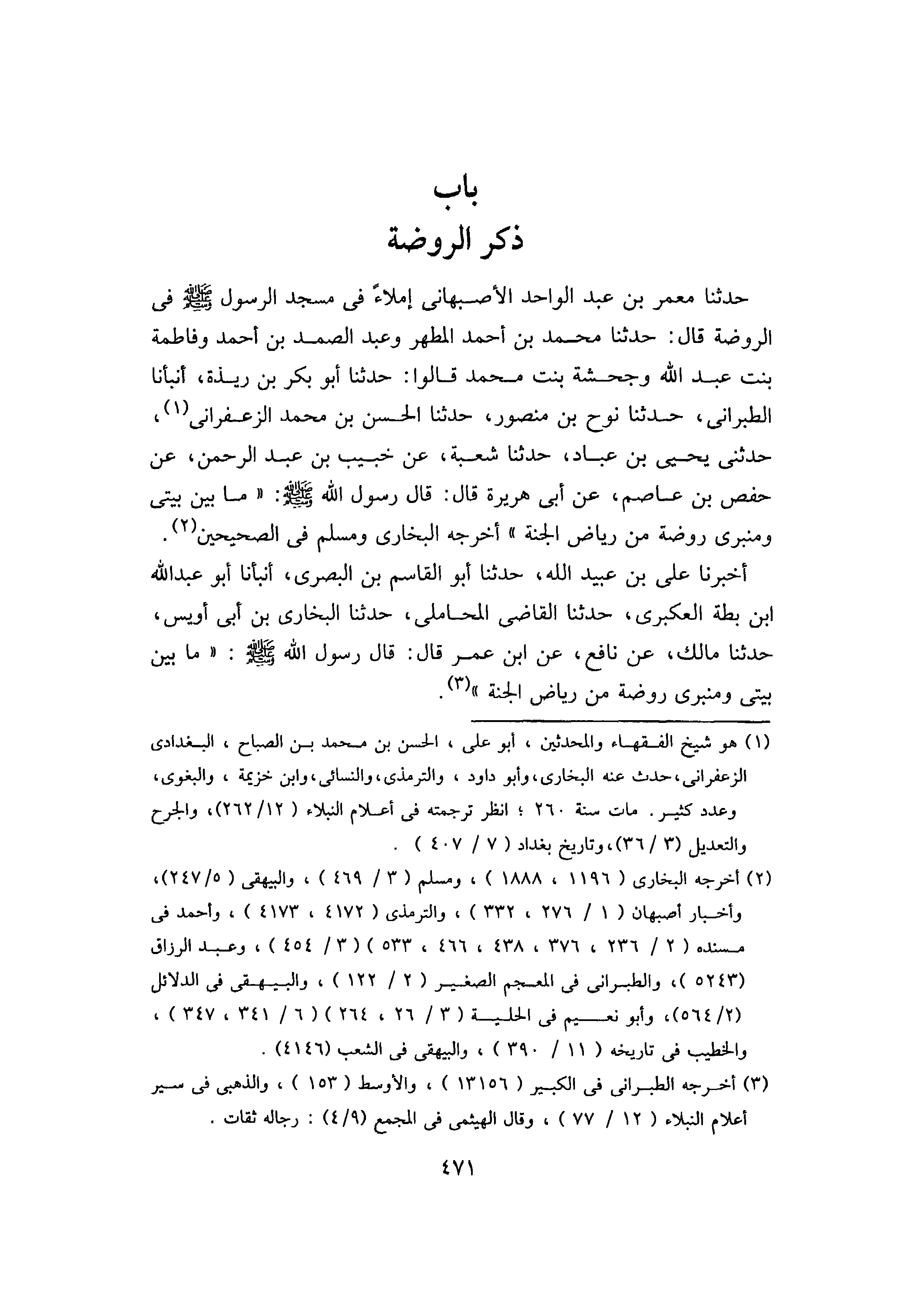 حَدَّثَنَا مَعْمَرُ بْنُ عَبْدِ الْوَاحِدِ الأَصْبَهَانِيُّ، إِمْلاءً، فِي مَسْجِدِ الرَّسُولِ صَلَّى اللَّهُ عَلَيْهِ وَسَلَّمَ فِي الرَّوْضَةِ، قَالَ: حَدَّثَنَا مُحَمَّدُ بْنُ أَحْمَدَ الْمُطَهَّرُ، وَعَبْدُ الصَّمَدِ بْنُ أَحْمَدَ، وَفَاطِمَةُ بِنْتُ عَبْدِ اللَّهِ، وَجَحْشَةُ بِنْتُ مُحَمَّدٍ، قَالُوا: حَدَّثَنَا أَبُو بَكْرِ بْنُ رَيْذَةَ، أَنْبَأنَا الطَّبَرَانِيُّ، حَدَّثَنَا نُوحُ بْنُ مَنْصُورٍ، حَدَّثَنَا الْحَسَنُ بْنُ مُحَمَّدٍ الزَّعْفَرَانِيُّ، حَدَّثَنِي يَحْيَى بْنُ عَبَّادٍ، حَدَّثَنَا شُعْبَةُ، عَنْ خَبِيبِ بْنِ عَبْدِ الرَّحْمَنِ، عَنْ حَفْصِ بْنِ عَاصَمٍ، عَنْ أَبِي هُرَيْرَةَ، قَالَ: قَالَ رَسُولُ اللَّهِ صَلَّى اللَّهُ عَلَيْهِ وَسَلَّمَ: «مَا بَيْنَ بَيْتِي وَمِنْبَرِي رَوْضَةٌ مِنْ رِيَاضِ الْجَنَّةِ» .