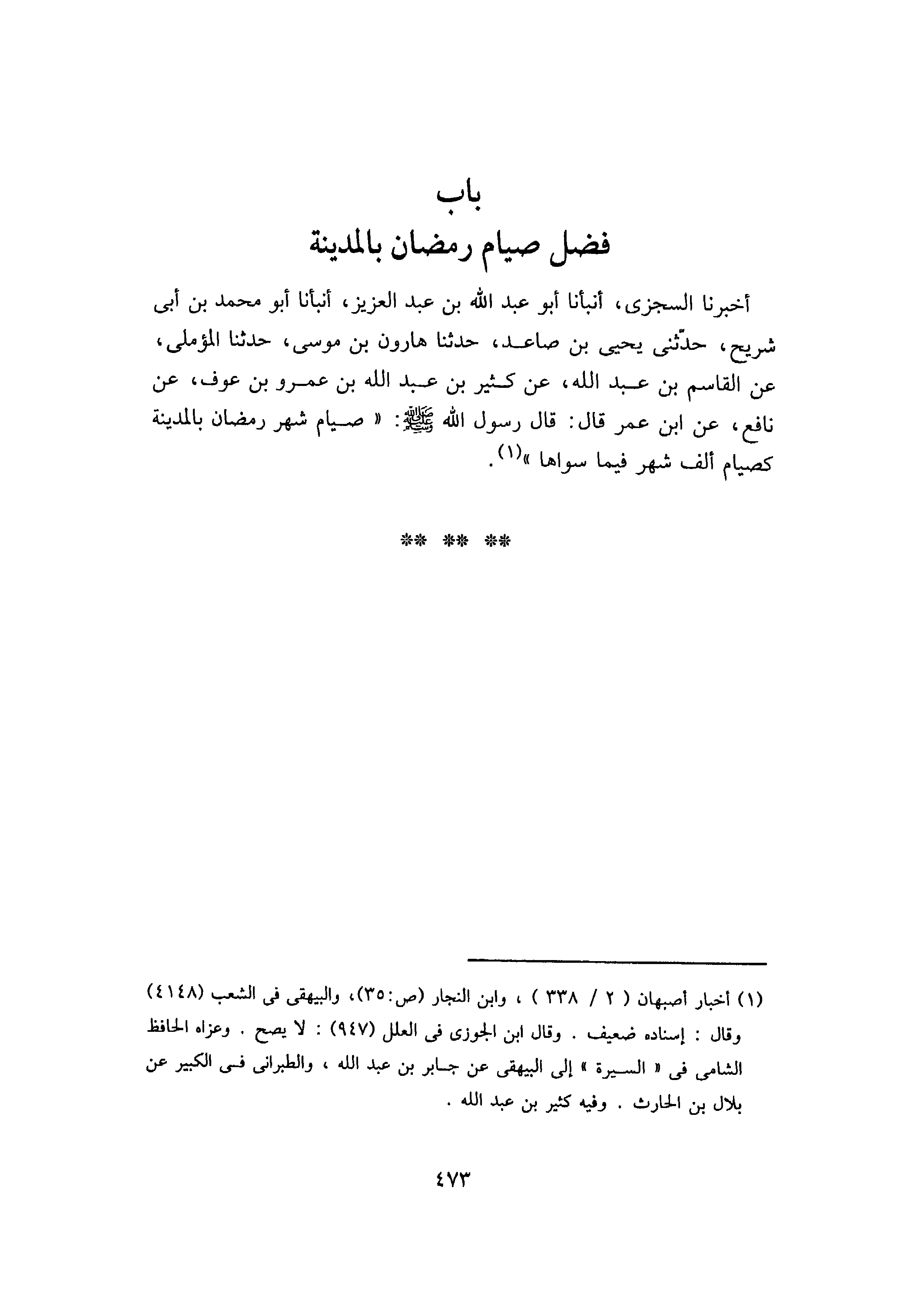 أَخْبَرَنَا السِّجْزِيُّ، أَنْبَأنَا أَبُو عَبْدِ اللَّهِ بْنُ عَبْدِ الْعَزِيزِ، أَنْبَأنَا أَبُو مُحَمَّدِ بْنِ أَبِي شُرَيْحٍ، حَدَّثَنِي يَحْيَى بْنُ صَاعِدٍ، حَدَّثَنَا هَارُونُ بْنُ مُوسَى، حَدَّثَنَا الْمُؤَمَّلِيُّ، عَنِ الْقَاسِمِ بْنِ عَبْدِ اللَّهِ، عَنْ كَثِيرِ بْنِ عَبْدِ اللَّهِ بْنِ عَمْرِو بْنِ عَوْفٍ، عَنْ نَافِعٍ، عَنِ ابْنِ عُمَرَ، قَالَ: قَالَ رَسُولُ اللَّهِ صَلَّى اللَّهُ عَلَيْهِ وَسَلَّمَ: «صِيَامُ شَهْرِ رَمَضَانَ بِالْمَدِينَةِ كَصِيَامِ أَلْفِ شَهْرٍ فِيمَا سِوَاهَا»