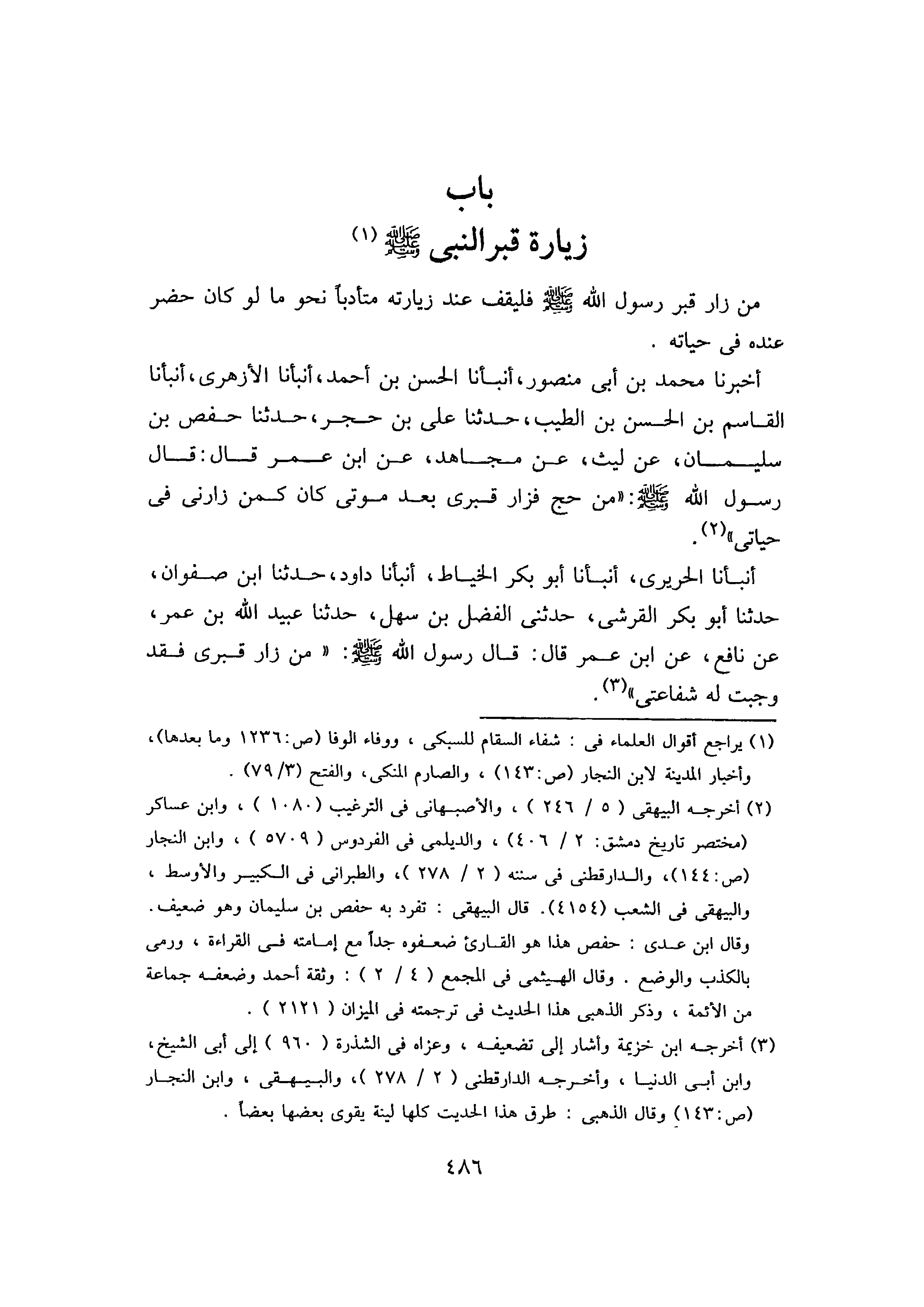 أَخْبَرَنَا مُحَمَّدُ بْنُ أَبِي مَنْصُورٍ، أَنْبَأنَا الْحَسَنُ بْنُ أَحْمَدَ، أَنْبَأنَا الأَزْهَرِيُّ، أَنْبَأنَا الْقَاسِمُ بْنُ الْحَسَنِ بْنِ الطَّيِّبِ، حَدَّثَنَا عَلِيُّ بْنُ حَجَرٍ، حَدَّثَنَا حَفْصُ بْنُ سُلَيْمَانَ، عَنْ لَيْثٍ، عَنْ مُجَاهِدٍ، عَنِ ابْنِ عُمَرَ، قَالَ: قَالَ رَسُولُ اللَّهِ صَلَّى اللَّهُ عَلَيْهِ وَسَلَّمَ: «مَنْ حَجَّ فَزَارَ قَبْرِي بَعْدَ مَوْتِي كَانَ كَمَنْ زَارَنِي فِي حَيَاتِي»