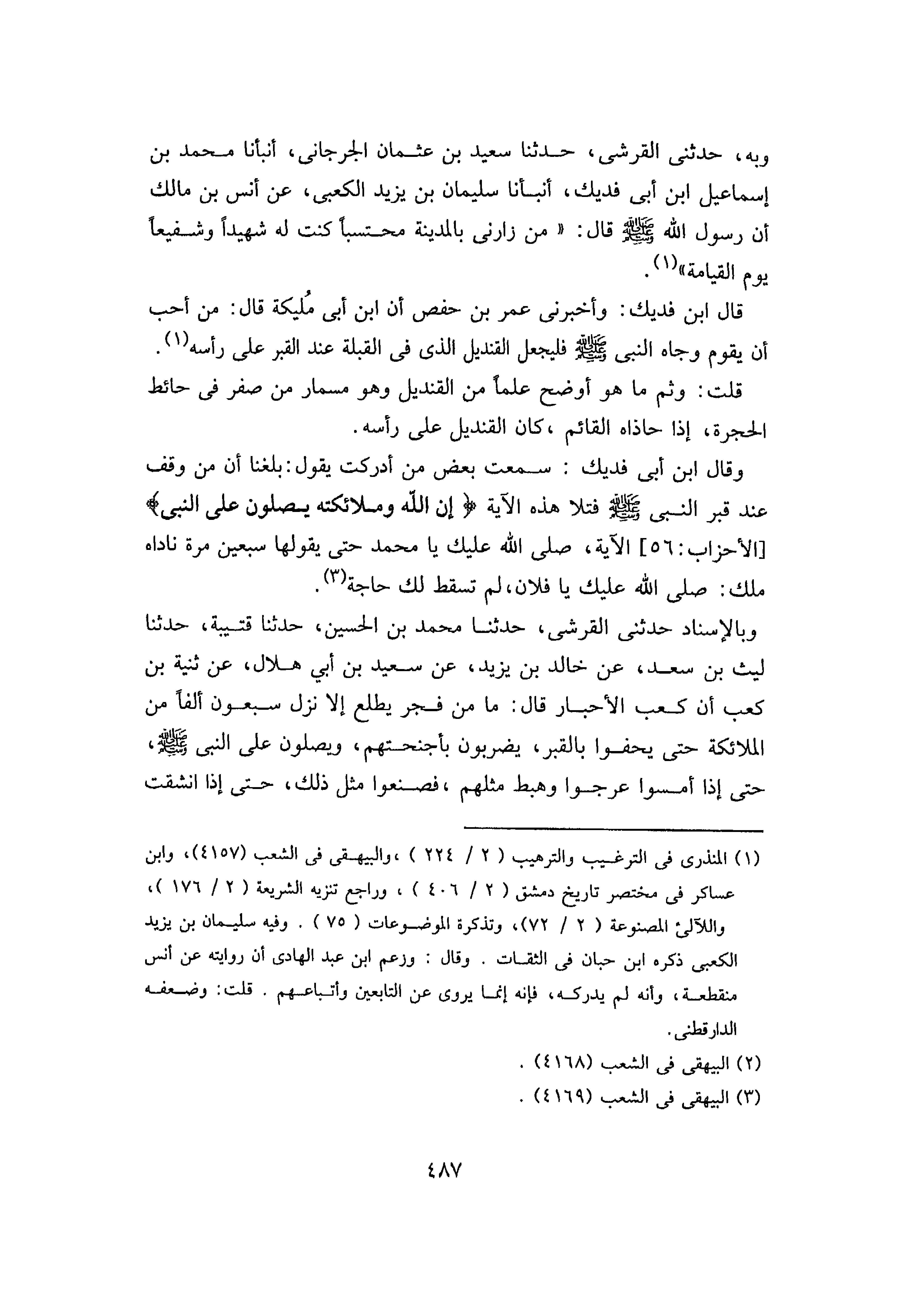 وَبِهِ، حَدَّثَنِي الْقُرَشِيُّ، حَدَّثَنَا سَعِيدُ بْنُ عُثْمَانَ الْجُرْجَانِيُّ، أَنْبَأنَا مُحَمَّدُ بْنُ إِسْمَاعِيلَ بْنِ أَبِي فُدَيْكٍ، أَنْبَأَنَا سُلَيْمَانُ بْنُ يَزِيدَ الْكَعْبِيُّ، عَنْ أَنَسِ بْنِ مَالِكٍ، أَنّ رَسُول اللَّهِ صَلَّى اللَّهُ عَلَيْهِ وَسَلَّمَ، قَالَ: «مَنْ زَارَنِي بِالْمَدِينَةِ مُحْتَسِبًا كُنْتُ لَهُ شَهِيدًا وَشِفِيعًا يَوْمَ الْقِيَامَةِ»